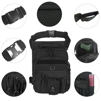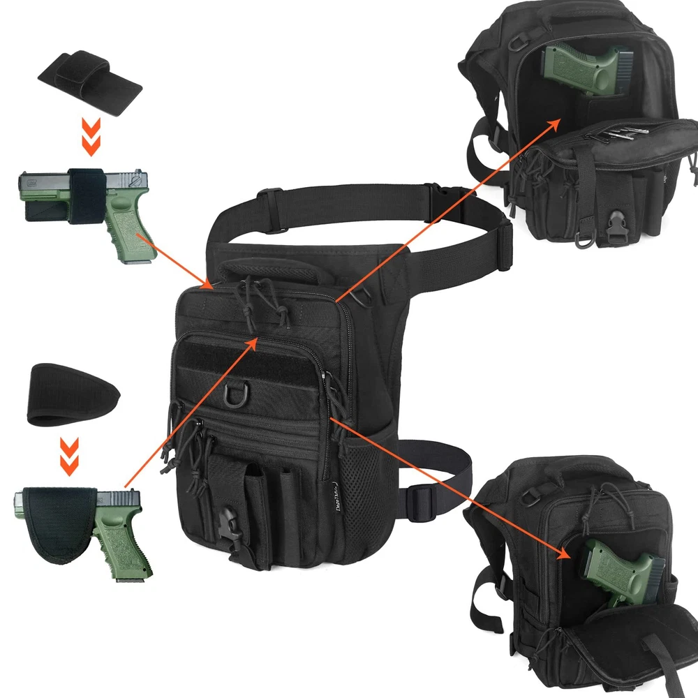 【Durable Material】: men’s dual pistol holster drop leg bag is made of high quality 1200D high density and heavy duty polyester cloth, ABS Zippers with durable polyester lining, which is lightweight but very durable, Just like nanomaterials, the smaller the denser, the lighter the weight and the stronger the toughness. Double zippers closure make the dual pistol holster messenger bag more luxury, security,easy to access. 【MULTI-PURPOSE TACTICAL LEG BAG】: The dual holsters thigh bag can be used as message bag , waist bag, handbag, Great for indoor and outdoor uses including camping, hiking, hunting, sports events, school supplies, tools, Etc. Good choice for a gift; There are 10 pockets, enough for carrying digital camera, Mini Pad, tactical flashlights, cell , wallet, power bank, sunglasses, keys and other small gadgets, emergency first aid items, etc. 【Wide&Relastic Strap and Pad】: Wide waist strap with 21"- 55" and detachable&relastic leg strap with 15’’-29” make it suit for different size people, and the big buckle on the waist straps make this leg drop bag easy to fasten and take off; Breathable sandwich pad protects your thigh from being hurt. Widened waist strap reduce the pressure. It would be a great idea to be treated as a cool motorcycle leg bag. 【Concealed Carry Bag CCW】: The tactical dula holster leg bag includes 2 universal holsters suitable for most of handguns. The two compartments can be equipped with both of the universal holsters, which are left and right ambidextrous hands and fit small subcompact, compact, and even full size pistols and revolvers, such as FORT line, Glock, Colt and other short-barreled weapons. 【Many Pockets and Nice Layout】: The main bag of the leg bag: 13"x9"x4.8" *(22.5*33*12CM), The vice bag: 9*7*1 inches, with a two zipper pockets(one is net mesh zipper pocket), in addition to four zipper pockets, one bucklez&relastic pocket for or radio, one side net pockets, one side molle system, one velcro sticker and one hook,one back zipper pocket, enough to accommodate EDC equipment. 【Versal Applicable Scenarios】: The double hand gun holsters leg bag can be used as an information bag or tactical, for the two pistol holsters are removable , which is ideal for outdoor, camping, hiking, hunting, mountaineering, cycling, military, military, tactical AirSoft paintball, travel, vacation, travel, WARGAME