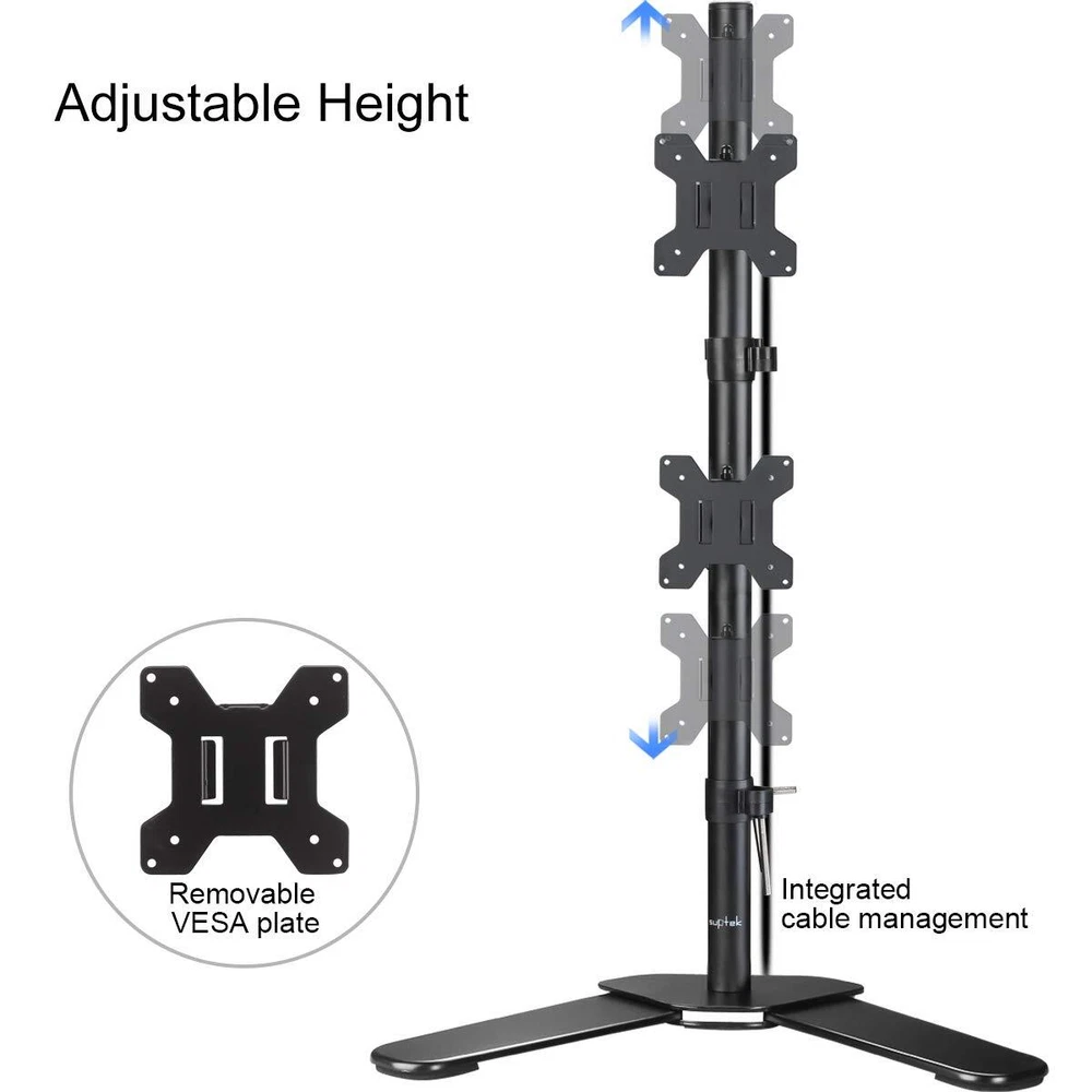 ML6802 is a high quality 2- plate full-motion desk mount/stand. How can I check if the mount fit my TV/monitor or no? Firstly, please check each weight of your display, each should be less than 10kg/22lbs. Secondly, if your Monitor or TV has 4 mounting holes on the back of the screen that are in the list of VESA compatibility blow, this bracket will fit. Why this mount can attract me to buy it? 1. With Cable Management to make your desktop clean. 2. Height adjustable within 31.5''(detailed dimension, see 6th picture). 3. Rotate the screen 360 degrees to face any direction in the room. The multi-directional design is also paired with a tilting motion for a 15 degree range. Tilt or pivot your screen for a wide array of potential ergonomic settings. 4. A more reasonable structure make it steady and easy installation Specifications: Fits Screens: 13''-27'' VESA Compatibility: 75x75 - 100x100mm Swivel: 180° Tilt: 15°up/down Construction: cold rolled steel construction Loading Capacity: up to 22lbs/10kg Height of the pole: 80cm/31.5'' & Support: 3-YEAR from date of the original purchase. If the damage or problem due to any manufacturing defect, please our after-sale service team by with your purchase order ID and details of the problem. Our support team will deal with your problem as soon as possible when we are at work. Compatibility - Dual monitor mount ideal for most screens up to 27" and 22lbs each with 75x75mm or 100x100mm backside mounting holes. Aticulation - Rotate 360°, tilt ±45° up and down, swivel ±45° left and right, extra tall height adjustment along the center pole. install options - Free standing base let you easily move your monitors to anywhere. Optional grommet base (fits desk up to 4" thickness) save your valuable desk space. Integrated cable management - Keeps your desk tidy and clean by organizing your power and AV cables in detachable cable holder. Easy installtion - Step-by-step user manual and organized hardware kit for hassle free mounting.