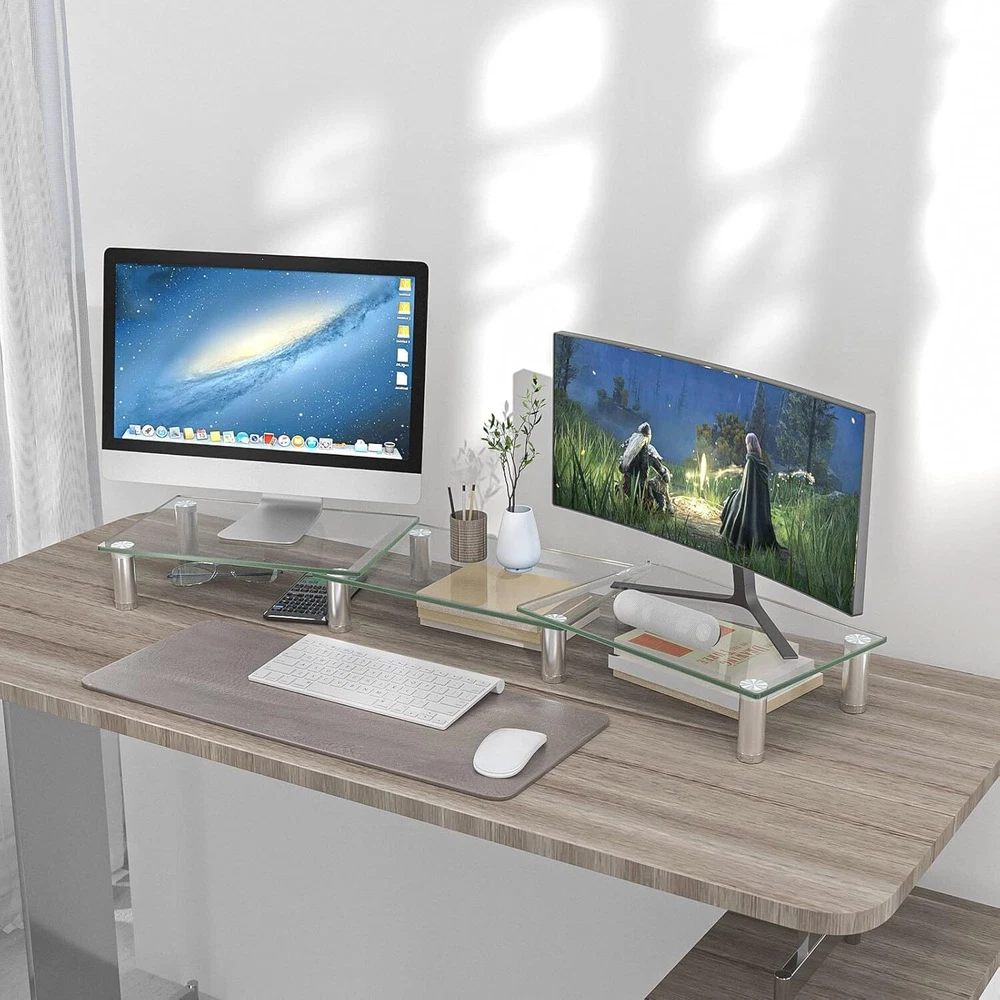 Product Description Dual Monitor Stand -Adjustable Length And Angle Dual Monitor Riser, Desktop Organizer For Pc, Computer, Laptop (Clear) Multi-Functional Monitor Stand: 2 Monitor, Tv Or Notebook Computer Is Elevated To A Proper Ergonomic Viewing Position, Creating Best Posture Which Helps Reduce Neck And Back Strain,Then Stow Laptop Underneath Monitor Riser For Space-Saving Storage Tilt Function: My Computer Monitor Riser Can Adjust Forward 0-15 Degree To Put The Computer Comfortable Position Height Adjustable: The Stainless Steel Leg Can Be Freely Adjustable Height From 3.4 Inch To 4.9 Inch Get A Tidy Working Space: Lift Your Monitors By The Desktop Shelf And Store Your Keyboard, Office Files, Notebook, Calculator Underneath It. Get Rid Of Messy Desk, Keeps Your Working Space Tidy Care Your Body: As A Ergonomic Monitor Riser Stand, It Could Raise Your Computer Monitor, Tablet Or Laptop To An And Keep Screen At Eye Level And Help You Keeping A Better Posture, Preventing Stress Cause By The Long Time Work About Us We are a reputable seller with many years of experience selling on eBay. Our goal is to provide high-quality products and excellent customer service. Shipping Items will be shipped within 1-3 business days when we received payment. (Orders are not processed on weekends & holidays) Tracking information will be sent once item is shipped. Delivery time depends on destination and other factors Item is shipped to ebay address. Leaving correct address can minimize delay. For international shipping and shipping to Guam, Hawaii and Alaska, Please contact us before placing the order. International buyers please note: Import duties, taxes and charges are not included in the item price or shipping charges. These charges are buyer’s responsibility. We will try our best to reduce the risk of the custom duties. Local pick-up is unavailable at the moment. Contact Us We reply any email messages within 1 business / working days(off-duty at weekend). If you do not get a response from us, then please check your junk or spam mailbox. Our Business hours: Mon-Fri 9:00-18:00, UTC/GMT +8 hours. Please contact us either by clicking "contact seller" in the "purchase history" section or simply click "ask a question" at the bottom of this page. If you are unsatisfied with our item or service, please contact us before leaving any feedback. We are committed to resolve all issues in a friendly and satisfactory manner.