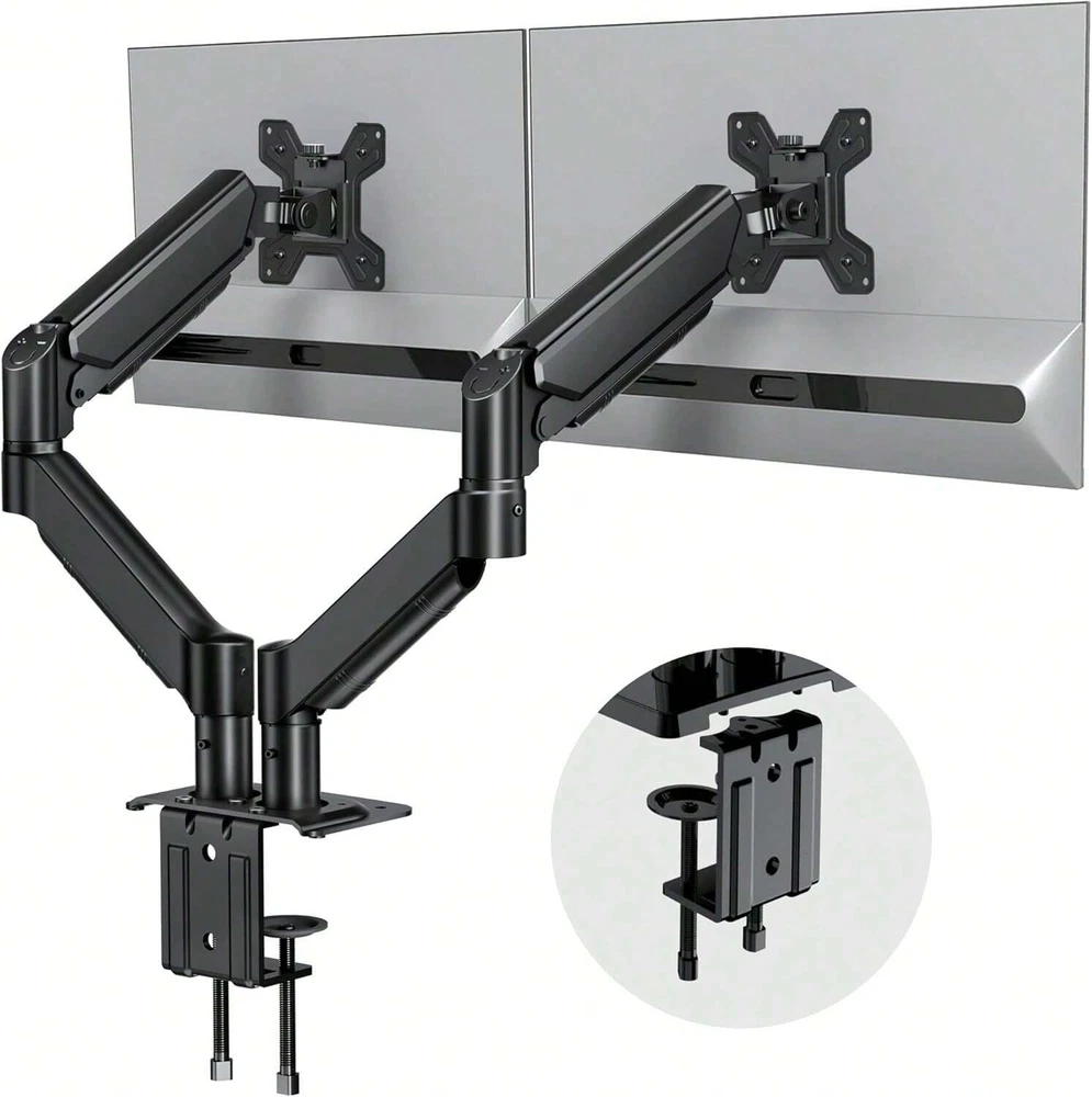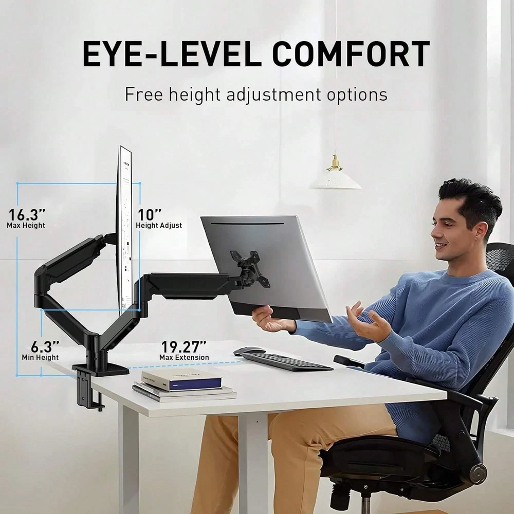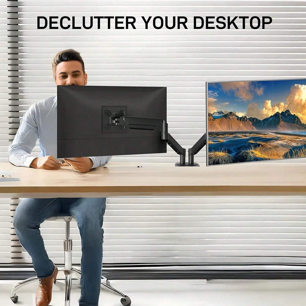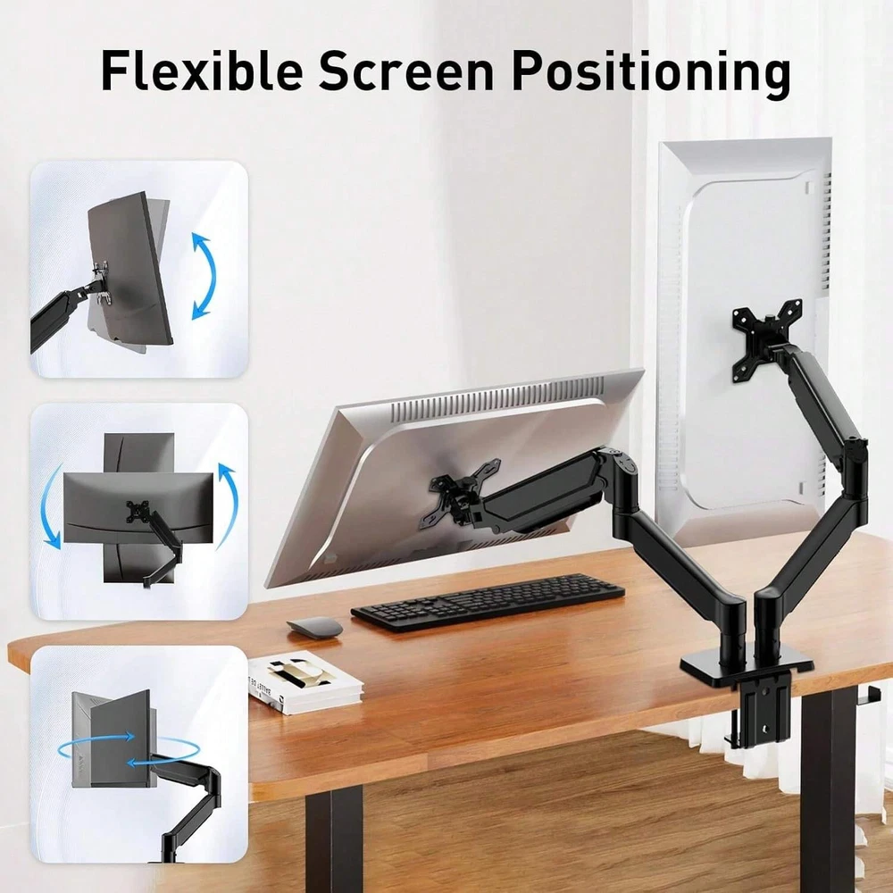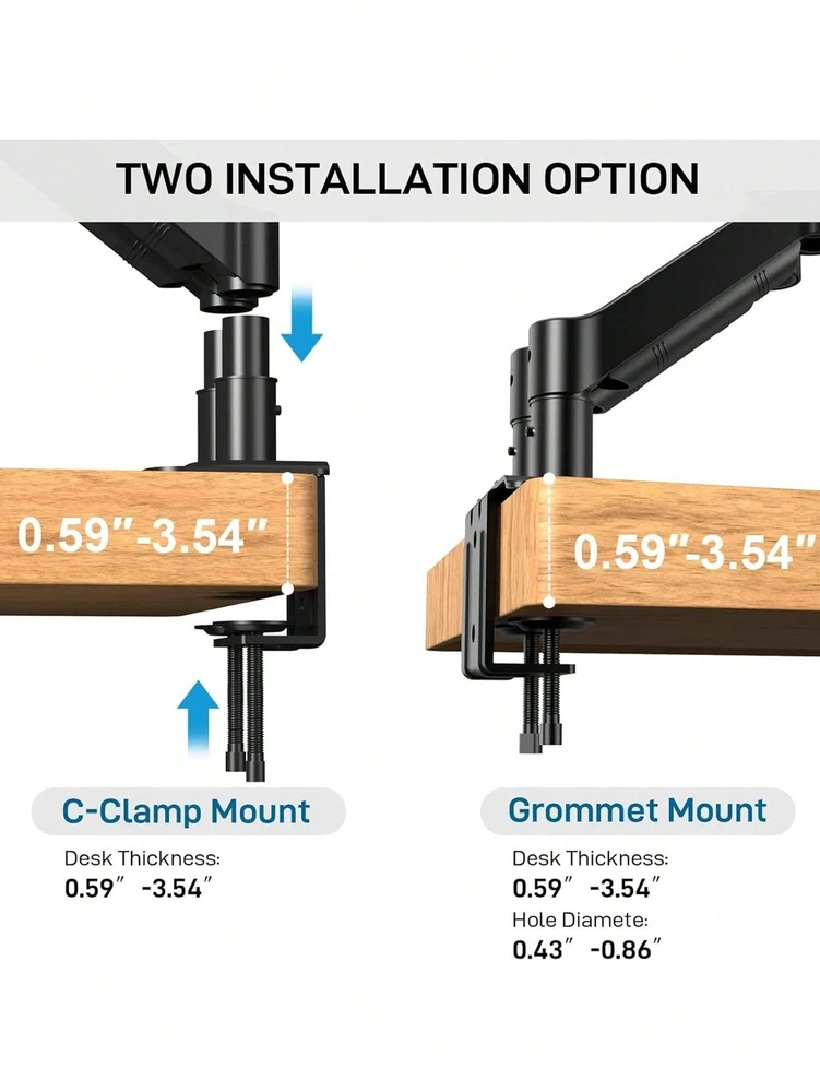 Dual Monitor Arm Compatibility: First, computer screen size range: 13 to 32 inches. Second, screen weight range for per arm: 4.4 to 19.8 lbs. Third, the back of the monitor screen must have VESA mounting holes with a pitch of 75x75mm or 100x100mm. Desk Compatibility: First, we only recommend wooden tables. Secondly, the bottom of the table should preferably be free of any beams or panels that may interfere with installation. Third, desk thickness range: 0.59" - 3.54". Articulation & Mechanical Spring Adjustment: Monitor stand for desk with perfect counterbalance presentation in all directions. Please Note: The back of the arms will extend past the edge of your desk. The mounting brackets offer 85° tilt, 180° swivel, and 360° rotation. Ergonomic Position:Our dual computer monitor stand raises monitors to eye level, improves posture, relieves strain on neck & shoulders while increasing productivity levels.Height adjustable, full motion design lets you work in a more comfortable ergonomic position. Clear Up Desk Space - Reclaim valuable desk space by elevating 2 screens and mounting this stand to any desktop up to 3.5" thick with the heavy-duty C-clamp or optional bolt-through grommet mount and desk accessories