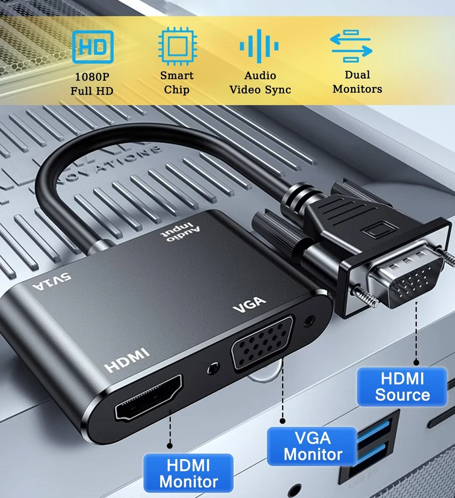 VGA to HDMI Adapter 2 in 1, VGA to HDMI+VGA Adapter Splitter for dual monitors, 2K60HZ Full HD Display Video Converter for PC/Laptop to Big Screen(Monitor/HDTV/Projector), Comatible with Mac OS, Windows, Linux 【VGA to HDMI+VGA Adapter】:Our 2-in-1 VGA to HDMI and VGA Adapter allows you to connect two external monitors at the same time via HDMI and VGA port for extending or mirroring, but if you using both ports simultaneously then the two monitors will only show the same contents. 【Full 1080P HD Resolution】: This VGA to HDMI +VGA splitter supports video & audio transmission from PC/Laptop to Monitor/HDTV/Projector without delay/lag. Both HDMI and VGA ports can achieve resolution up to 1920x1080P60HZ, The HDMI ports supports 2K HD (2560x1440@@60HZ). 【Plug & Play, Broad Compatibility】: This aluminium VGA adapter for monitors is very easy to use, just plug and play. Compatible with Windows, Mac OS, Linux and other systems. It's suitable for all PC and laptops with VGA port. 【With Auido & Power Port】: This product is equipped with a 3.5mm audio interface, which can connect audio devices such as speakers, amplifiers, headphones, etc. It supports PCM2.0 audio format and 2.1 channels, allowing you to experience a surround sound speaker. It also comes with a 5V/1A Micro USB power supply interface and is equipped with a power cord to avoid unstable image transmission caused by insufficient power supply. 【Durable and Portable】: Aluminum frosted shell, which has the advantages of anti-skid, wear-resistant, anti-scratch, etc. This VGA adapter is easy to carry on a business trip in your laptop bag. You can expand the computer screen to a large screen(Projector/Monitor) for presentation. It is super convenient for meetings and family entertainment. 【What Included in Package】: 1* VGA to HDMI+VGA adapter; 1* micro USB to USB charging cable; 1* 3.5mm to 3.5mm audio cable.