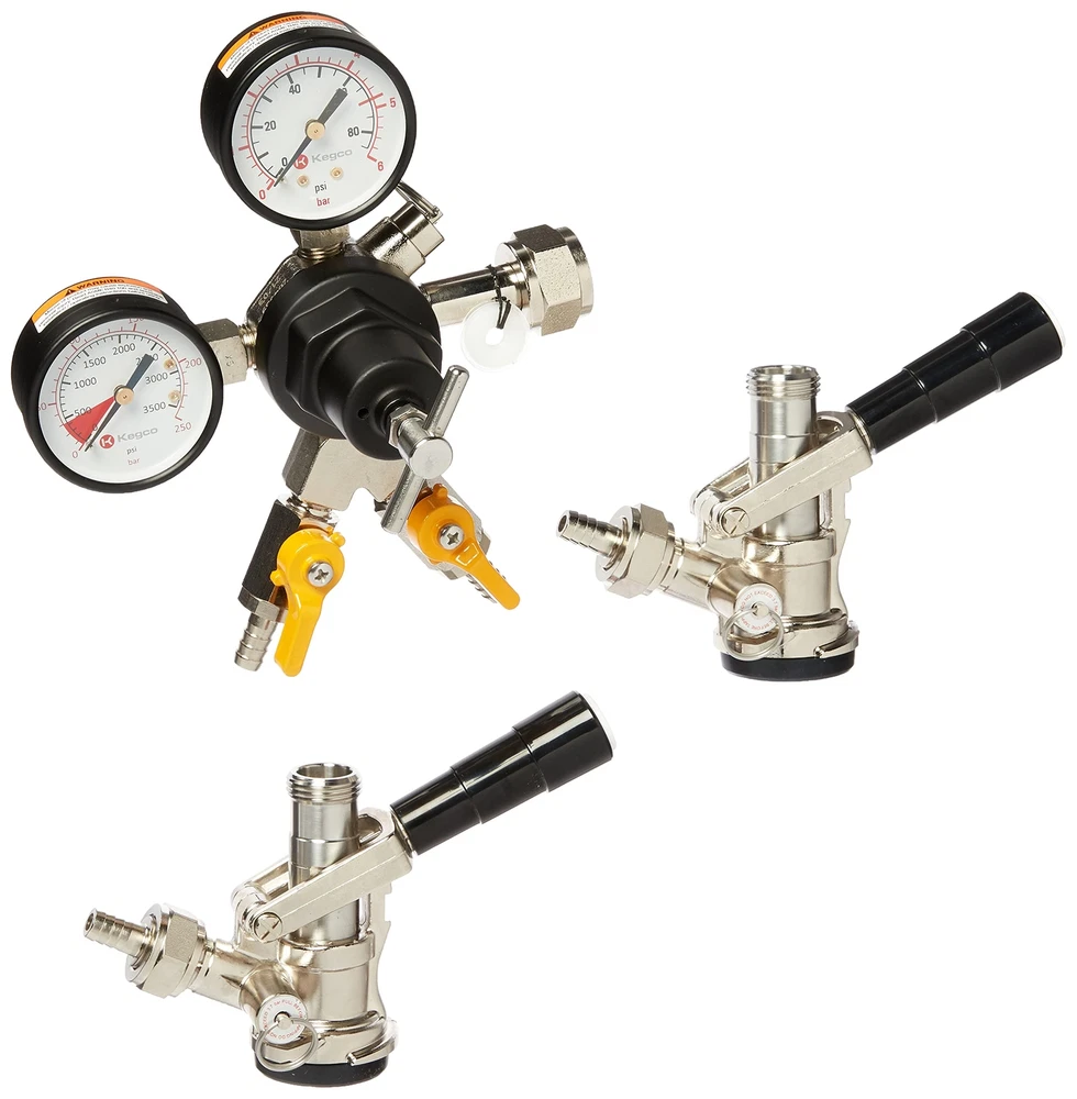 Dispense up to two kegs of delicious cold draft beer from your very own kegerator with 's Standard Dual Tap Tower Kegerator Conversion Kit! This kit comes with all of the high quality commercial-grade parts you'll need to successfully convert your refrigerator or freezer into a two product beer dispenser, including a dual gauge regulator for safe and easy CO2 management and durable lever handle American D system Sankey couplers with an easy-to-use design. Putting the finishing touches on your new DIY kegerator is a sleek 3" diameter double faucet chrome plated draft tower with two matching chrome plated faucets, which gives your kegerator a stylish look that is sure to impress your friends. This kit comes with an empty 5 lb. aluminum CO2 tank. Standard Dual Tap Tower Conversion Kit includes everything you need to convert a refrigerator or freezer into a dual tap keg dispenser two product dual gauge regulator displays both PSI and CO2 volume and features a large, easy-to-use adjustment knob NSF-approved KT85D-L "D" system keg couplers has a convenient lever handle design and is designed for use with all domestic brand American "D" system Sankey kegs 3" diameter air-cooled chrome-plated metal draft tower comes complete with two NSF-approved chrome-plated metal faucets, two faucet knobs, and two 5' lengths of 3/16" I.D. beer line Includes an empty 5 lb. aluminum CO2 tank made from high strength aluminum alloy, which is lighter than steel tanks and will not rust