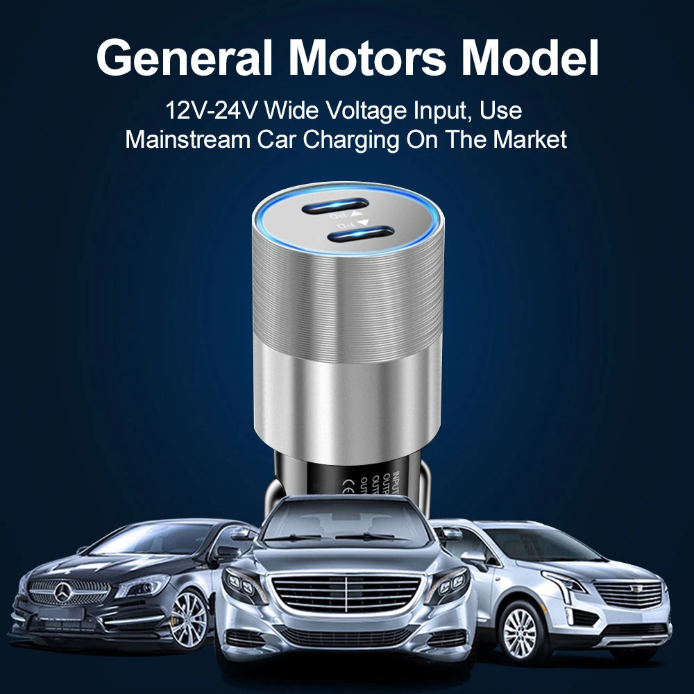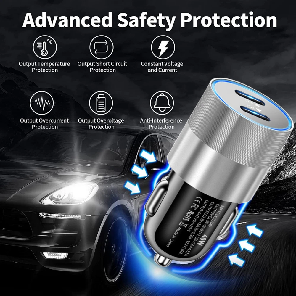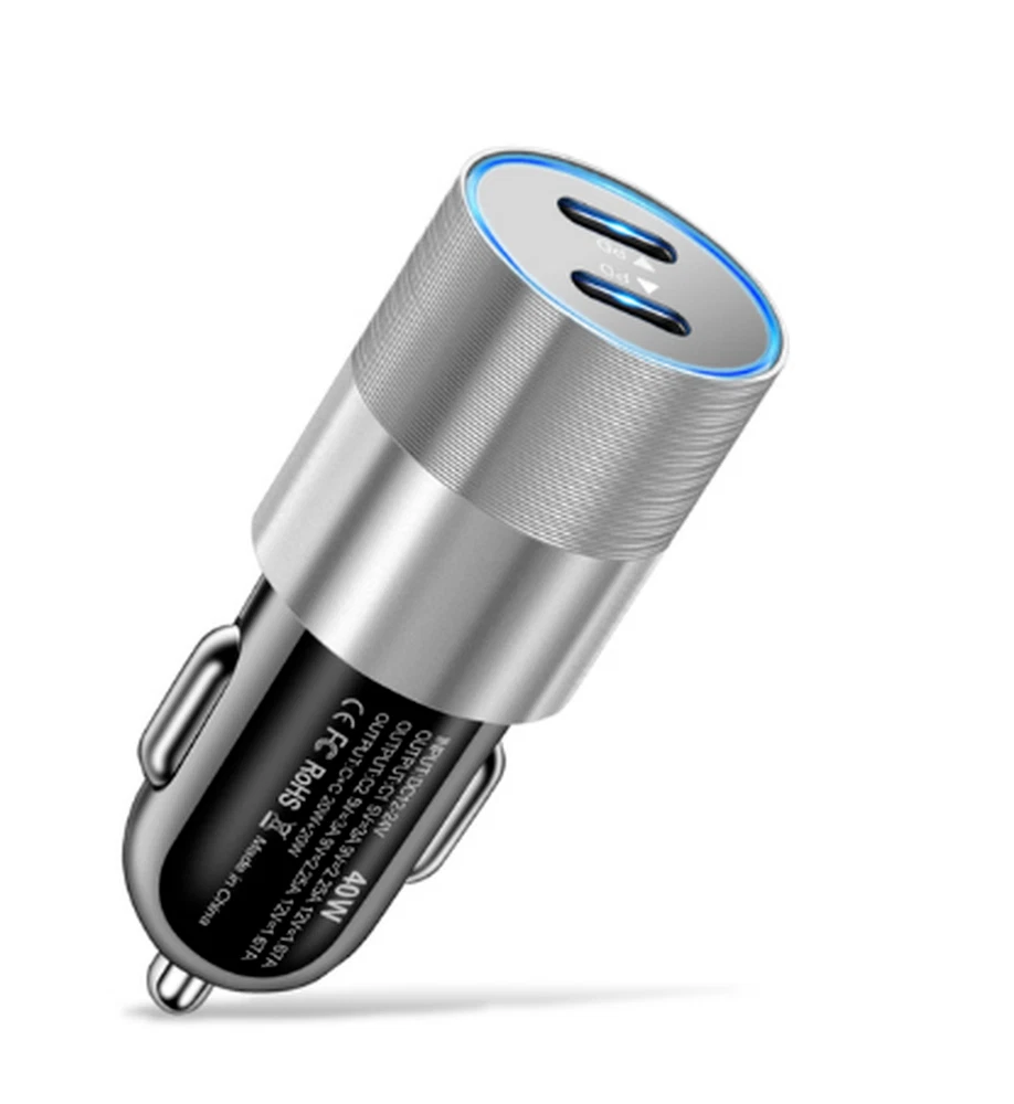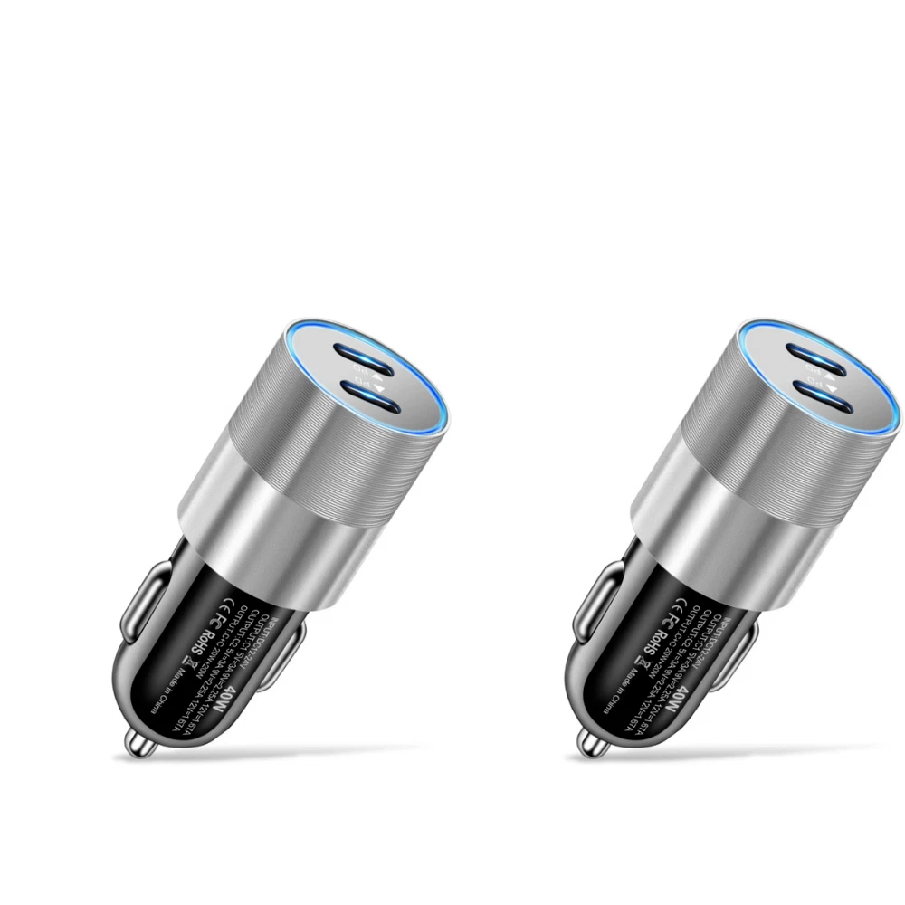 Product specification: Input : DC 12V-24V Output : C1 5V=3A 9V=2.25A 12V=1.67A Output : C2 5V=3A 9V=2.25A 12V=1.67A Output : C1+C2 20W+20W Dual ports fast charging: The on-board charger is equipped with 2 USB C ports, which can charge two devices at the same time.Can charge 50% of the iPhone 12 in about 30 minutes, 2.5 times faster than the standard charger. Safe and reliable: The aluminum alloy shell is easy to dissipate heat, better protect the chipset, anti scratch and long service life. The intelligent circuit design of USB car charger can prevent short circuit, overheating, overcurrent and overcharge. Unique design: You can know the charging status through the LED indicator and help to unplug the USB cable, or unplug the car adapter from the cigarette lighter at night. Portable design: The compact and lightweight design takes up almost no space and can be easily carried anywhere. Plug and charge,suitable for daily use or travel. Universal compatibility: For iPhone 8/8 Plus For iPhone X/XR For iPhone XS/XS Max For iPhone 11/11 Pro/11 Pro Max For iPhone 12 Mini/12/12 Pro/12 Pro Max For iPhone 13 Mini/13/13 Pro/13 Pro Max For iPhone 14/14 Plus/14 Pro/14 Pro Max For iPhone SE(2020)/SE(2022) For iPad 4/5/6/7/8/9 For iPad Mini 1/2/3/4/5/6 For iPad Air 1/2/3/4 For iPad Pro For Macbook Air/Macbook Pro For other USB C devices,such as for Samsung/for Google/for Huawei/for Xiaomi/for HTC/for LG,etc.