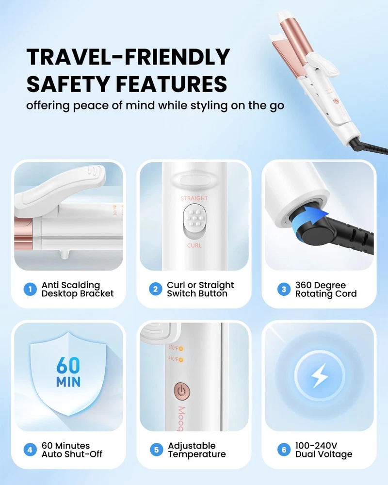 Dual Voltage Curling Iron, Travel Flat Iron Hair Curler in One for European, 1 1/4 Inch Ceramic Plates with Adjustable Temperature, White Travel-Friendly 2 in 1 Design: Space-saving and versatile. Eliminate the need to pack multiple styling tools that lets you effortlessly switch between curly and straight hairstyles. Perfect for travelers looking to minimize their packing without compromising style. NOTICE: Press and hold for three seconds to turn on. Universal Dual Voltage for Global Use: Designed for the international traveler, this curling iron features 100-240V dual voltage. Designed to adapt automatically to the local voltage in Europe and beyond, it eliminates the need for a transformer, ensuring you can achieve your perfect hairstyle anywhere in the world. Adjustable Temperature Settings: With two heat settings, 360°F for delicate noraml hair and 410°F for thicker coarse locks, it caters to all hair types. This allows for personalized styling that protects your hair from heat damage, ensuring healthy-looking results. Rapid Heating Technology: Achieve your desired look in no time with our fast-heating PTC technology. The ceramic coating ensures even heat distribution, reducing styling time and minimizing hair damage for quicker, more effective styling sessions. Travel-Friendly Safety Features: Features include 60mins auto shut-off, a tangle-free swivel cord, a lockable design for compact storage, and cooling tips, plus a heat-resistant glove. It's engineered for both safety and convenience, offering peace of mind while styling on the go.
