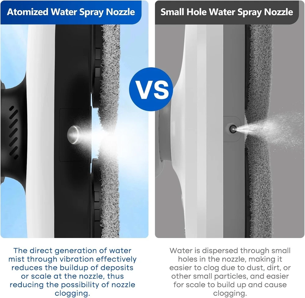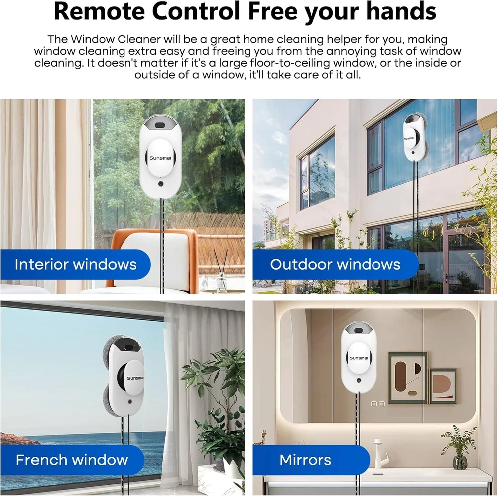 About this item Easy to clean: Say goodbye to the tediousness of traditional window cleaning, the automatic window cleaning robot is designed to be lightweight and easy to operate. Just one button start, you can enjoy the convenience of automatic cleaning Dual side water spray: Window cleaner robot with dual water spray will spray water in the forward direction, pre-moistening the stains, so that the cleaning is deeper and more thorough. Window glass cleaning machine upgraded with atomized nozzles that are not easily clogged 3 Intelligent Paths: The smart window cleaner robot has 3 intelligent cleaning paths that automatically detect window frames and obstacles and adjust the direction automatically. For heavily soiled areas of the glass, there is also the option to manually maneuver the robotic window cleaner for repeated cleaning Powerful suction & UPS: Vacuum motor technology gives the glass cleaning robot a powerful suction force of 2500pa-2800pa, which helps the window robot to adsorb onto the glass surface. The built-in UPS (Uninterruptible Power Supply) allows the window washer robot to remain on the glass for up to 30 minutes in the event of an accidental AC power failure Visual water tank: The window cleaner robot Sunsmai is equipped with a 50ml large-capacity water tank, which can complete the cleaning task of a large area at one time, without the need to repeatedly add water to improve the cleaning efficiency Washable cleaning cloths: For dirty windows, we offer 6 pairs of high-quality, interchangeable cleaning cloths that easily remove stubborn stains, while being easy to wash and replace to keep the window washing robot cleaning