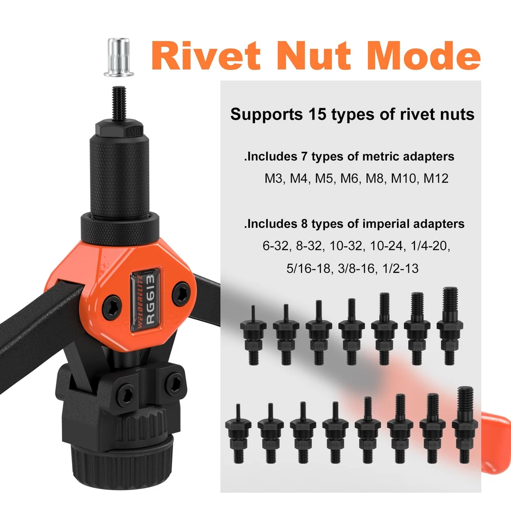 📦Dual-purpose rivet gun for riveting nails and nuts, with a length of 14 inches. 📦Includes 7 types of mandrels for rivet nuts (Metric sizes: M3, M4, M5, M6, M8, M10, M12). 📦Includes 8 types of mandrels for rivet nuts (Imperial sizes: 6-32, 8-32, 10-32, 10-24, 1/4-20, 5/16-18, 3/8-16, 1/2-13). 📦Includes 5 types of blind rivet nozzles for pulling rivets [ φ3.2 mm(1/8") , φ4.0 mm(5/32") , φ4.8 mm(3/16") , φ6.0 mm(15/64") , φ6.4 mm(1/4") ]. 📦Includes 7 types of metric nutserts (M3=30 pcs, M4=30 pcs, M5=30 pcs, M6=30 pcs, M8=30 pcs, M10=10 pcs, M12=10 pcs). 📦Includes 8 types of imperial nutserts (6-32=20 pcs, 8-32=20 pcs, 10-32=20 pcs, 10-24=20 pcs, 1/4-20=20 pcs, 5/16-18=20 pcs, 3/8-16=10 pcs, 1/2-13=5 pcs). 📦Includes 5 types of blind rivets [φ3.2 mm (1/8")=20 pcs, φ4.0 mm (5/32")=20 pcs, φ4.8 mm (3/16")=20 pcs, φ6.0 mm (15/64")=20 pcs, φ6.4 mm (1/4")=20 pcs].