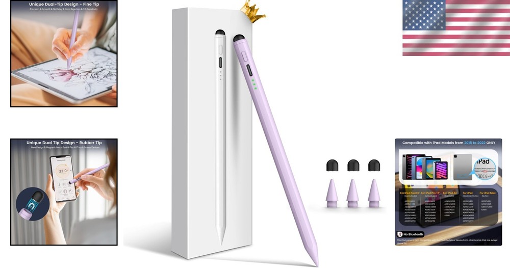 Features: Palm Rejection, Dual-Tip, Tilt Sensitivity, Quick Charge, Power Display, Magnetically Attachable Tip Battery Description: Lithium-ion Polymer Item Width: Stylus Pen for iPad Model: iPad Color: Purple gtin13: Does not apply UPC: Does not apply Are Batteries Included: Yes Item Length: Stylus Pen for iPad Batteries Required?: Yes Enclosure Material: Aluminum Type: Stylus Number Of Batteries: 1 Lithium Polymer Batteries Required. (included) Charging Time: 13 Minutes Compatible Model: Universal, For iPad 6th Generation, For iPad 7th Generation, For iPad 8th Generation, For iPad 9th Generation, For iPad 10th Generation, For iPad Pro 12.9" (3rd to 6th Generation), For iPad Air 3rd Generation, For iPad Air 4th Generation, For iPad Air 5th Generation, For iPad Mini 5th Generation, For iPad Mini 6th Generation Item Height: Stylus Pen for iPad Item Weight: 165 Grams Compatible Screen Size: iPad, 11 in, 12.9 in Are Batteries Required: Yes Battery Average Life Standby: 9 Hours Material: Aluminum Brand: Unbranded