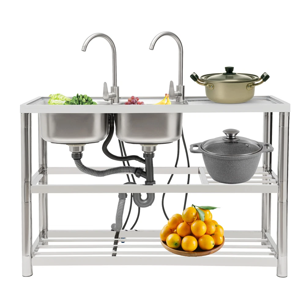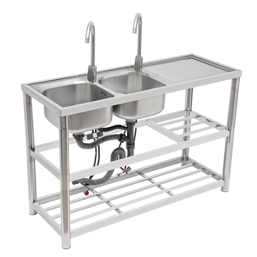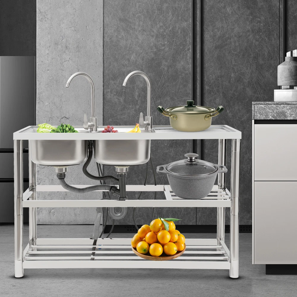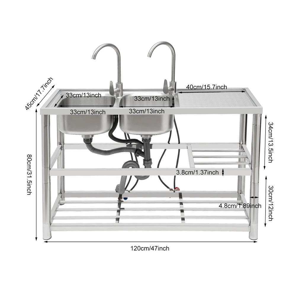 Package Included 1*Double-Bowl Sink 2*Faucets 4*Water Inlet Pipes 3*Drainage Pipes 1Pair* Gloves All Accessories for Assembly Dual-bowl Commercial Kitchen Sink Stainless Steel Restaurant Sink Free Standing Description This 201 stainless steel kitchen sink is sturdy and durable. Its modern and simple appearance can fit various decorations, suitable for kitchens, garages, labs, balconies, and so on. It has a solid rectangular structure and strong load-bearing capacity. The open countertop, roomy sink, utility drainage devices, inlet pipes, 360° rotatable faucets, and storage shelve make this product convenient to use. Key Features Sturdy and Durable : 201 Stainless steel material combined with exquisite wire drawing and polishing processes makes the sink resistant to rust and high temperatures, strong and durable. Strong Bearing Capacity : High-quality material, rectangular structure, and thickened square&round pipes make the countertop support up to 220.5 lbs and each shelf support up to 55.1 lbs, so you can rest assured to use it without worrying about collapsing. Convenient Faucets: The two 360° rotatable faucets with cold and hot water inlet pipes and handles for temperature/water flow adjustment allow you to wash at different angles and temperatures, meeting your various demands. User-friendly Design : The right height(31.5in) allows you to say goodbye to bending over to clean dishes. The enlarged drain opening ensures quick drainage to avoid long waiting or blocking. The basket with a lid can keep large residues flowing into the pipe, preventing the sewage pipe from being blocked while making it convenient for storing water. Plenty of Space: Two spacious sinks (13*13*7.1in) can accommodate large bowls or wash dishes, which can meet daily washing needs. The countertop has enough space for daily prepping or chopping. The lower shelves are very convenient for storing cookware, washing equipment, or other kitchen utensils. Complete Set: This complete sink kit includes 2 sinks, 2 faucets, 3 drain pipes, 2 drainage strainers, 4 water inlet pipes, and a series of complete accessories, so you do not need to purchase them separately while ensuring easy installation. Easy to Clean : The rounded corner is hard to hide dirt, together with the smooth surface and simple structure, you can rinse the sink with clean water. Protective Package : To prevent the product from being damaged during transportation, we packed it with foam to protect your products to the maximum extent possible. Customer Service : We aim to provide quality products and services. If you have any problems, please feel free to contact us. We will reply and solve the problem for you as soon as possible. Details Overflow Holes : The design of the high overflow holes prevents water from overflowing due to forgetting to turn off the faucet, and protects a dry floor. Raised Edges : The use of raised edges can significantly prevent overflow and maintain an elegant and streamlined appearance. Seal Ring : It ensures a tight connection and prevents leakage. Application It can be widely used in homes, kitchens, backyards, garages, balconies, laundry rooms, restaurants, hotels, cafes, and other indoor and outdoor places. Specifications Color: Silver Style: Modern Shape: Rectangular Material: 201 Stainless Steel, PVC Surface Treatment: Wire Drawing, Polishing Installation Type: Freestanding Assembly Required: Yes Number of Sinks: 2 Each Sink Size: 33*33*18cm/13*13*7.1in Product Size: 120*45*80cm/47*17.7*31.5in Countertop Length: 40cm/15.7in Tier Spacing: 34cm/13.5in; 30cm/12in Drainage Pipe Size (D* L): 42mm*65cm/1.65*25.59in Water Inlet Pipe Length: 80cm/31.5in Square Tube Thickness: 38mm/1.5in Round Tube Diameter: 48mm/1.89in Countertop Maximum Load Capacity: 100kg/220.5lbs Each Shelf Bearing Capacity: 25kg/55.1lbs Gross Weight: 13.6kg/30lbs Package Size: 125*49.5*33cm/49.2*19.5*13in Package Included 1*Double-Bowl Sink 2*Faucets 4*Water Inlet Pipes 3*Drainage Pipes 1Pair* Gloves All Accessories for Assembly Notes Please note the sinks of this product are on the left. Please check the size carefully before ordering. Please do not scratch its surface with sharp objects for a longer service life. Please allow the slight color difference caused by the shooting light and 1-3 cm error due to manual measurement, and make sure you do not mind before ordering. Payment Delivery details Terms of sales About us Contact us Payment We accept ebay payment 。 Fees such as import duties, taxes are not included in the item price or shipping costs. These charges are the buyer's responsibility. Delivery details Shipping: 2-9 working days to: USA Terms of sales We maintain high standards of excellence and strive for hundred percent customer satisfaction. Feedback is very important to us. We hope that you contact us immediately before you give neutral or negative feedback, so that we can address your concerns. It is impossible to address issues if we do not know about them! About us Your satis faction is our ultimate goal. We work hard to earn your trust and future business. Our certified technicians have tested each item before shipping. The unit comes with 1 year limited warranty on all manufacturing defects. a) If you receive a defective item, you may return it or ask for a discount. Please contact us within 14 days after you receive the package. b) What you returned must be intact and in its original packaging as re? u. Customer is responsible for shipping costs of the returned item. c) We will cover the cost of shipping back t with the shipping rate indicated in the registration page. We will send you a new unit or refund the full payment you paid. Thank you. Contact us Business Hour Business Hour: Monday To Friday: 8:30 AM to 5:00 PM (Beijing China time) Due to time zones, our reply to your questions may not be immediately. But within above working time, we will reply your email within 24 hours. If it's non-workdays, please kindly be patient and wait 