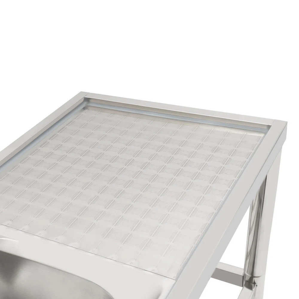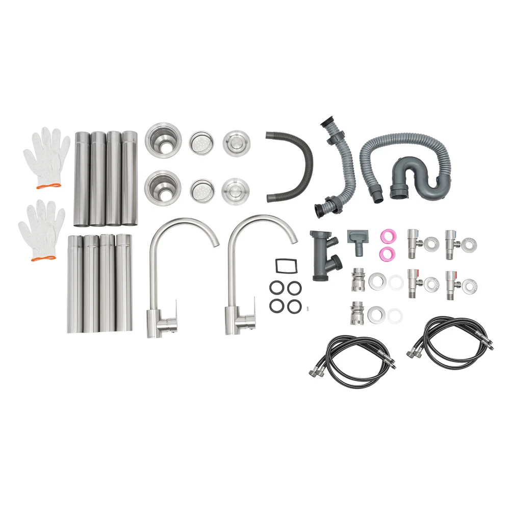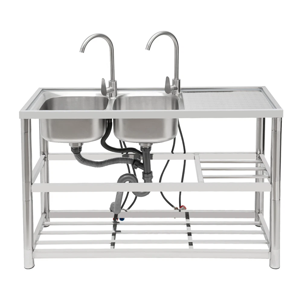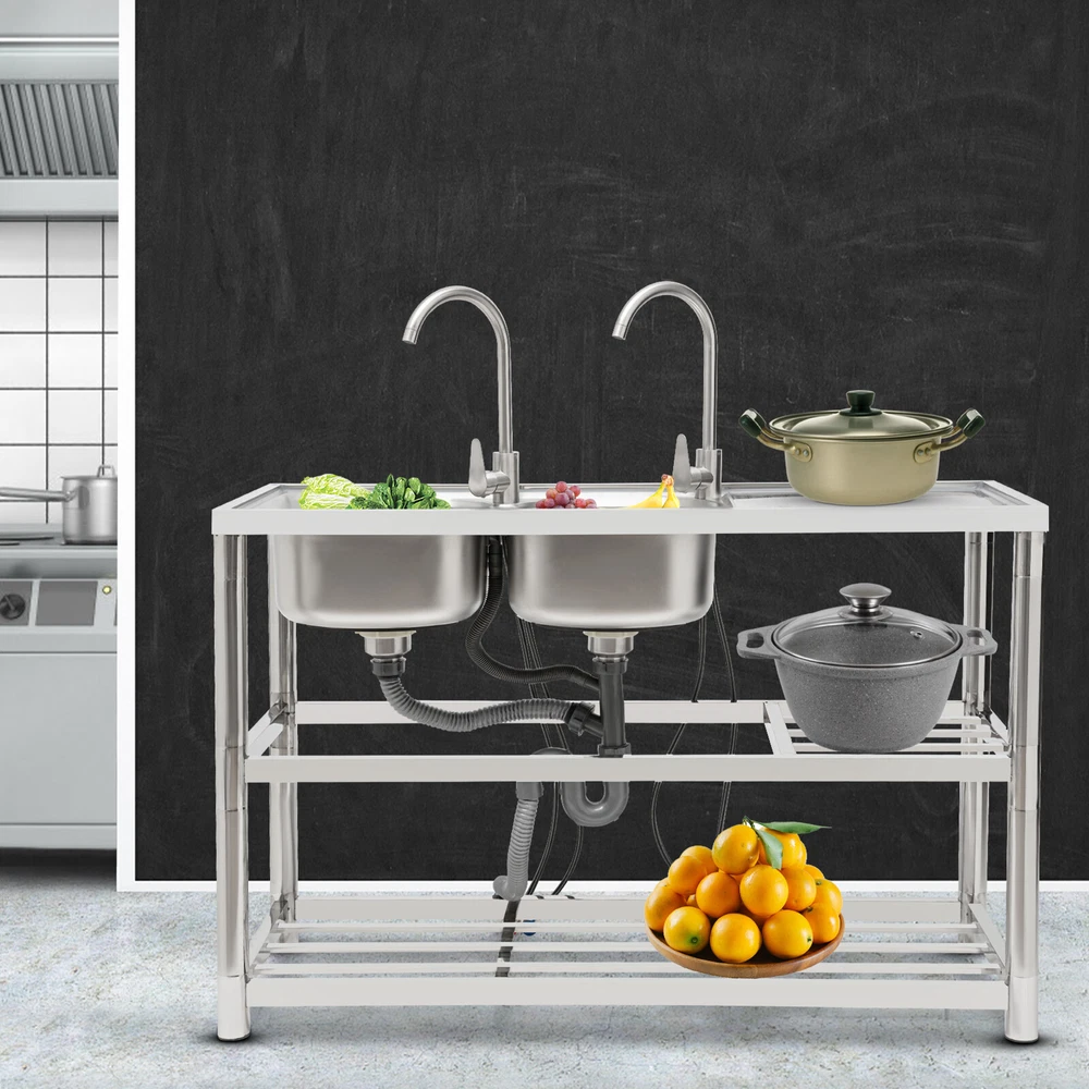 Package Included 1*Double-Bowl Sink 2*Faucets 4*Water Inlet Pipes 3*Drainage Pipes 1Pair* Gloves All Accessories for Assembly Dual-bowl Commercial Kitchen Sink Stainless Steel Restaurant Sink Free Standing Description This 201 stainless steel kitchen sink is sturdy and durable. Its modern and simple appearance can fit various decorations, suitable for kitchens, garages, labs, balconies, and so on. It has a solid rectangular structure and strong load-bearing capacity. The open countertop, roomy sink, utility drainage devices, inlet pipes, 360° rotatable faucets, and storage shelve make this product convenient to use. Key Features Sturdy and Durable : 201 Stainless steel material combined with exquisite wire drawing and polishing processes makes the sink resistant to rust and high temperatures, strong and durable. Strong Bearing Capacity : High-quality material, rectangular structure, and thickened square&round pipes make the countertop support up to 220.5 lbs and each shelf support up to 55.1 lbs, so you can rest assured to use it without worrying about collapsing. Convenient Faucets: The two 360° rotatable faucets with cold and hot water inlet pipes and handles for temperature/water flow adjustment allow you to wash at different angles and temperatures, meeting your various demands. User-friendly Design : The right height(31.5in) allows you to say goodbye to bending over to clean dishes. The enlarged drain opening ensures quick drainage to avoid long waiting or blocking. The basket with a lid can keep large residues flowing into the pipe, preventing the sewage pipe from being blocked while making it convenient for storing water. Plenty of Space: Two spacious sinks (13*13*7.1in) can accommodate large bowls or wash dishes, which can meet daily washing needs. The countertop has enough space for daily prepping or chopping. The lower shelves are very convenient for storing cookware, washing equipment, or other kitchen utensils. Complete Set: This complete sink kit includes 2 sinks, 2 faucets, 3 drain pipes, 2 drainage strainers, 4 water inlet pipes, and a series of complete accessories, so you do not need to purchase them separately while ensuring easy installation. Easy to Clean : The rounded corner is hard to hide dirt, together with the smooth surface and simple structure, you can rinse the sink with clean water. Protective Package : To prevent the product from being damaged during transportation, we packed it with foam to protect your products to the maximum extent possible. Customer Service : We aim to provide quality products and services. If you have any problems, please feel free to contact us. We will reply and solve the problem for you as soon as possible. Details Overflow Holes : The design of the high overflow holes prevents water from overflowing due to forgetting to turn off the faucet, and protects a dry floor. Raised Edges : The use of raised edges can significantly prevent overflow and maintain an elegant and streamlined appearance. Seal Ring : It ensures a tight connection and prevents leakage. Application It can be widely used in homes, kitchens, backyards, garages, balconies, laundry rooms, restaurants, hotels, cafes, and other indoor and outdoor places. Specifications Color: Silver Style: Modern Shape: Rectangular Material: 201 Stainless Steel, PVC Surface Treatment: Wire Drawing, Polishing Installation Type: Freestanding Assembly Required: Yes Number of Sinks: 2 Each Sink Size: 33*33*18cm/13*13*7.1in Product Size: 120*45*80cm/47*17.7*31.5in Countertop Length: 40cm/15.7in Tier Spacing: 34cm/13.5in; 30cm/12in Drainage Pipe Size (D* L): 42mm*65cm/1.65*25.59in Water Inlet Pipe Length: 80cm/31.5in Square Tube Thickness: 38mm/1.5in Round Tube Diameter: 48mm/1.89in Countertop Maximum Load Capacity: 100kg/220.5lbs Each Shelf Bearing Capacity: 25kg/55.1lbs Gross Weight: 13.6kg/30lbs Package Size: 125*49.5*33cm/49.2*19.5*13in Package Included 1*Double-Bowl Sink 2*Faucets 4*Water Inlet Pipes 3*Drainage Pipes 1Pair* Gloves All Accessories for Assembly Notes Please note the sinks of this product are on the left. Please check the size carefully before ordering. Please do not scratch its surface with sharp objects for a longer service life. Please allow the slight color difference caused by the shooting light and 1-3 cm error due to manual measurement, and make sure you do not mind before ordering. Payment Delivery details Terms of sales About us Contact us Payment We accept ebay payment 。 Fees such as import duties, taxes are not included in the item price or shipping costs. These charges are the buyer's responsibility. Delivery details Shipping: 2-9 working days to: USA Terms of sales We maintain high standards of excellence and strive for hundred percent customer satisfaction. Feedback is very important to us. We hope that you contact us immediately before you give neutral or negative feedback, so that we can address your concerns. It is impossible to address issues if we do not know about them! About us Your satis faction is our ultimate goal. We work hard to earn your trust and future business. Our certified technicians have tested each item before shipping. The unit comes with 1 year limited warranty on all manufacturing defects. a) If you receive a defective item, you may return it or ask for a discount. Please contact us within 14 days after you receive the package. b) What you returned must be intact and in its original packaging as re? u. Customer is responsible for shipping costs of the returned item. c) We will cover the cost of shipping back t with the shipping rate indicated in the registration page. We will send you a new unit or refund the full payment you paid. Thank you. Contact us Business Hour Business Hour: Monday To Friday: 8:30 AM to 5:00 PM (Beijing China time) Due to time zones, our reply to your questions may not be immediately. But within above working time, we will reply your email within 24 hours. If it's non-workdays, please kindly be patient and wait 
