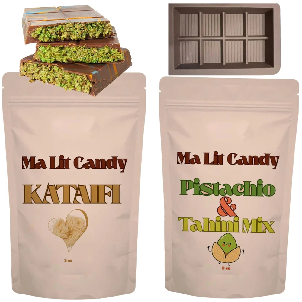 💰 Great Value for the Money: Enjoy a luxury Dubai Kunafeh chocolate-making experience with this kit that makes one generous 8 oz bar—just add your own chocolate! 🌰 Fresh & High-Quality Ingredients: Every kit is packed with fresh, premium ingredients to ensure amazing flavor in every bite. 🍫 Use Your Favorite Chocolate: Milk, dark, white, or flavored — customize it your way with any chocolate you love! 📖 Easy-to-Follow Recipe Included: No baking skills? No problem! Our clear, step-by-step instructions make it simple and fun for everyone. 🎁 Awesome Gift Idea: Makes a unique and thoughtful gift for chocolate lovers, foodies, or anyone who loves to try something new. 💤 Perfect for Any Occasion: Great for parties, sleepovers, family nights, game nights, or just a fun weekend activity. 🧑🍳 Fun for All Ages: Whether you're making it solo or with friends or kids, a Dubai Kunafeh Chocolate Bar Kit is an easy and enjoyable treat everyone will love. Create a delicious 8 oz Dubai Knafeh pistachio chocolate bar at home! This fun, easy-to-follow dubai chocolate bar kit by Ma Lit Candy comes with fresh ingredients, a simple recipe, a mold, and lets you use any chocolate you love. Perfect for gifting, parties, or a sweet night in — it’s great value and even better taste!