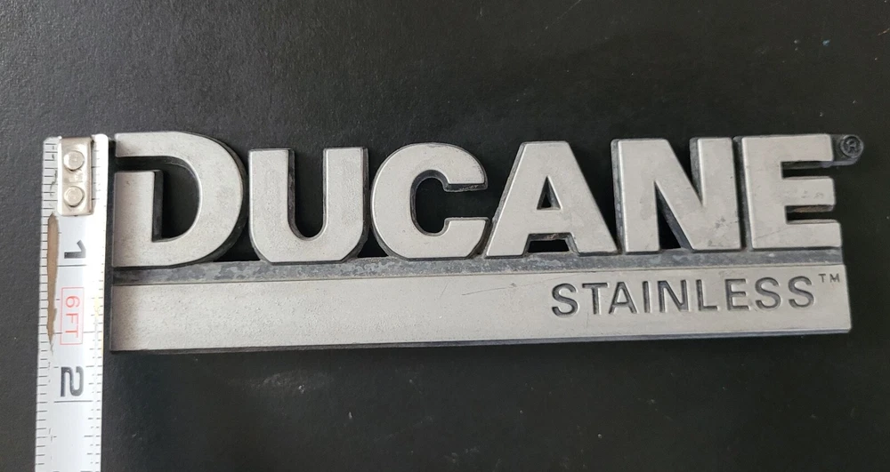 Ducane Stainless Logo Plate 5 3/4" for Grill Mancave Decor Add some personality to your mancave decor with this Ducane Stainless Logo Plate. Measuring at 5 3/4 inches, it's the perfect size to hang on a wall or use as a decorative piece on a shelf. This piece is in good condition and does not have chips. There is some scratches and discoloration of the silver. (see pictures for details) As a true fan of the Ducane brand, this logo plate is a must-have for any collector or enthusiast. It's a unique piece that's sure to catch the eye of anyone who enters your space. Don't miss out on the opportunity to add some flair to your mancave with this one-of-a-kind Ducane Stainless Logo Plate.