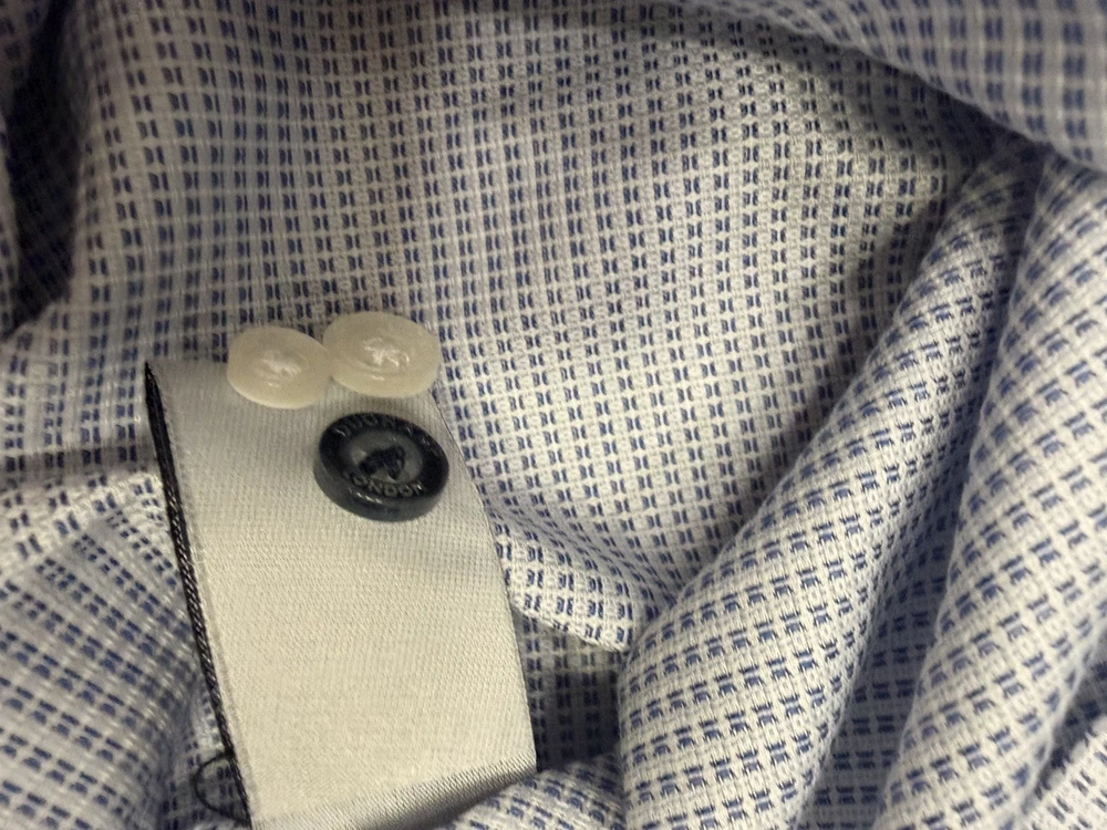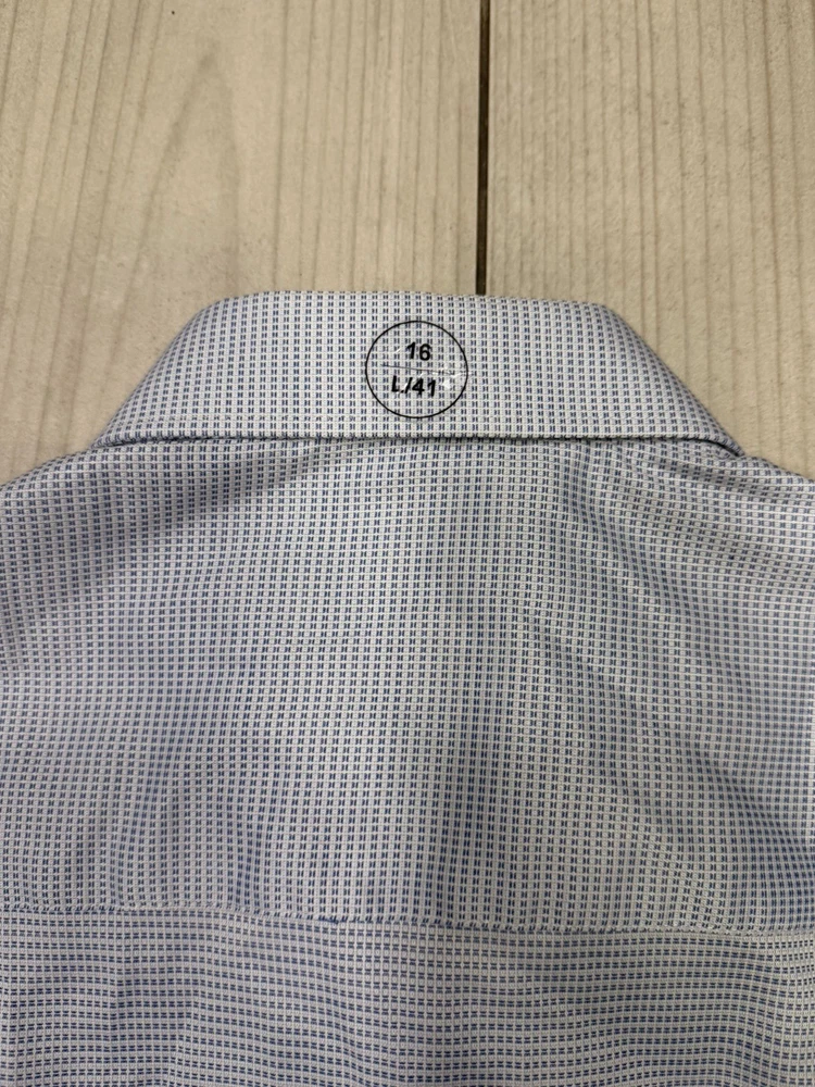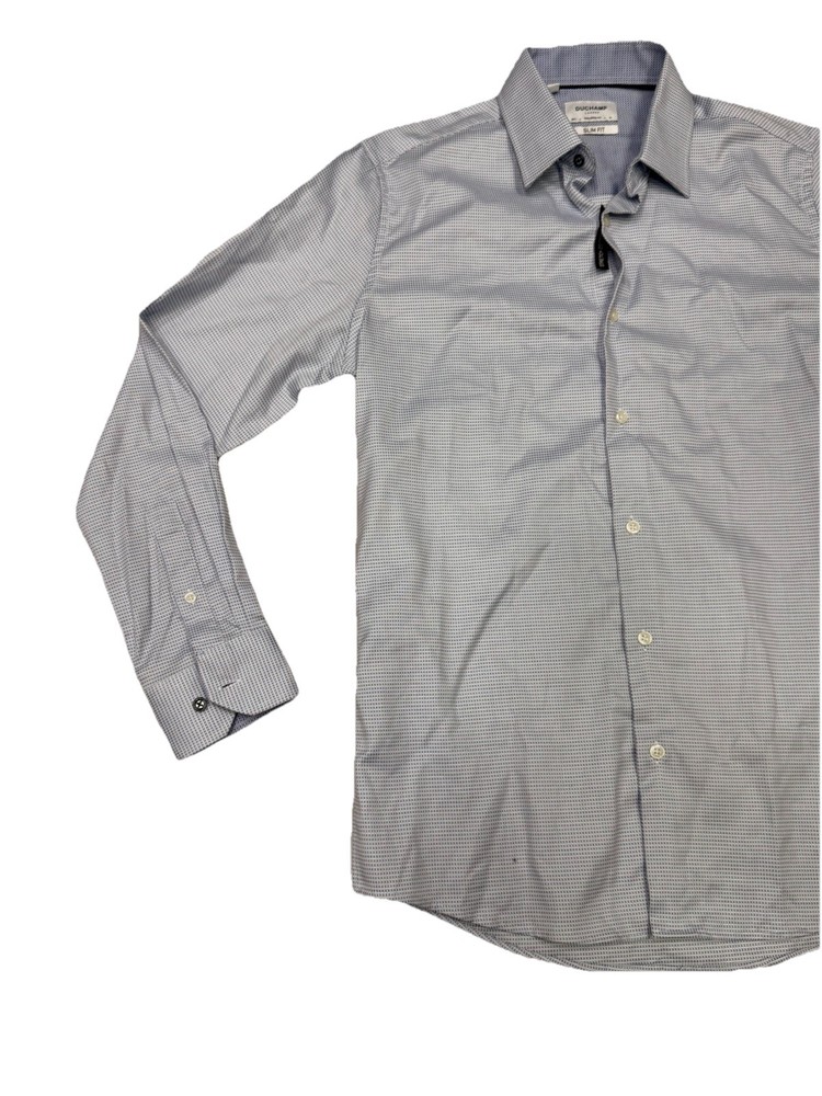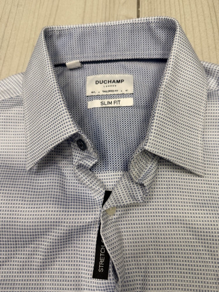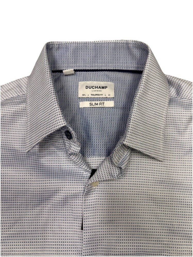 The Duchamp London Men's Tailored Fit Dress Shirt in Blue is a stylish and sophisticated addition to any man's wardrobe. Made from cotton with a slim fit, this shirt is perfect for casual and business occasions. The check pattern and button closure add a touch of style, while the spread collar and long sleeves provide a classic look. With a chest size of 41 inches and a neck size of 16 inches, this size 16L shirt is designed for a sleek and tailored fit. Perfect for the modern man looking for a versatile and high-quality dress shirt.