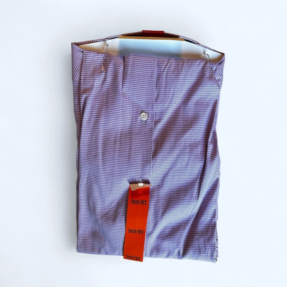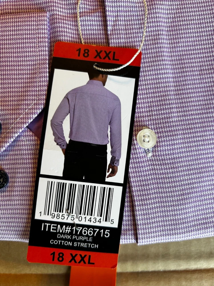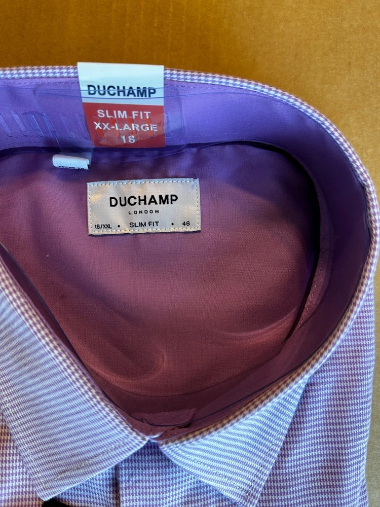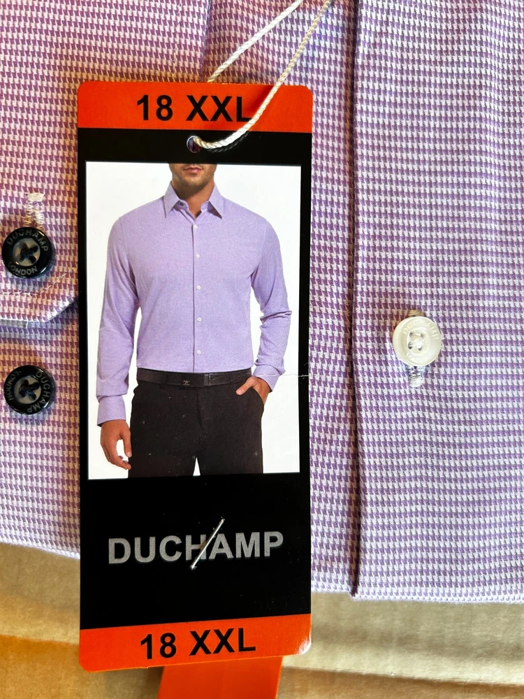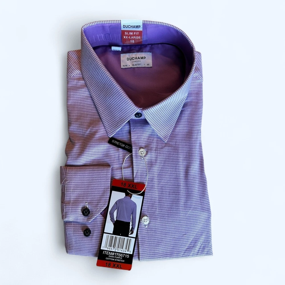 Features: Spread Collar Slim Fit Duchamp© Built-in collar stays Stretch fabric Contrast trim in collar, yoke, and cuffs Adjustable button cuffs with branded buttons Made in China Content: 97% Cotton | 3% Spandex Approximate 180 GSM (5.3oz) fabric weight Lightweight Sizing: Neck (in): 18 Sleeve (in): 36 2/5 Care Instructions: Machine wash Tumble dry
