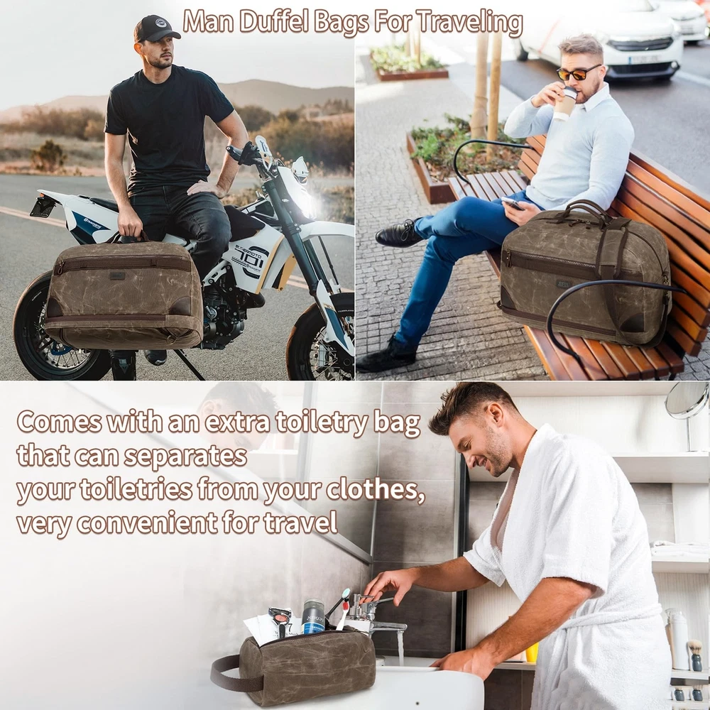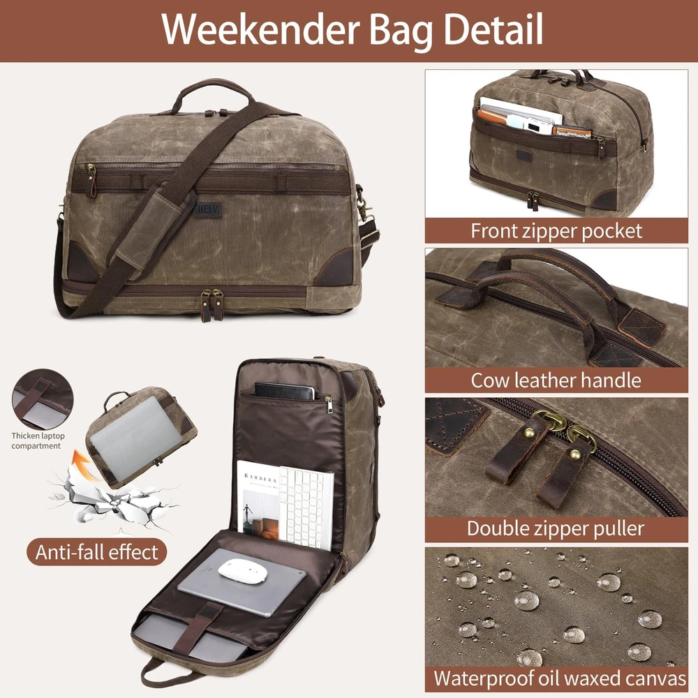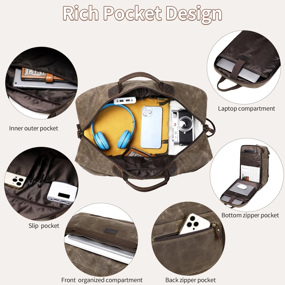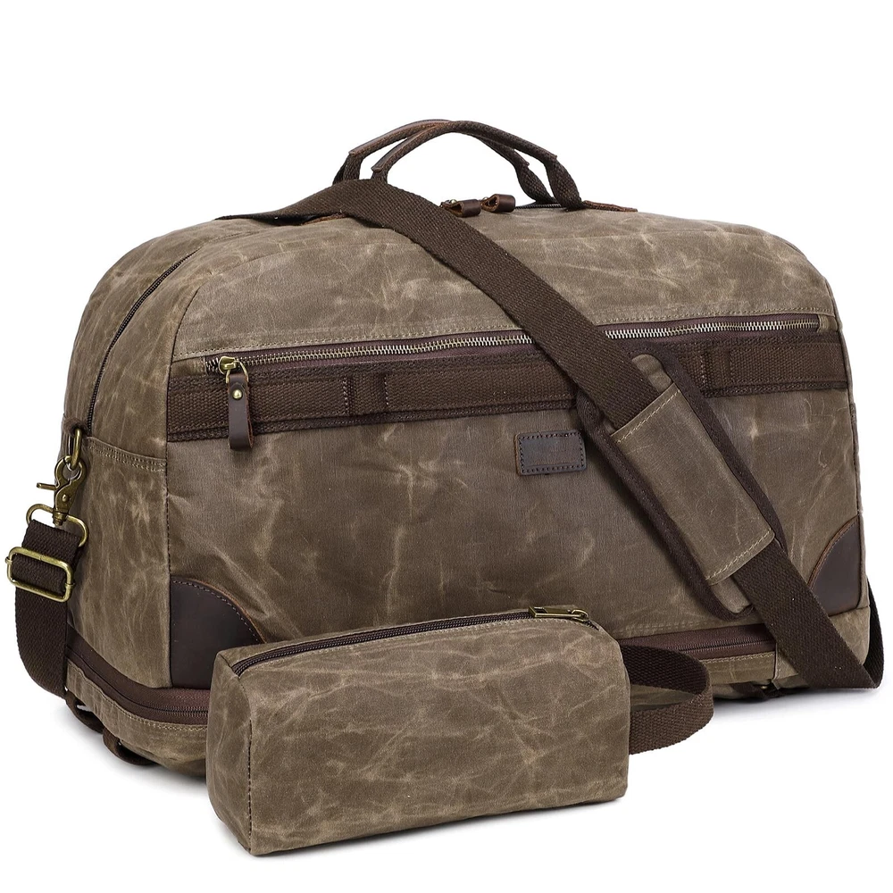 Duffel Bag for Travel: Convertible Weekender Overnight Bag Vintage Waxed Canvas Duffle Bag with Laptop Compartment, 3 in 1 Computer Backpack for Men Bags for Mens (Green) Product Details Color: Army Green Brand: Yamons MPN: Does not apply UPC: Does not apply EAN: Does not apply Product Dimensions: 20.4 x 10.6 x 13.7 inches Item Weight: 3.12 pounds Department: Men Manufacturer: Yamons Country of Origin: China Number of Compartments: 3 Item Weight: 1.42 Kilograms TRAVEL BAG & FREE TOILETRY BAG: 21.3"L * 11.8"W * 13"H that meets most international carry-on requirements. . And it comes with a free toiletry bag, which can helping you organize and maximize your space. It is a great gift for husbands and boyfriend's birthdays, wedding anniversary, Father's Day and Christmas. LARGE CAPACITY & LAPTOP COMPARTMENT: This Canvas travel bag has multiple zip pokects, help you pack easily and keep items organized. The laptop compartment is in the bottom pokect, the extra thickend sleeves well protect your electronics. 3 IN 1 CONVERTIBLE LAPTOP BAG: This duffle bag is not just a computer bag, it can also be a travel business backpack and the shoulder bag. Convertible duffle bag is designed with luggage sleeve, which can free your hands and keep your smartphone, ID card or passport inside easily when you're at the airport. PREMIUM VINTAGE WATERPROOF WAXED CANVAS MATERIAL:YAMONS overnight Bag is made of waxed canvas material.Waterproof material is pefectly protect your luggage. This vintage style is super cool for mens travel duffle bag. FINE CRAFTSMANSHIP: We are professional in bag making factory for more then 20 years. Providing the premium quality Bag and thoughtful design is all we purse. Please feel free to contact us for matter.