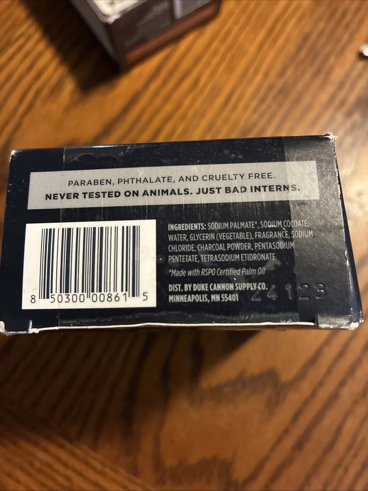 UPC: 0850300008615 Ingredients: Water, Alcohol, Charcoal gtin13: 0850300008615 Size: Regular Country/Region of Manufacture: United States Shape: Rectangular Color: Gray MPN: 01HOLIDAYCOAL1 Scent: Bergamot Brand: Duke Cannon Product Line: Big Ass Skin Type: Normal Skin Body Area: Hands, Face, Body Item Weight: 10 oz Type: Charcoal Soap Department: Men Features: Cuts Grease, Biodegradable, Phthalate-Free, Alcohol-Free, Animal Cruelty-Free, Paraben-Free, Contains Minerals, Sulfate-Free, Ammonia-Free, All Natural