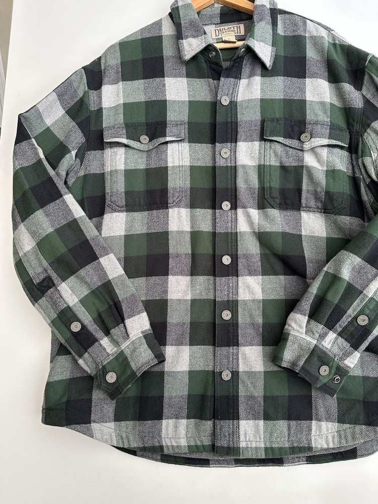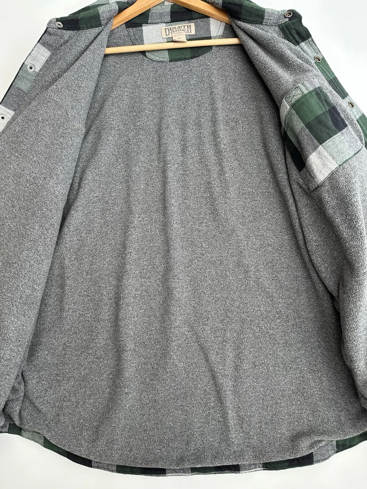 Duluth Trading Co Flannel Fleece Lined Heavy Shirt Jacket Plaid Size XL Shacket This is a heavy nice quality Shirt Jacket. Snap Closure. In very good condition - please refer to photos. Measurements laying flat: Pit to Pit 26.5" Shoulder Seam to Seam 20" Length 32" Shoulder Seam to Cuff 26"