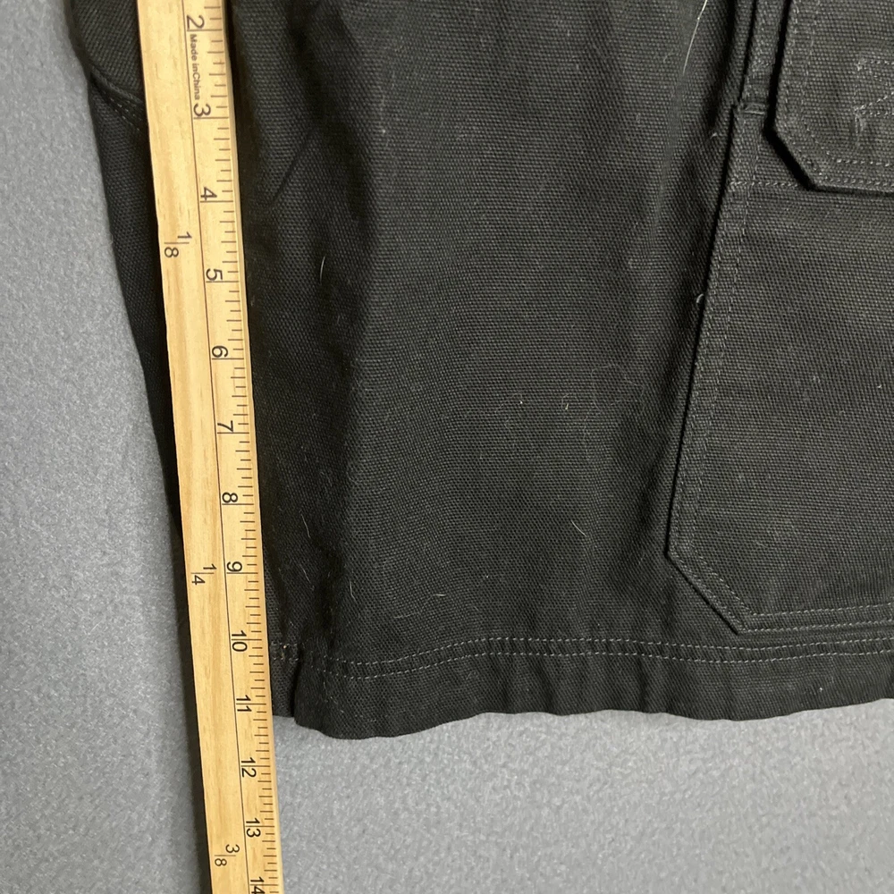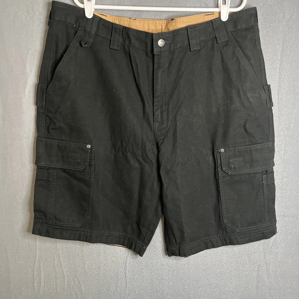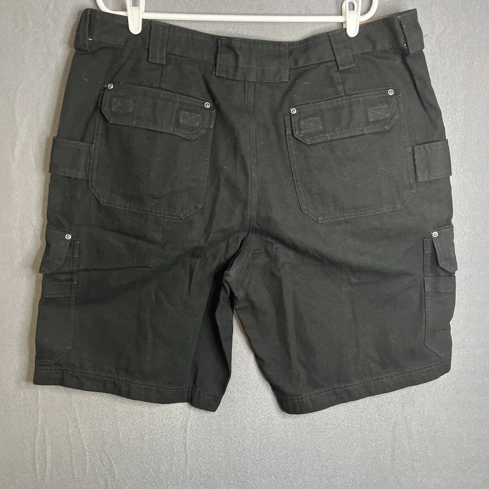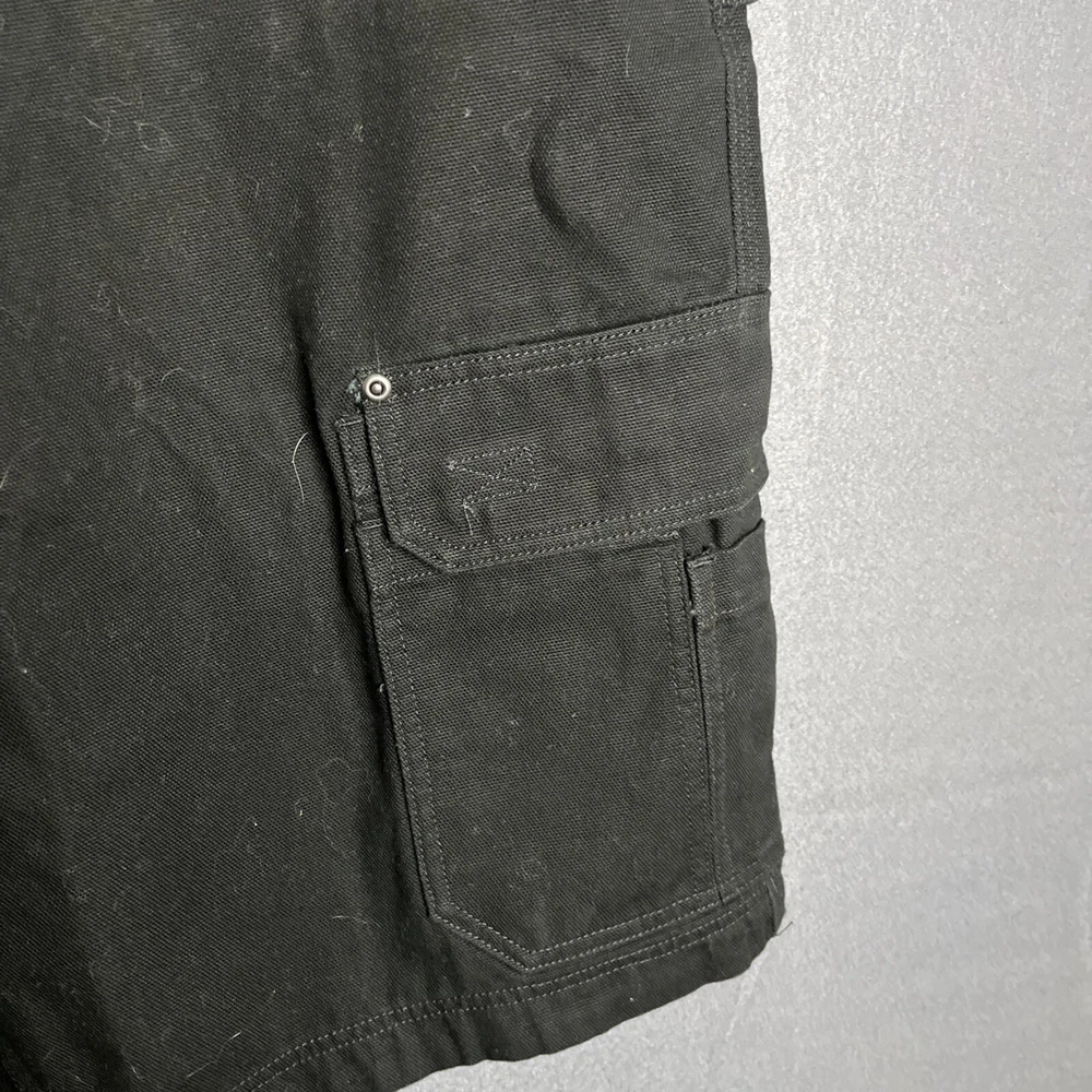 Men's black Duluth Trading Co shorts in size 42. Made of breathable cotton canvas with a mid-rise fit. Features cargo pockets, a zipper closure, and a logo accent. Suitable for travel, casual wear, or workwear. Easy care, machine washable fabric. Ideal for outdoor or preppy styling in summer, fall, or spring seasons.