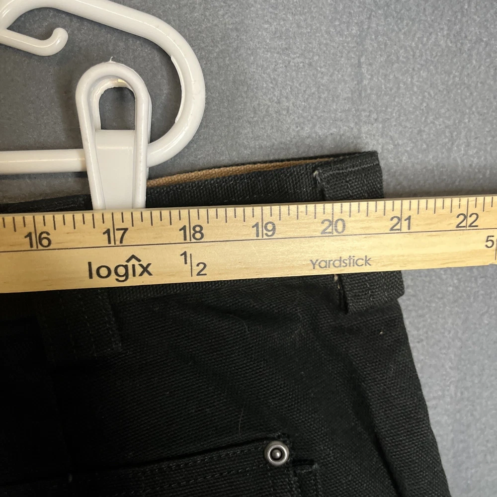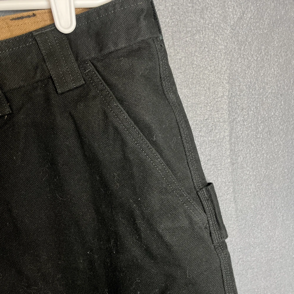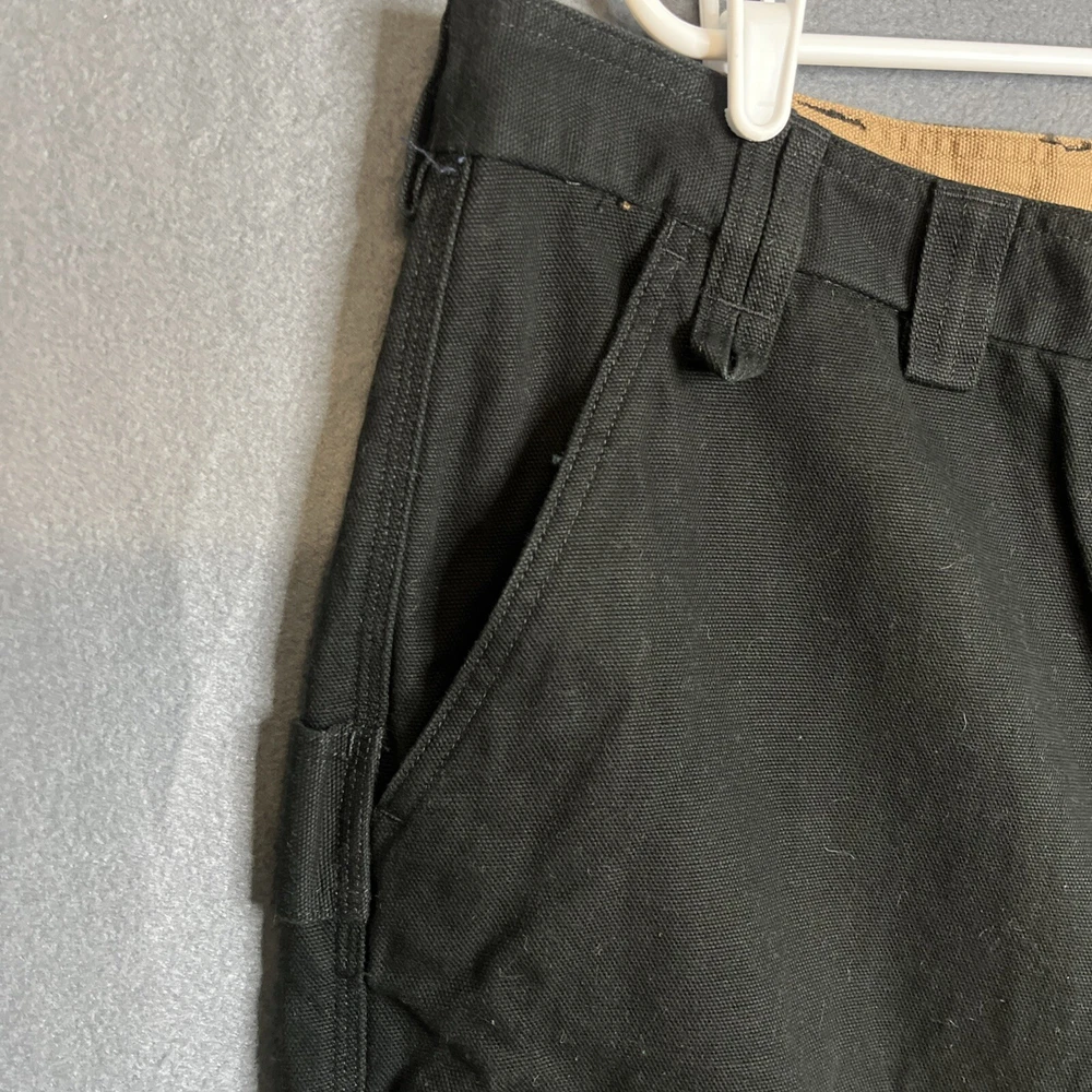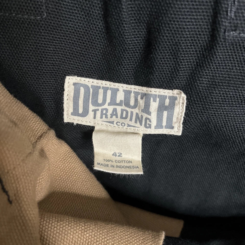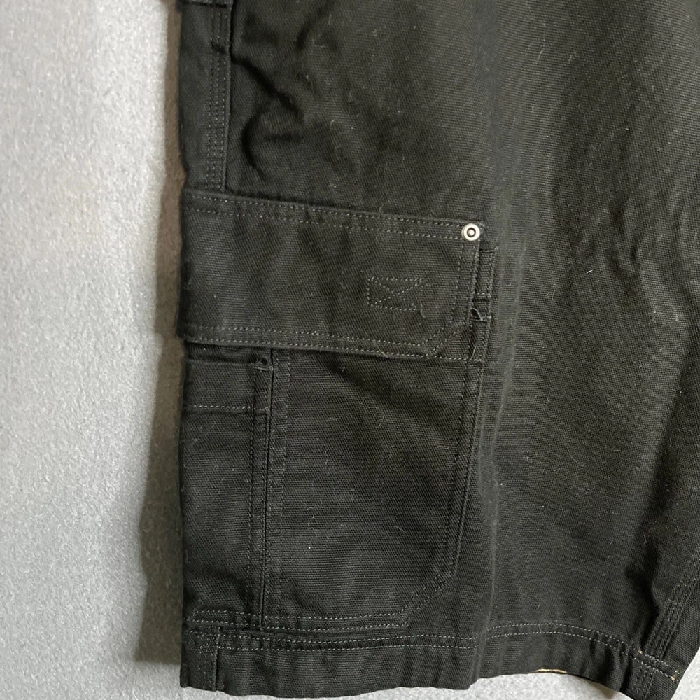 Men's black Duluth Trading Co shorts in size 42. Made of breathable cotton canvas with a mid-rise fit. Features cargo pockets, a zipper closure, and a logo accent. Suitable for travel, casual wear, or workwear. Easy care, machine washable fabric. Ideal for outdoor or preppy styling in summer, fall, or spring seasons.