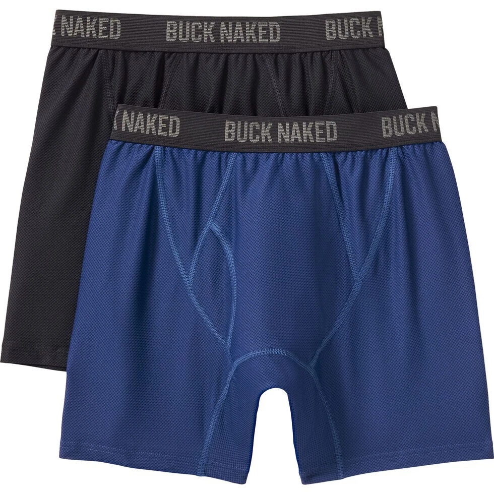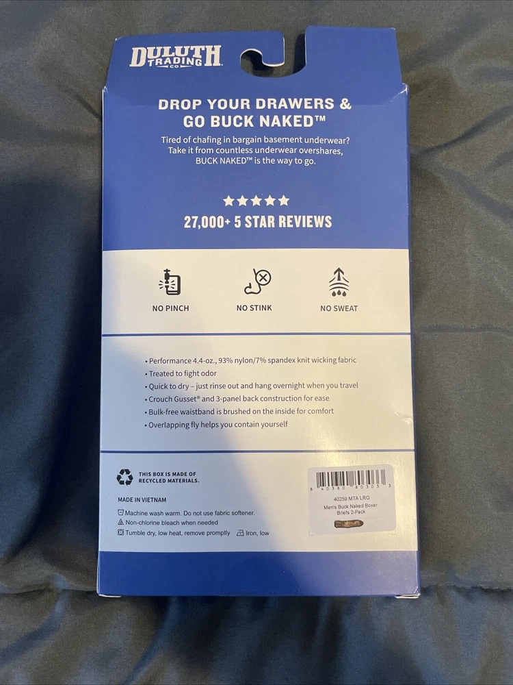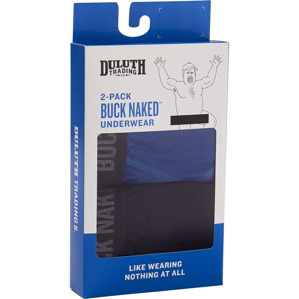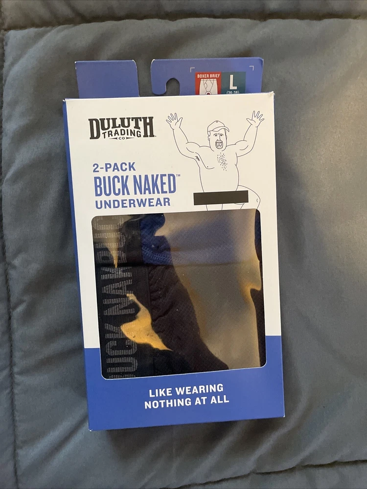 These things are super comfortable. Bought last year and unable to return them. Still in the box and sealed Elevate your underwear game with this 2-pack set of Duluth Trading Company Men's Buck Naked Boxer Briefs in size Large. Made of a comfortable blend of polyester, nylon, and spandex, these microfiber fabric boxers are perfect for all seasons and provide a breathable wear experience. The classic black and blue color combination adds a touch of style to your everyday wear. Designed with stretchable material, these boxer briefs provide a comfortable fit for everyday wear. The Duluth Trading Company brand ensures high-quality products, and these underwear are no exception. Whether you're looking for a vintage-inspired look or just something comfortable to wear, these boxer briefs are the perfect addition to your wardrobe.