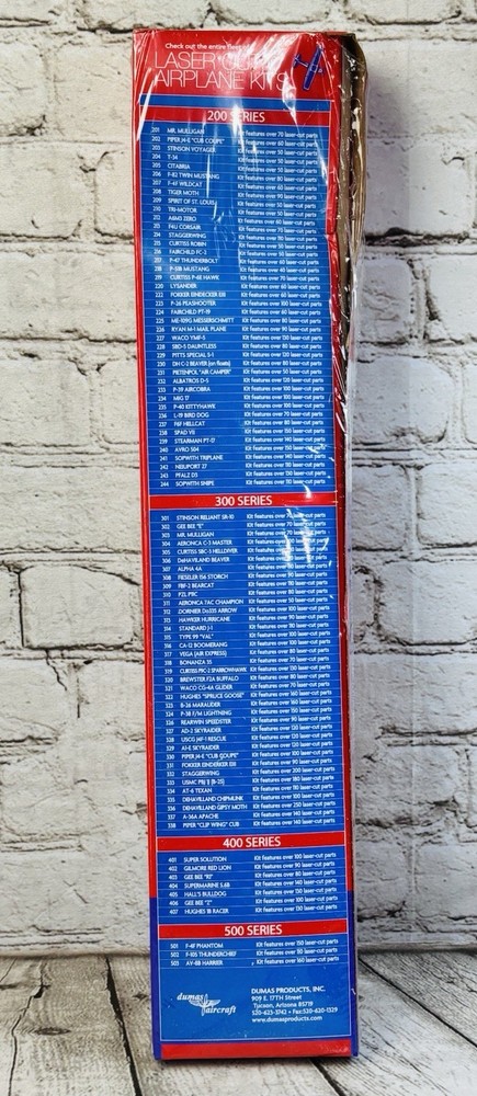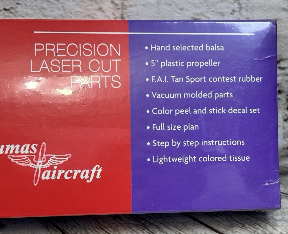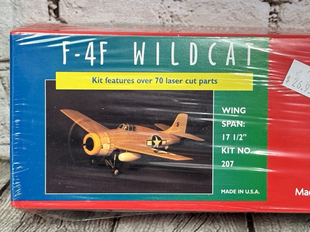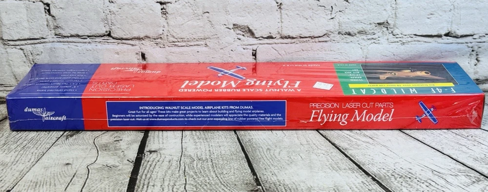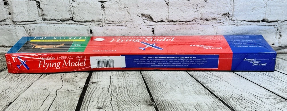 Dumas F-4F Wildcat 207 Walnut Scale Rubber Powered Flying Model Kit 17.5” NOS This is a Dumas Aircraft F-4F Wildcat flying model kit, kit No. 207. Part of the 200 Series, this walnut scale kit features over 70 precision laser-cut parts and builds into a 17.5” wingspan rubber-powered free-flight model. The kit is new old stock and factory sealed, though the outer box shows some visible wear and crumpling on one end. •Model: F-4F Wildcat •Kit No.: 207 •Wingspan: 17.5 inches •Features: Over 70 laser-cut parts •Includes: Hand-selected balsa, 5” plastic propeller, F.A.I. Tan Sport rubber, vacuum-molded parts, color peel & stick decal set, full-size plan, step-by-step instructions, lightweight colored tissue •Manufacturer: Dumas Products, Inc., Tucson, AZ •Made in: USA •Condition: New old stock, sealed box with visible wear/denting on end Great for collectors or hobbyists interested in WWII aviation models. Ships securely.
