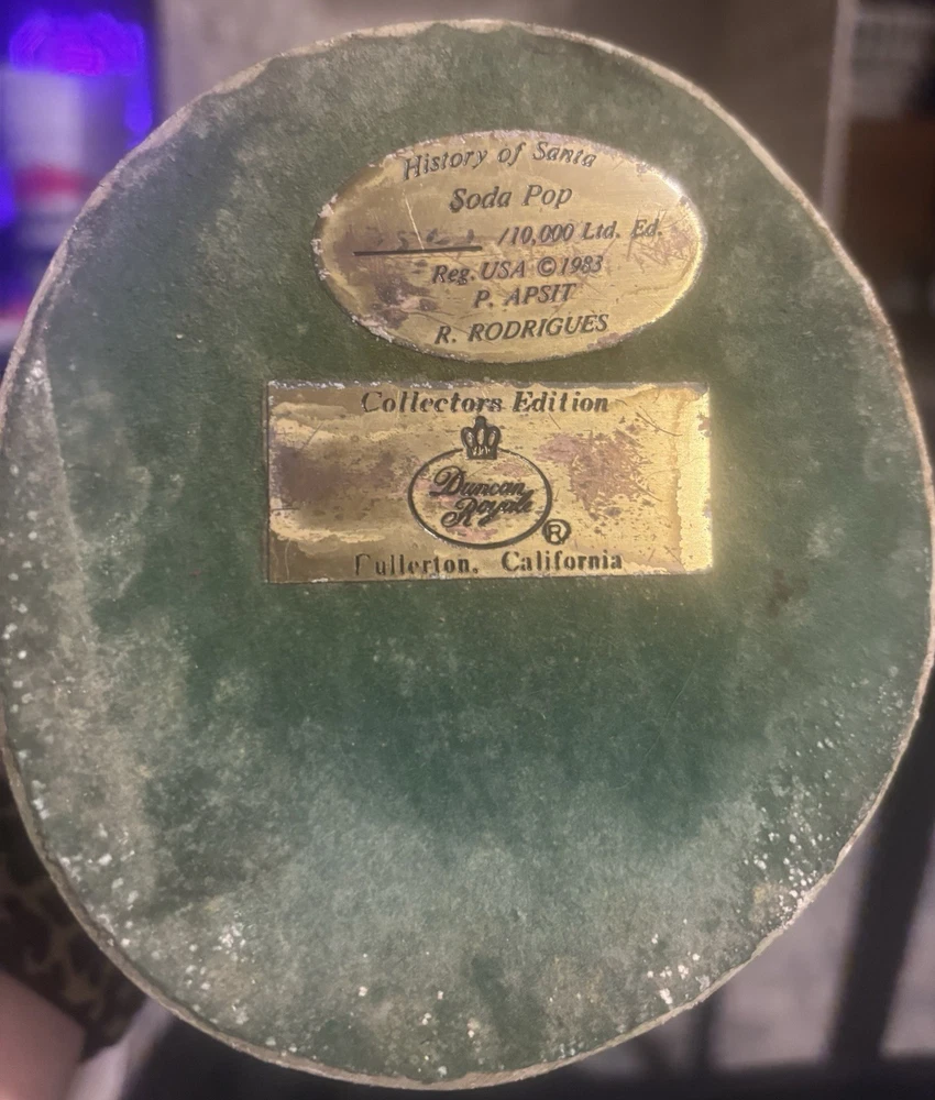 The Duncan Royale Soda Pop Santa figurine is part of the "History of Santa collection" from 1983, making it a unique and nostalgic piece for collectors or Santa enthusiasts. This multicolor figurine is made of plastic, ceramic, and porcelain, adding a touch of whimsy to any Christmas decor. With its retro design and year of manufacture, this Santa figurine brings a piece of the 1980s holiday season to life, perfect for adding a festive touch to your home during the holidays.