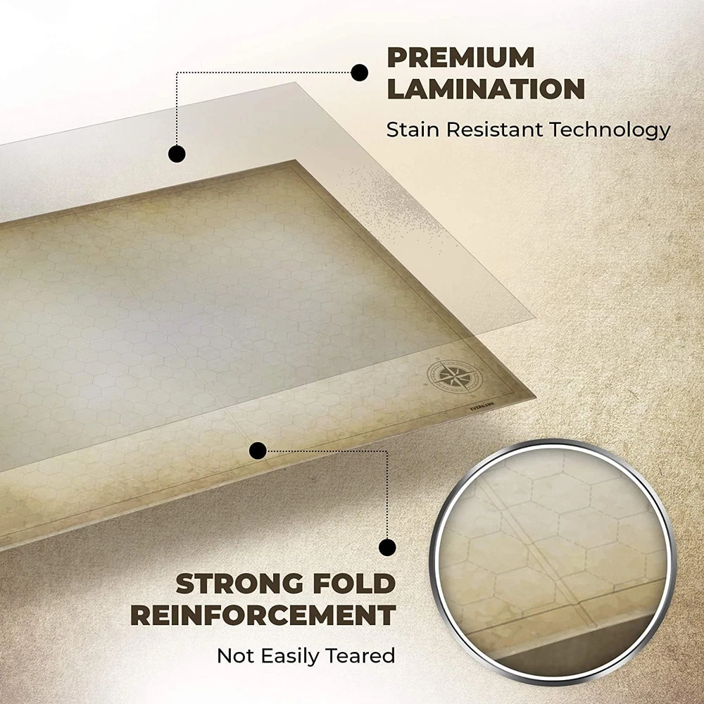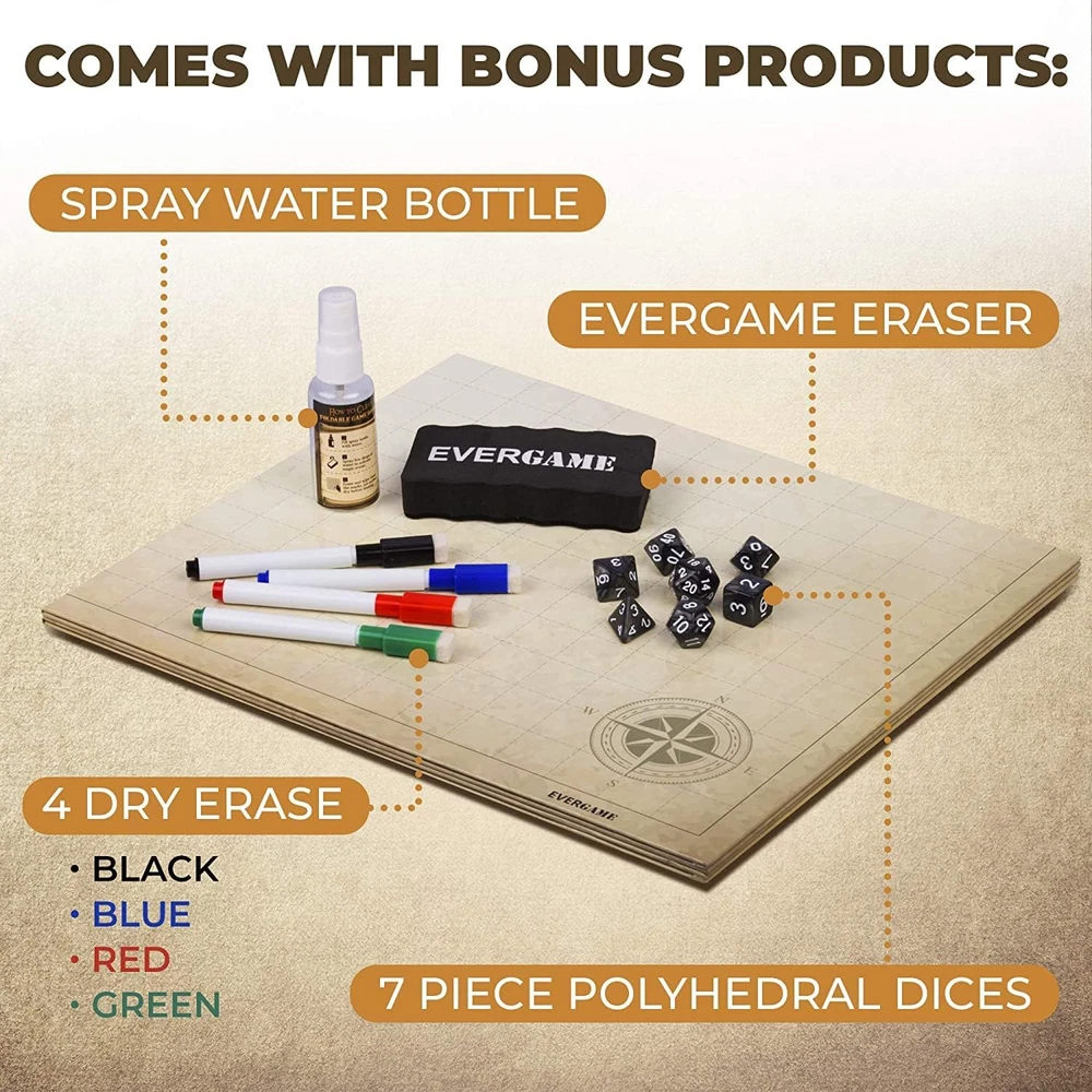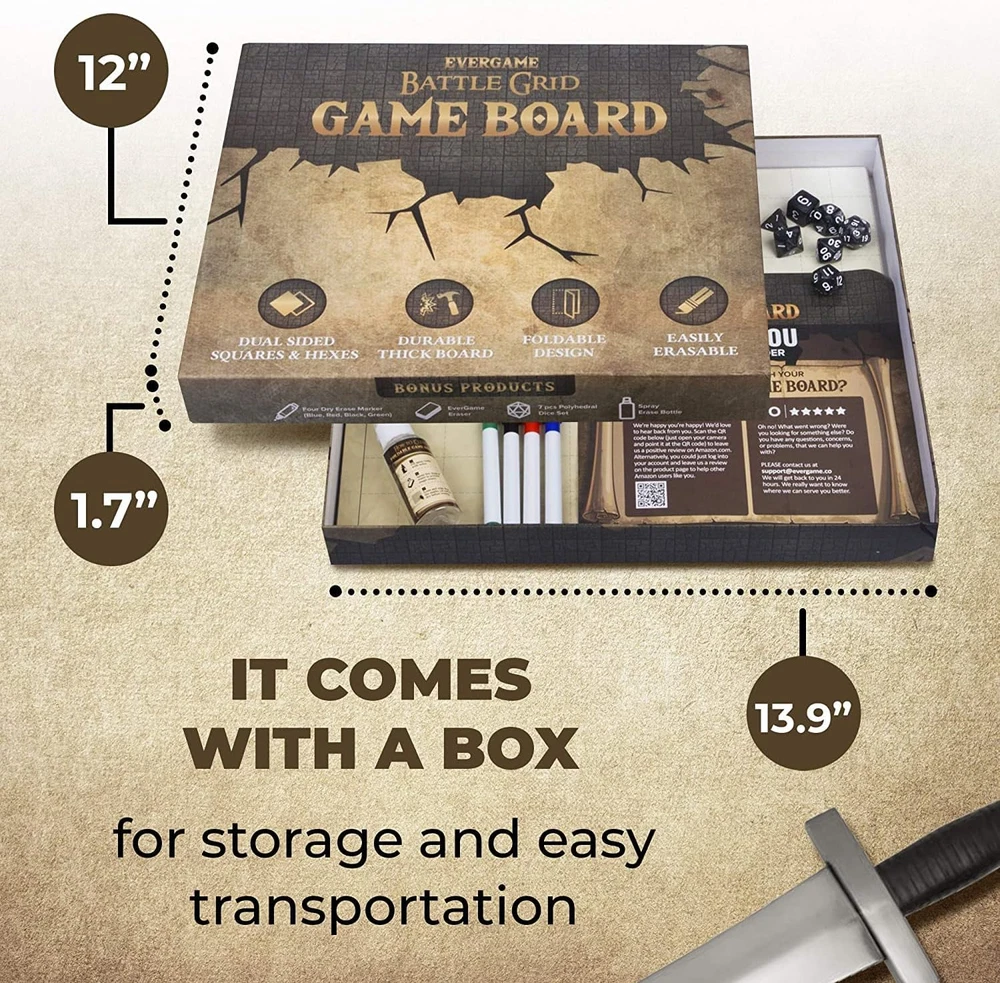EPIC GAMEPLAY - Enhance your D&D roleplay gaming experience; Immerse yourself in the fantasy world of thrilling campaigns, strategic gameplay & intense tactical combat; Enjoy complete fun package w/ this 23" x 27" double-sided game mat AGED SCROLL LOOK - High-Resolution print and classic aged look adds an authentic touch, creating a truly immersive gameplay experience; Game mat is double-sided w/ 1" square & 1" hex grid on each side respectively COMPLETE PACKAGE - Includes 1 game mat, 7-pc dice set, 4 colorful markers w/ eraser heads, 1 eraser, 1 spray bottle & 1 storage box; Store easily in box provided and carry your adventures anywhere you like; Delightful gift for dnd enthusiasts of all ages CLEANS LIKE NEW - Play everything from dungeons & dragons, pathfinder to Warhammer without dealing w/ marks & stains from previous game; Deluxe PVC coating ensures it always cleans like new even after playing for hours TRUSTED QUALITY - Experience superior quality w/ heavy-duty game mat; Meticulously crafted using premium paper & laminated, it boasts strong fold reinforcement, exceptional tear-resistance & long-lasting durability; Completely safe to use w/ non-permanent markers Product Description Time to change the game. Again. There are people who play games, and then there are gamers. Show everyone that you mean business with a dungeons and dragons battle mat that is every bit as resilient as a Level 11 Barbarian who just activated Rage. With features that ease quality of life and enhance your gaming experience, the Evergame Foldable dry erase grid mat gives the power right back to the players Play the Game, Don’t Let It Play You. Play the Game, Don’t Let It Play You. Some game systems use a combat system on hexagons. Others on squares. Most battle mats force you to choose one or the other, or to buy two game mats to support both systems. It’s not perfect, but what can you do? Well, you can choose to play with Evergame Foldable Game Board instead, for starters. We let you flip the game board to choose between the two, giving you the complete control to play your games the way they were meant to be played, not the way you have to make do with. Erase and Rewind In any battle, there is always a mess afterwards. Your Evergame Foldable Game Board is no different, except it’s the easiest thing to clear the mess after every gaming session because any lines you draw with your markers go right away with a swipe of the eraser. No more worries about ghost stains and remnants of sessions long past. Every new battle is a fresh start. Ready for Anything Our Evergame Foldable battle board are constructed not only with quality but utmost compatibility in mind. We are compatible with all types of tabletop RPG’s, including but not limited to everything that you see here. Don’t limit yourself to one or two games when you can play every single one of them on our versatile and handy dry erase dungeon. This hexagon game mat can be use as table top battlemat. They’re Called Guidelines for a Reason. Our Evergame Foldable dry erase game tiles have broken lines that are light and unobtrusive so they won’t get in the way of your own markings. That way, you never lose track of the battlefield, but have all the power to reshape the dnd battle grid to your specifications. Everything is within your purview, and everything is under your control. One box to Hold Them All. When it’s time to pack it all in, your eraser, your pens, your dice, tokens, and yes, foldable gaming grid mat fits perfectly into an elegantly constructed box designed for your portability and convenience. Now, you need not worry about losing anything important for your next gaming session – it’s all right here, waiting for you in the box.