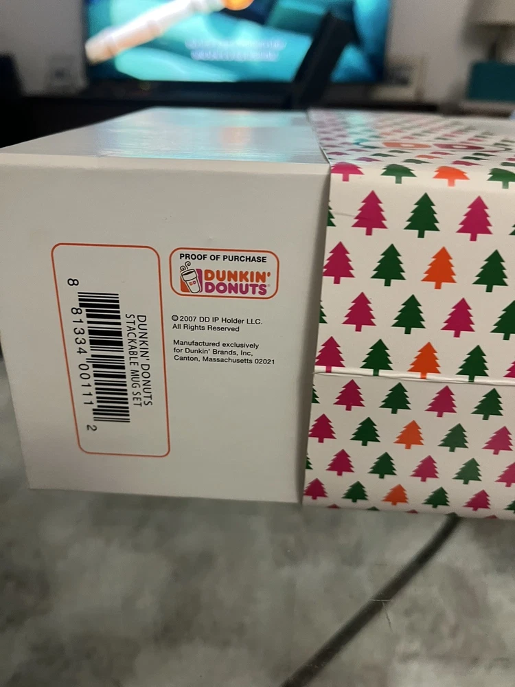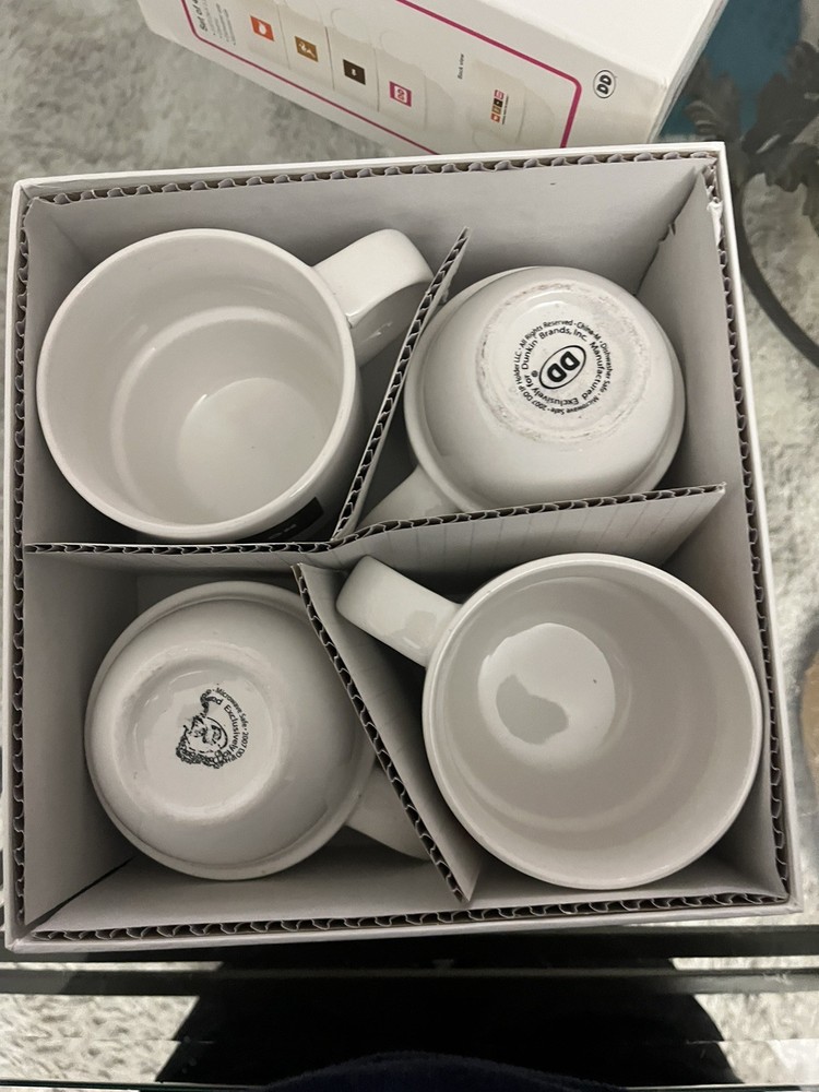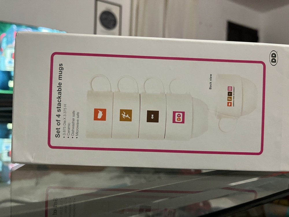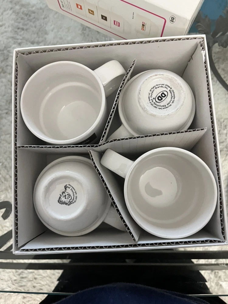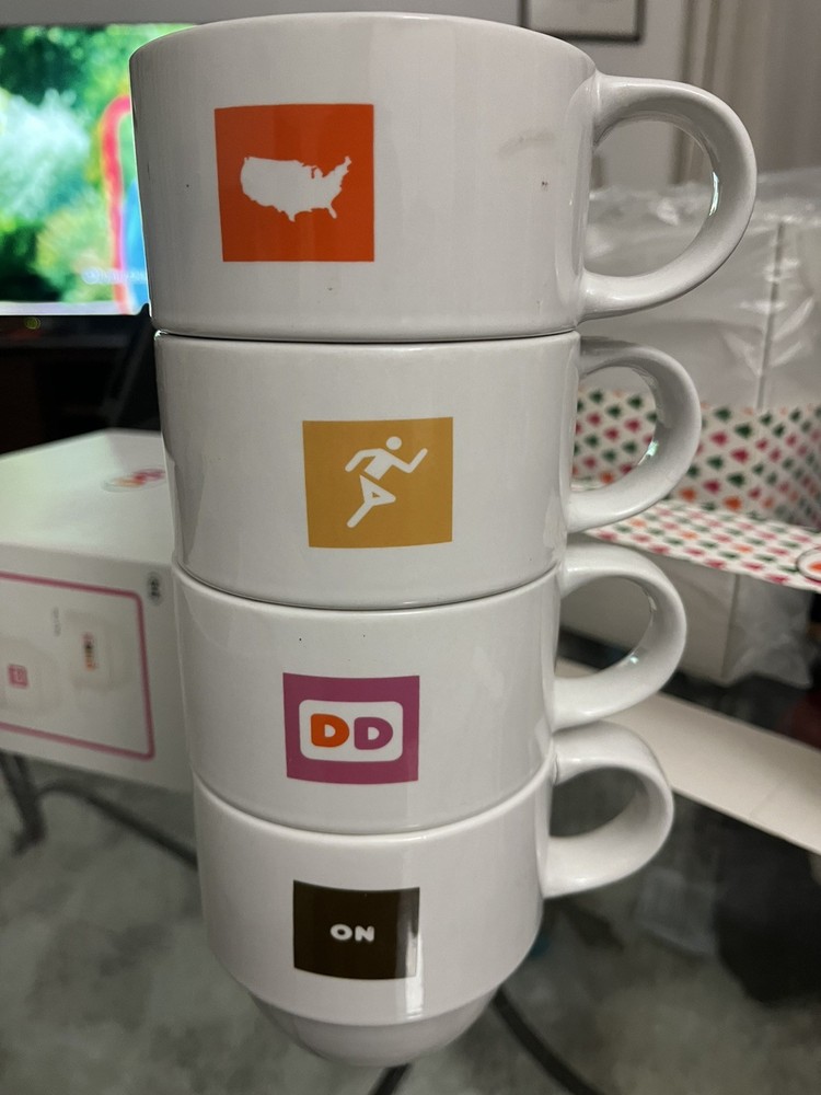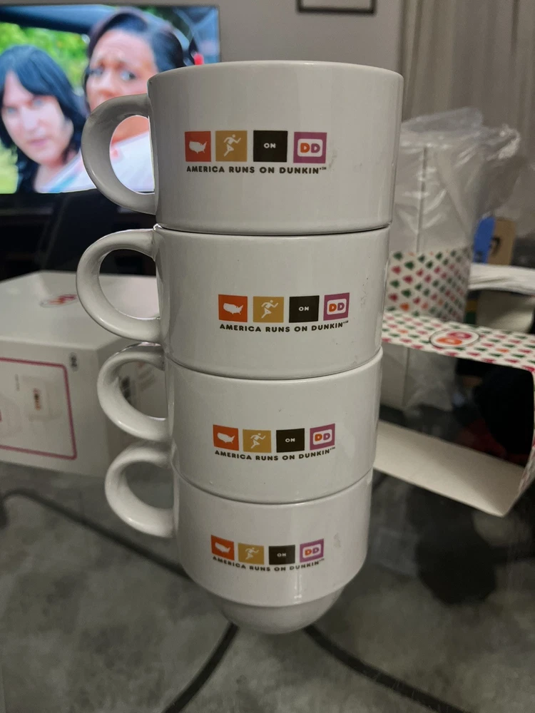 The Dunkin' Donuts Stackable Coffee Mugs America Runs On Dunkin 2007 Set of 4 is a collectible set of multi-color mugs featuring the iconic Dunkin' Donuts theme of coffee and tea. Made in China, these original mugs are perfect for any fan of the brand or collector of advertising memorabilia. With a fun stackable design and patriotic message, these mugs are a unique addition to any kitchen or collection.