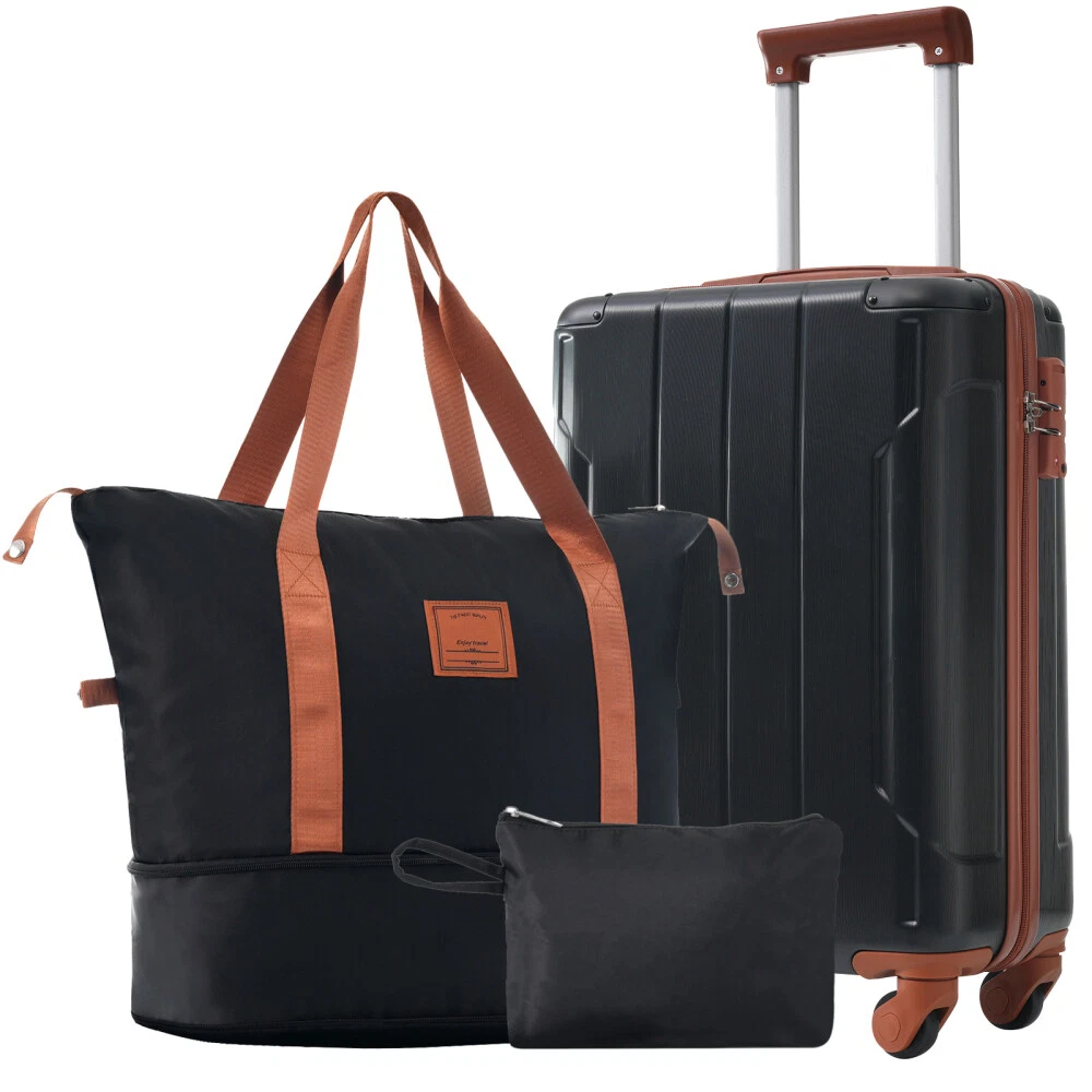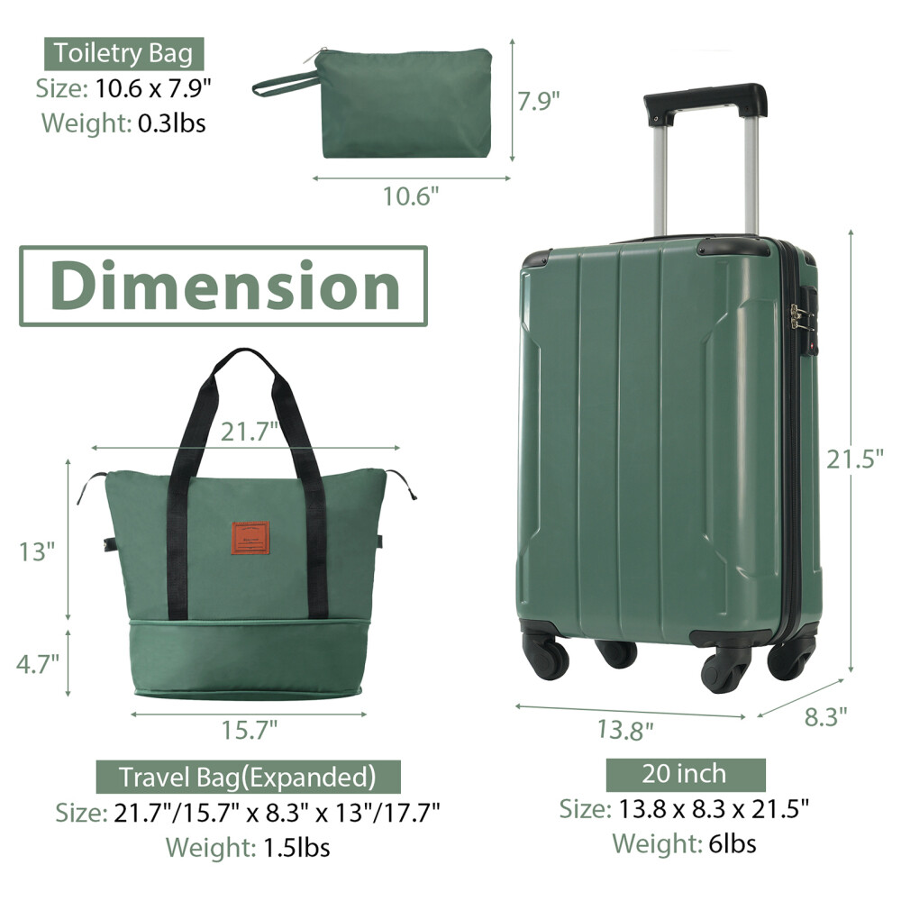 Hardshell Luggage Sets 3 Piece Carry-on Suitcases with Wheels, TSA Lock for Men Women 20IN Product Features Luggage set includes a 20-inch luggage, a travel duffel bag, and a toiletry bag. ABS hard shell luggage is lightweight and durable, with excellent wear and impact resistance, which can withstand transportation and keep your belongings safe. Make traveling effortless and enjoyable. TSA Approved Lock: Each travel suitcase comes with a 3-dial TSA approved combination lock to prevent the luggage from being opened violently, and better protect your property and facilitate customs clearance. Telescopic Handle: 3-level adjustable handle to meet the needs of users of different heights. Metal Corner Protectors: Reduce wear and tear on the suitcase caused by collisions and prolong the service life of the suitcase. 20 inch carry-on luggage dimensions: 13.8 x 8.3 x 21.5 inches. The 360° wheels are made of highly elastic TPE material for easy movement and portability. Expandable Weekender Bag: (front shape is trapezoidal): longest length: 21.7", shortest length: 15.7", width: 8.3", height: 13", expanded height: 17.7". The duffel bag has a trolley sleeve with zippered pocket, so you can conveniently hang the bag on the adjustable luggage handle. Description HOW TO RESET THE TSA COMBINATION LOCK 1. The lock is set to 0-0-0 at the factory. 2. Make sure the dials are rotated at 0-0-0 or any other code you've set before resetting it. 3. Use a pen or something pointed to press the reset hole adjacent to the dials. 4. Enter your new code by rotating the dials 5. Push the key button once and your code is now set. 6. Scramble the dials and test your new code to be sure the correct one is set.