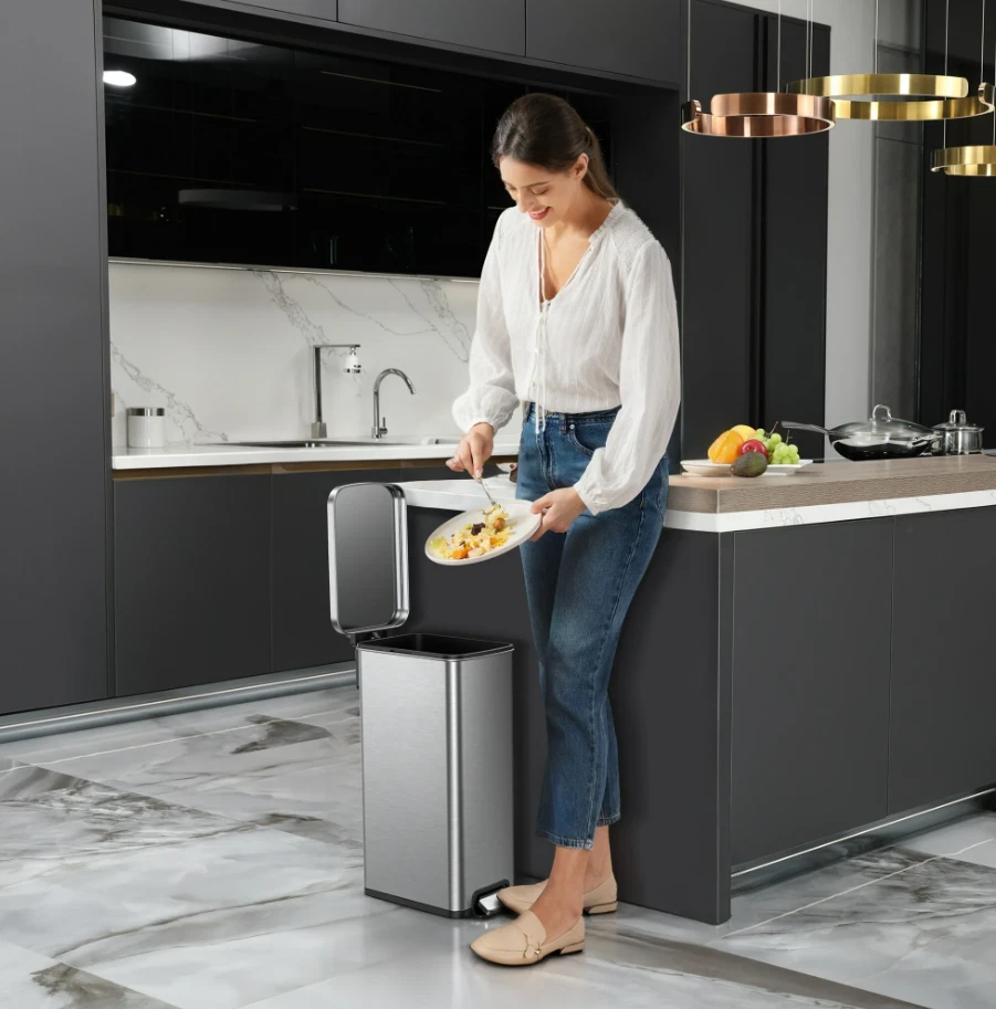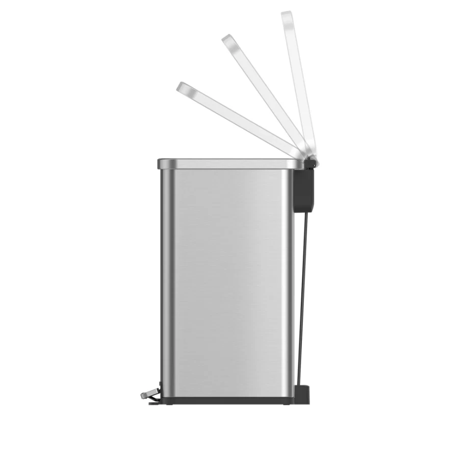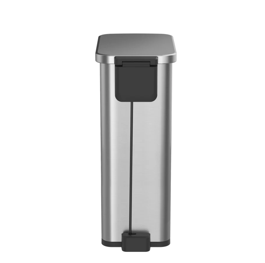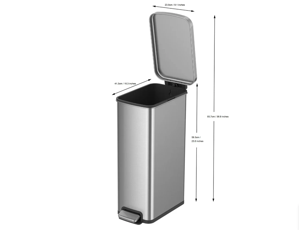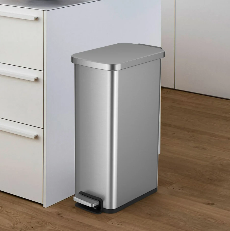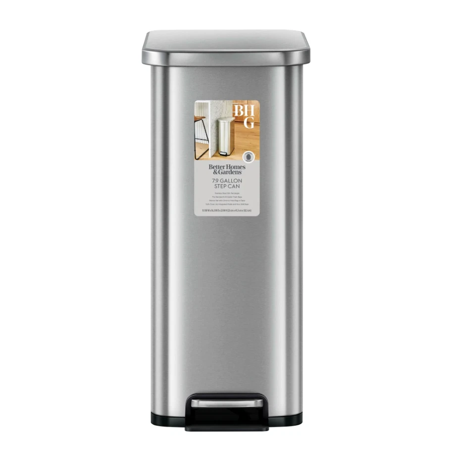 7.9 Gallon Slim Stainless Steel Step Trash Can is your solution for those hard to fit spaces in your home. The slim design makes it ideal for any room in the house and the brushed stainless-steel finish blends seamlessly with any home decor. The clean lines and gently rounded corners will look nice in your kitchen, laundry room, family room - anywhere in your house where the hands-free, step pedal operation would be convenient. This trash can features a soft open & close lid for quiet operation, thanks to the durable step pedal mechanism with a dual-force damper system. The lid can also be locked in an open position for longer cleaning tasks. This sleek stainless trash can is fingerprint resistant and easy to wipe clean with a soft damp cloth. The removable inner bucket makes emptying the trash can quick and easy. Fits any standard 8-10 gallon kitchen trash bag, no special order bags needed. Slim Vertical Design: Fits great in smaller spaces in the kitchen or any room of the home, office, or dorm Material: Brushed stainless steel is rust, stain and fingerprint resistant Durable Step Pedal: Hands-free convenience Dual-Force Damper System: Provides a smooth open and silent close Stay open lid: Stays open for longer cleaning tasks as needed Removable Inner Bucket: For quick and easy bag changes Easy to Maintain: Simply wipe clean with a soft, damp cloth Dimensions: 9.1" W x 16.3" D x 23" H Why You'll Love It: Streamlined styling fits flush against a wall or cabinet