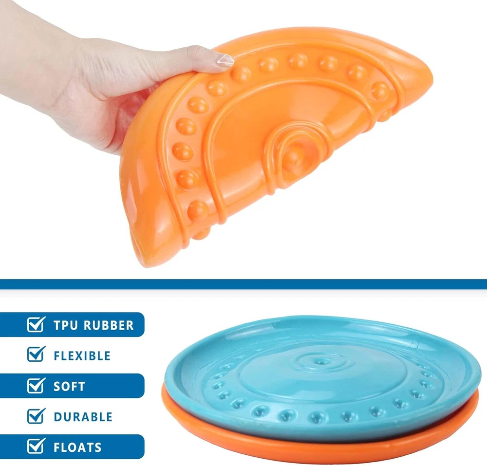 DURABLE DOG FLYING DISC: Our durable rubber dog toy is puncture, chew, and tear resistant; solid, heavy duty design; engineered to be as strong & indestructible as physically possible for long lasting durability. Whether you’re playing fetch , it's your best choice! DOG TOYS FOR AGGRESSIVE CHEWERS: This tough dog toys have passed our mechanical test and features excellent bite resistance. When your dog gets thirsty you can even turn it over and use it as a drinking bowl. SAFE RUBBER DOG FLYING DISC: This floatable dog flying disc is recyclable, harmless and top-rack dishwasher safe for frequent cleanings. The compounded rubber won’t harm your dogs health, please feel confident when you play with dogs. AERODYNAMIC DOG FLYING DISC: You won’t have to wear out your arm, just after a flick of the wrist, the puppy toys keep flying because of the aerodynamic grooved design. SOFT MATERIAL: This hyper pet toys for dogs features soft rubber, it's gentle on puppy's gums and teeth. Makes for a softer, forgiving catch during fetch. The scientists said that dog is like a kid they want to play all the time, of course they also want toys. Dog's teeth grow very quick so they always like hold something in mouth. The pet Flying disc is very strong you don't worry about the quality it can support most dog's bite force At the same time the flexible material can avoid your pet injured. Enjoy the game with your pet. Features: 100% Brand new and high quality