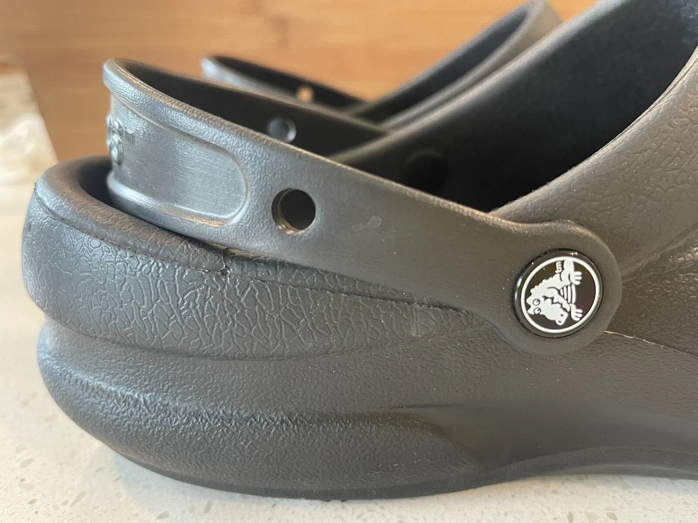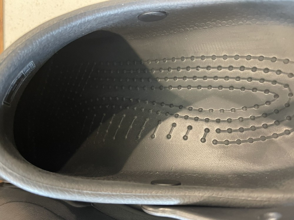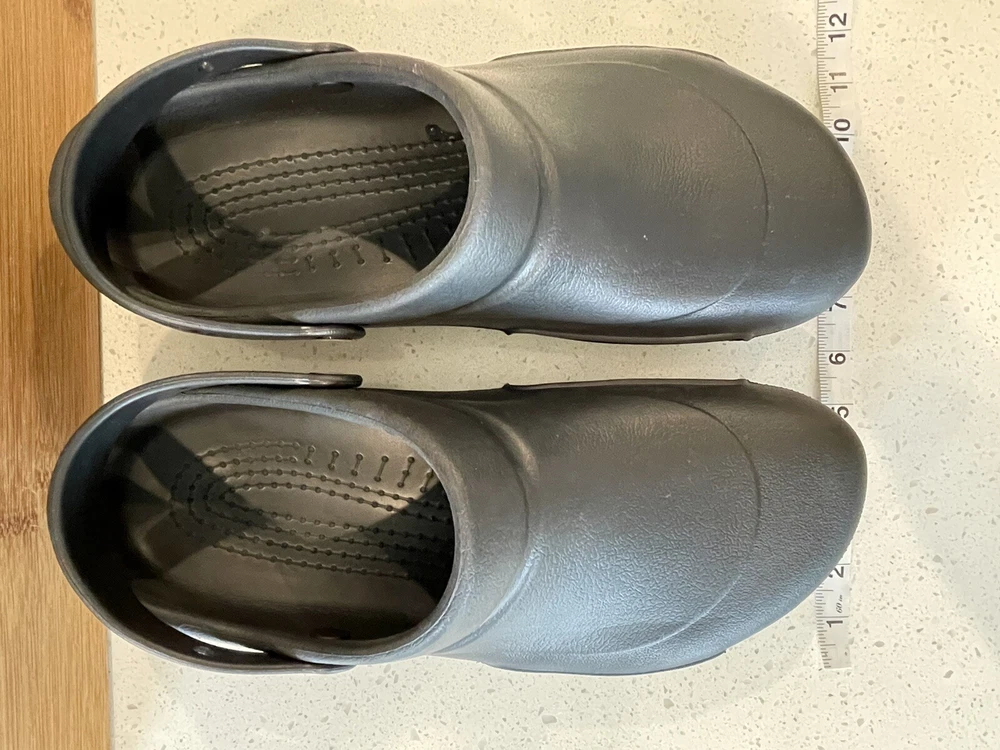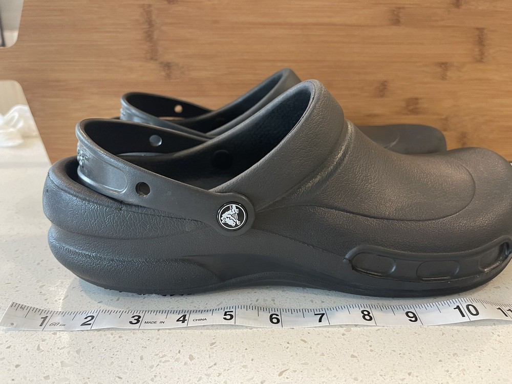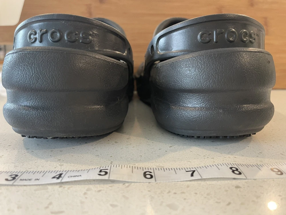 Elevate your casual look with these stylish Crocs Bistro slip-on clogs. Perfect for any occasion, these shoes feature a solid pattern and slip-on closure for easy wear. The black rubber upper material is accented with a non-slip feature, making them perfect for any surface. These clogs have a flat heel height of under 1 inch and a standard shoe width. The synthetic lining and insole material ensure comfort, while the rubber outsole provides durability. These Crocs Bistro slip-on clogs are a must-have addition to any wardrobe. From a smoke-free home.