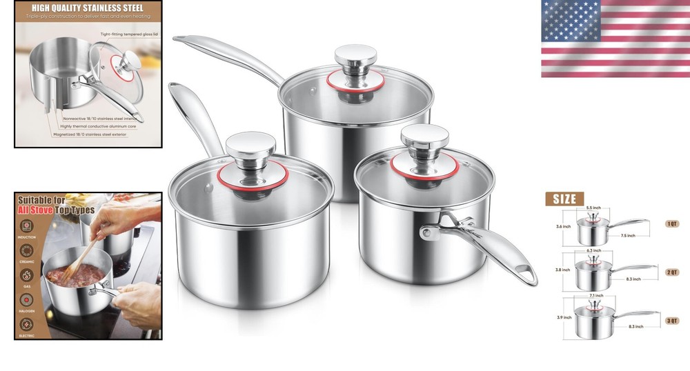 Durable Induction-Ready Saucepans with Lids - 18/10 Stainless Steel Set ‹ › ‹ › ‹ › ‹ › ‹ › ‹ › ‹ › ‹ › ‹ › ‹ › Durable Induction-Ready Saucepans with Lids - 18/10 Stainless Steel Set Transform your culinary experiences with our collection of saucepans crafted from 18/10 stainless steel, designed to elevate your kitchen with both style and functionality. Unmatched Features: Quality: Constructed from high-grade 18/10 stainless steel, free from chemical coatings, ensuring no rust, corrosion, or food reaction. Durable Handles: Long, hollow handles remain cool to the touch, ergonomically designed for comfort and secure grip, riveted for extra strength. Tri-Ply Construction: Triple-ply design featuring a core of aluminum between stainless steel, delivering fast, even heating while being compatible with all cooktops, including induction. Tempered Glass Lids: Locks in moisture and flavor while allowing you to monitor cooking progress without lifting the lid, complete with a safe riveted knob that stays cool during use. Versatile Set: Includes three saucepans with capacities of 1QT, 2QT, and 3QT, perfect for everything from boiling water to making sauces, soups, and stews. Exceptional Benefits: No need to worry about toxic materials or harmful chemicals—cook healthy meals with confidence. Dishwasher safe for effortless cleaning, making your cooking experience even more enjoyable. Perfect for all cooking styles from novice cooks to seasoned chefs, bringing ease and efficiency to your kitchen tasks. Presented as an ideal gift for special occasions—perfect for weddings, housewarmings, and holiday celebrations. Why Choose Our Saucepan Set? Every meal is an opportunity to create extraordinary moments, and with this set of durable induction-ready saucepans, you’ll cook with confidence and style. Experience the beauty of materials combined with functional design that delivers remarkable cooking results. Whether you're boiling, simmering, or creating gourmet sauces, let our cookware become a staple in your kitchen. Indulge in culinary excellence and order your Durable Induction-Ready Saucepans today to redefine your cooking journey! Shipping Free & Fast Shipping - We offer free shipping to most of the USA with a normal delivery time of 3-7 days. However, due to the current situation, additional delivery time (up to 3 weeks) may be required for some items. Alternative Carriers - We may use alternative carriers (e.g. USPS, FedEx, UPS, etc.) to ensure your package arrives safely and on time. Due to the use of multiple carriers, we are unable to provide a tracking number automatically. Handling Time - Orders are processed and shipped within 1-2 business days of receiving cleared payment. Shipping Restrictions - Shipping to Alaska, Hawaii, Puerto Rico, Guam, and other US territories may incur shipping charges or delivery restrictions. Please contact us before ordering, or your order can be refunded/cancelled. State Restrictions - There may be restrictions based on your state of purchase. For example, certain items may not be shipped to California due to state regulations. Contact for Tracking Updates - If you require tracking updates or have any concerns about the delivery of your order, please feel free to contact us, and we will be happy to assist you. Return 30-Day Hassle-Free Returns - We want you to be completely satisfied with your purchase. If you are not, you can return the item within 30 days of receiving it for a full refund or exchange. Easy Return Process - To start a return, simply contact us and we will provide you with a prepaid return shipping label and detailed instructions. Restocking Fee - There are no restocking fees for returns. However, the buyer is responsible for return shipping costs if the return is not due to a seller's error. Refund Processing Time - Refunds will be processed within 5 business days of receiving the returned item in its condition. Payment We accept all major credit cards, PayPal, and Apple Pay for your convenience. Your payment information is secure and encrypted to ensure a safe and seamless transaction. Please complete your payment within 3 days of purchase to avoid any delays in shipping. Feedback Your feedback is extremely important to us. We strive to provide the best products and customer service possible. If you are satisfied with your purchase, please take a moment to leave us a positive review. If you have any concerns or issues with your order, please contact us before leaving negative feedback. We are committed to resolving any problems and ensuring your satisfaction. Contact Us If you have any questions or concerns, please feel free to out to our customer support team. You can contact us through the eBay messaging system. We are available Monday to Friday, 9:00 am to 5:00 pm EST, and we will do our best to respond to your inquiry within 24 hours. Buy it now and enjoy a pleasant shopping experience! Unit Quantity: 3 Stove Type Compatibility: Electric,Gas,Induction,Glass,Ceramic,Halogen Material: Stainless Steel Set Includes: Lid,Saucepan Features: Dishwasher Safe,Easy to Clean,With Lid Type of Oven: Electric,Gas,Induction,Microwave Oven Capacity: 1 qt Surface Coating: Stainless Steel Type: Saucepan Color: Silver Item Diameter: 7 in Shape: Round Item Depth: 3 in Number of Items in Set: Three-Piece Item Weight: 3.86 kg Heat Resistance: Up to 300°C