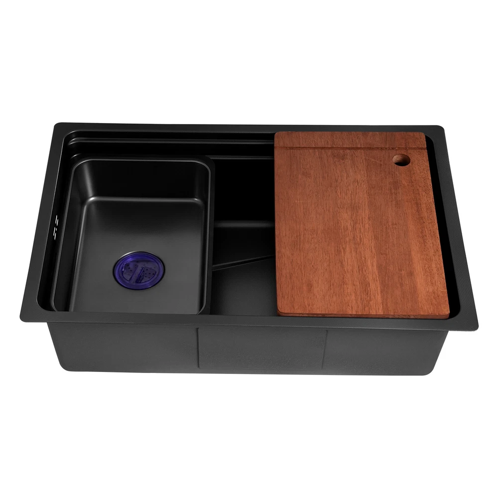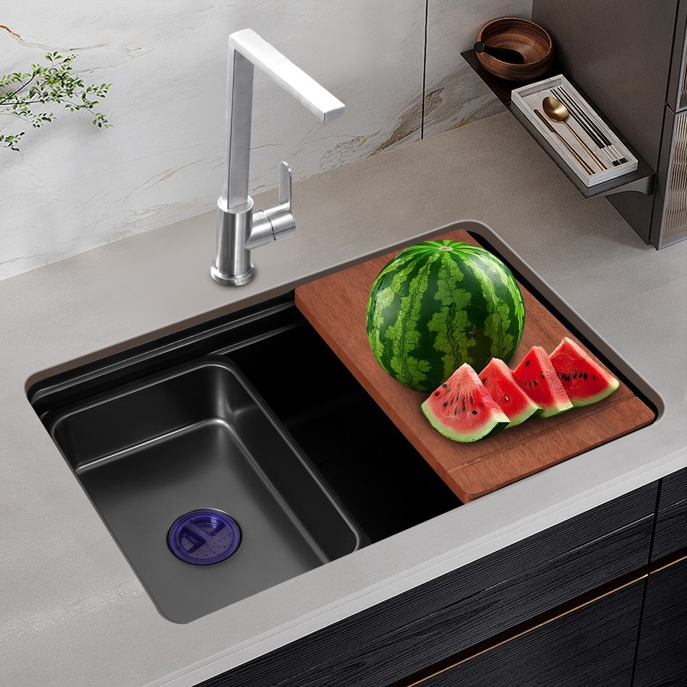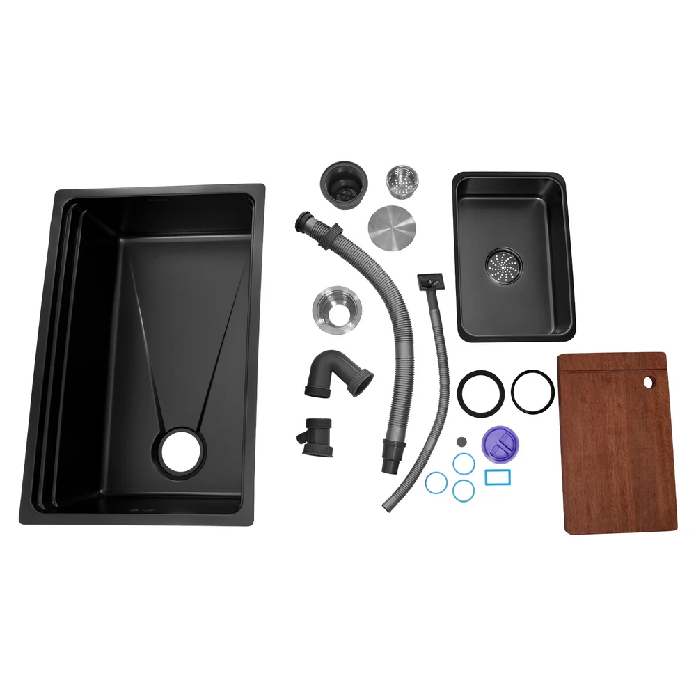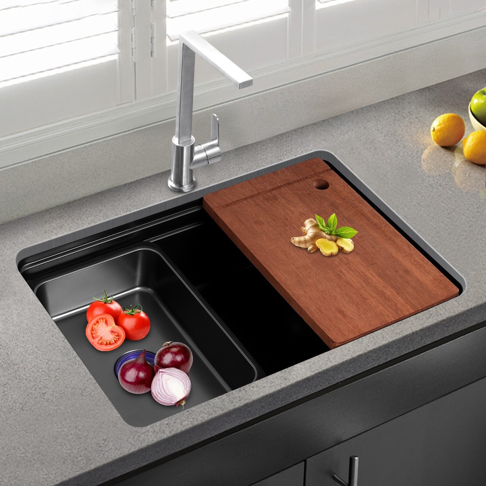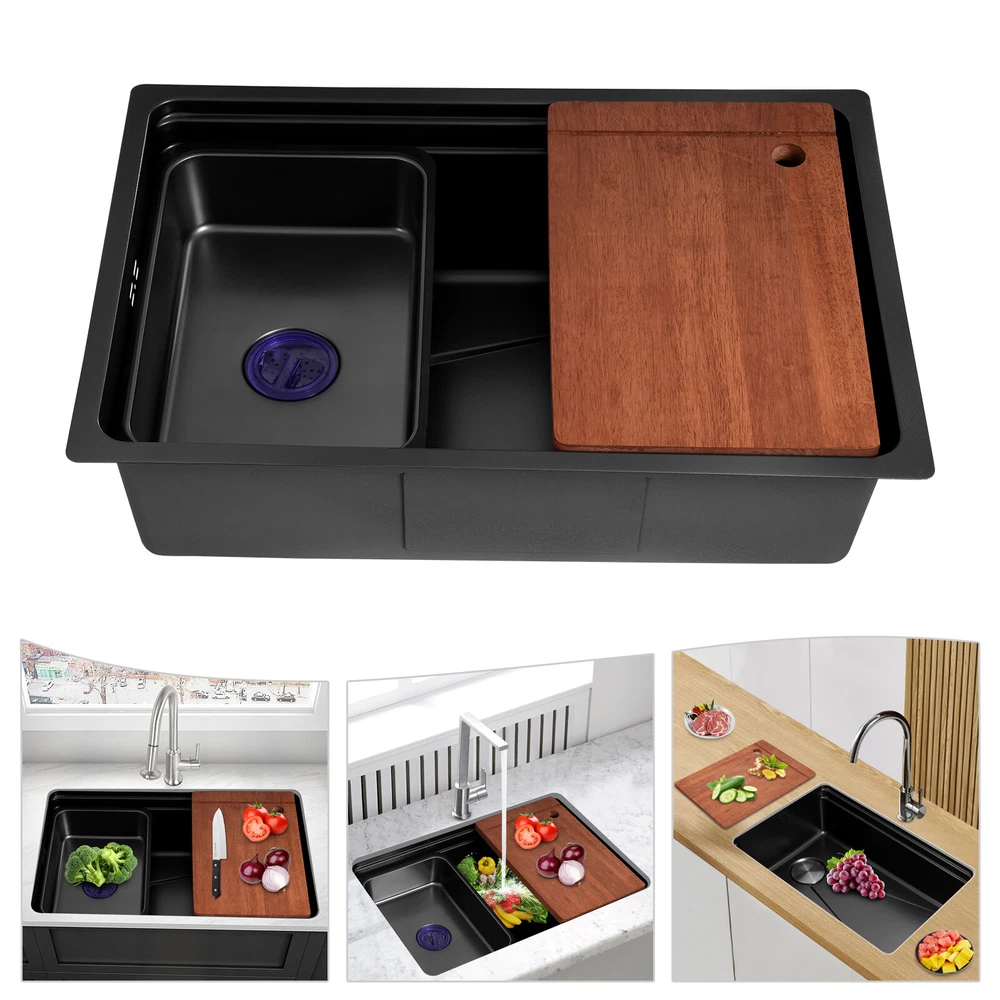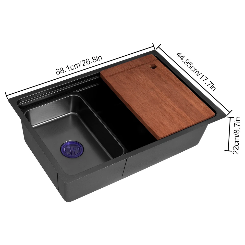 Application It can be suitable for quick use in commercial kitchens, but also widely used in homes, bathrooms, farms, backyards, garages, balconies, laundry rooms, indoor and outdoor, restaurants, bars, hotels, cafes, etc. It can be mounted either way above or below the counter top. Specification Style: Modern Color: Black Shape: Rectangular Drain Type: Grid Material: 304 Stainless Steel and Rubber Surface Treatment: One-piece Stretching Mounting Type: Above or Below the Counter Top Gross Weight: 10kg/22.05lbs Net Weight: 8.5kg/18.74 lbs Package Size: 73*52*27cm/28.74*20.47*10.63in Product Size: 68*45*22.1cm/26.8*17.7*8.7 in Package Included 1* Kitchen Sink 1* Chopping Board 2* Hoses 1* Inner Basin Other Accessories for Assembly Durable Kitchen Sink Double Basin Stainless Steel Sink Bowl W/ Chopping Board Description~~ Description What if there is not enough space in the kitchen sink? What do you do if the sink is always clogged and can't be cleaned all the time? Then I suggest taking a look at our kitchen sink with excellent material and easy cleaning features, which can easily solve the above problems and help you to create a more tidy kitchen. Key Features Last and Durable: Made of 304 stainless steel with a one-piece stretching process, it is not easy to fade, and can resist wear, corrosion, rust, impact, and deformation, so it can keep beautiful and practical indoors and outdoors . Thoughtful Design: The sloped bottom with a large drainage hole and V-shaped flow line allows water to flow to the drain promptly so that water does not accumulate at the bottom of the basin. In addition, the sound-absorbing rubber mat can effectively reduce the impact of water flow as well as reduce noise. The environmentally-friendly anti-vapour condensation spraying at the bottom prevents dripping and condensation, keeps the sink dry and avoids the deformation of the cabinet by moisture. Kitchen Assistant: Our product comes with a chopping board with a round hole for easy chopping; in addition, the removable inner basin makes it easy for you to clean your veggies, fruits, and more. The inner basin with a drain can be drained directly, which is convenient for you to use. Large Capacity: A large and deep (8.7-inch) sink provides enough space for cleaning, storage, and preparation for your daily use. Space Saving: The compact size (26.8*17.7*8.7 inches) and under-counter installation feature can save your kitchen counter space, creating a more convenient kitchen environment for you. Easy to Clean: Thanks to its smooth surface and simple construction, you can rinse and wipe with water at the same time, thus making it easy to clean. The R-shaped round corner of the basin eliminates the dead corner of dirt accumulation for easy cleaning. Complete Accessories: The combination of sink, hoses, chopping board, etc. can meet your various needs at once and also save you money. Quality Service: We stand behind all our guests and look forward to assisting you with your purchase. It is our pleasure to answer your confusion and questions. The end of the story between us is definitely not "we sell and you buy" Details Practical Hoses: They can help with smoother drainage . Well-designed Overflow Holes: They allow you to say goodbye to water spills and keep your kitchen as clean as possible. Filter Basket and Lid: Filter basket intercepts food scraps for easy disposal and prevents clogging. The lid helps block odors. Double-step Design: It allows you to easily place chopping board and drying rack. Application It can be suitable for quick use in commercial kitchens, but also widely used in homes, bathrooms, farms, backyards, garages, balconies, laundry rooms, indoor and outdoor, restaurants, bars, hotels, cafes, etc. It can be mounted either way above or below the counter top. Specification Style: Modern Color: Black Shape: Rectangular Drain Type: Grid Material: 304 Stainless Steel and Rubber Surface Treatment: One-piece Stretching Mounting Type: Above or Below the Counter Top Gross Weight: 10kg/22.05lbs Net Weight: 8.5kg/18.74 lbs Package Size: 73*52*27cm/28.74*20.47*10.63in Product Size: 68*45*22.1cm/ 26.8*17.7*8.7 in Package Included 1* Kitchen Sink 1* Chopping Board 2* Hoses 1* Inner Basin Other Accessories for Assembly Notes Please measure the size of the sink in your home before purchase . Please note that this product does not include a faucet. Please allow the slight color difference caused by the shooting light and 1-3cm error due to manual measurement, and make sure you do not mind before ordering. Payment Delivery details Terms of sales About us Contact us Payment We accept ebay payment 。 Fees such as import duties, taxes are not included in the item price or shipping costs. These charges are the buyer's responsibility. Delivery details Shipping: 2-9 working days to: USA Terms of sales We maintain high standards of excellence and strive for hundred percent customer satisfaction. Feedback is very important to us. We hope that you contact us immediately before you give neutral or negative feedback, so that we can address your concerns. It is impossible to address issues if we do not know about them! About us Your satis faction is our ultimate goal. We work hard to earn your trust and future business. Our certified technicians have tested each item before shipping. The unit comes with 1 year limited warranty on all manufacturing defects. a) If you receive a defective item, you may return it or ask for a discount. Please contact us within 14 days after you receive the package. b) What you returned must be intact and in its original packaging as re? u. Customer is responsible for shipping costs of the returned item. c) We will cover the cost of shipping back t with the shipping rate indicated in the registration page. We will send you a new unit or refund the full payment you paid. Thank you. Contact us Business Hour Business Hour: Monday To Friday: 8:30 AM to 5:00 PM (Beijing China time) Due to time zones, our r