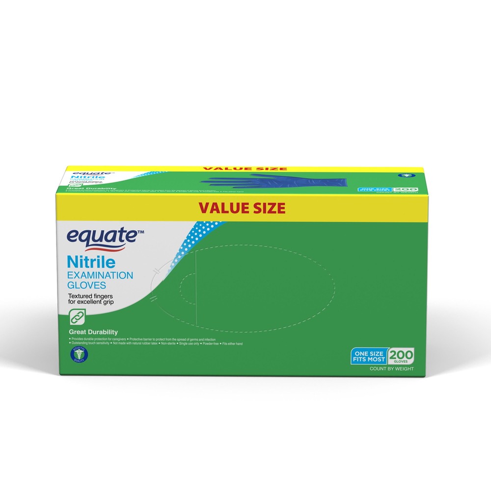 Protect your hands from dirt and grime with this box of 200 Nitrile Examination Gloves, One Size Fits Most. These medical quality gloves are not made with natural rubber latex, are non-sterile, powder-free, and meet industry quality standards. The natural fit of these gloves makes them comfortable to wear, they fit large and extra large hands, and one glove fits either left or right hands. Use these gloves to protect your hands when performing basic first aid, diabetic care, baby care, pet care, or while cleaning with harsh chemicals. Now you can easily safeguard your hands when it counts with Nitrile Examination Gloves, One Size Fits Most. Your family's health is one of the most important priorities in your life. Walmart's is now the innovative leader in the health, beauty, and personal care marketplace and is outperforming and exceeding the quality standards of many national brands. The brand has everything you need to keep your whole family feeling their best. Whether it's pain relief medication for unexpected situations or superior, tested products for hair or skin care, has you covered. With our Every Day Low Prices, it's easy to stock your bathroom cabinet with premium-quality essentials, even when you're on a budget! Protective barrier to protect from the spread of germs and infection Single use only, fits either hand Non-latex, powder-free, textured fingers for excellent grip Great protective barrier 200 count box