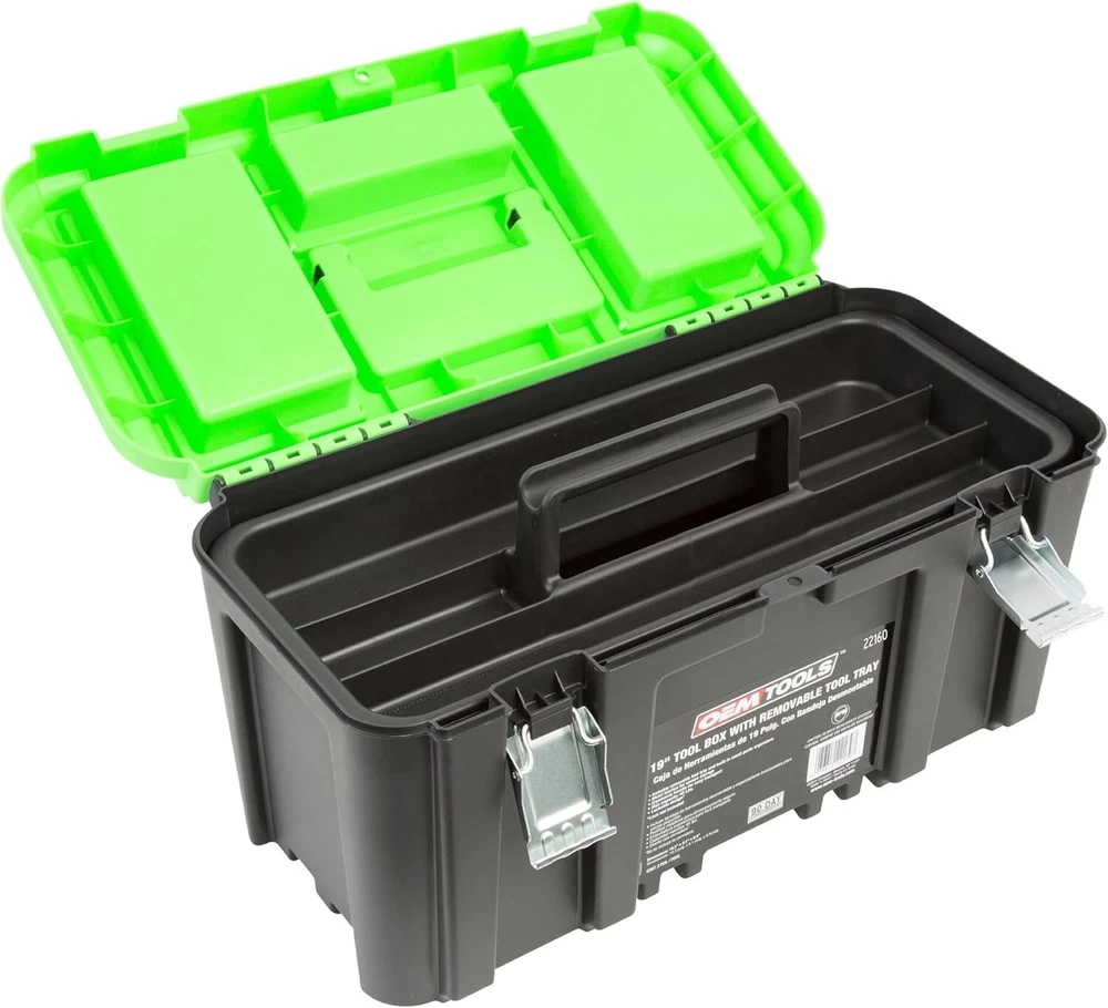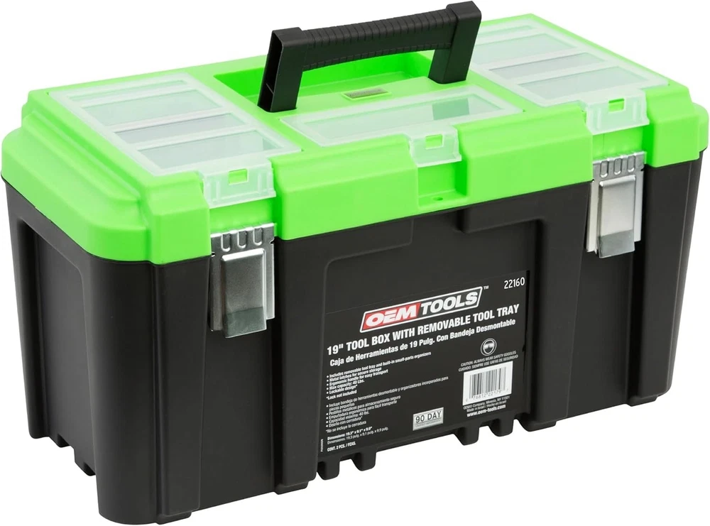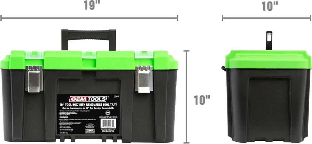 Product Dimensions: 19.25"l X 9.56"w X 9.38"h Pattern: Tool Boxes Item Diameter: 19 inches Type: Tool Box Item Package Quantity: 1 Size: Large Usage: Amateur, Professional Style: 19 Inch Tool Box gtin13: Does Not Apply Maximum Weight Recommendation: 40 Pounds Finish: Glossy Batteries Required?: No Number of Drawers: 0 Batteries Included?: No Material: Plastic Number of Items: 1 UPC: Does Not Apply Number Of Compartments: 5 Included Components: 19" Tool Box With Lid For Amz Water Resistance Level: Water Repellent Item Weight: 3.8 pounds Number Of Pieces: 1 Color: Black Capacity: 40 lb Features: With Handle, Removable Tray, Padlock Security Slot, Compartmental Lid, Water Resistant, Multi-compartment Design, Removable Dividers Brand: Unbranded