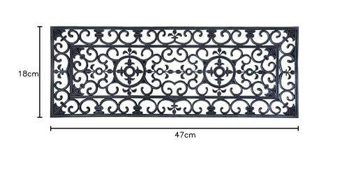 Make the best first impression at your front door with this doormat. It is durable and easy to clean with just a quick rinse under a garden hose. Large rectangular traditional rubber mat with elegant curls. Perfect For Placement At Any Door Entry; Great For Keeping The Dirt Outside While Adding A Decoration That Best Suits Your Style Doormat 46.605 Inch 17.55 Inch 0.702In Black Rubber With Scroll Work No Assembly Required