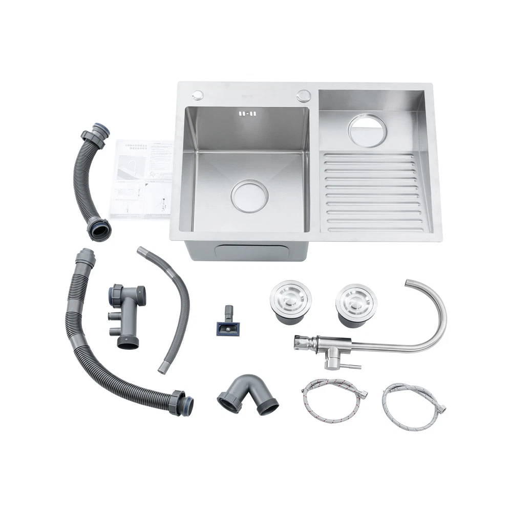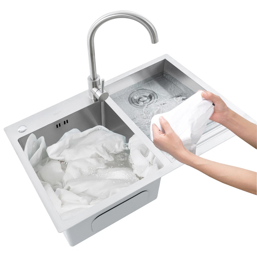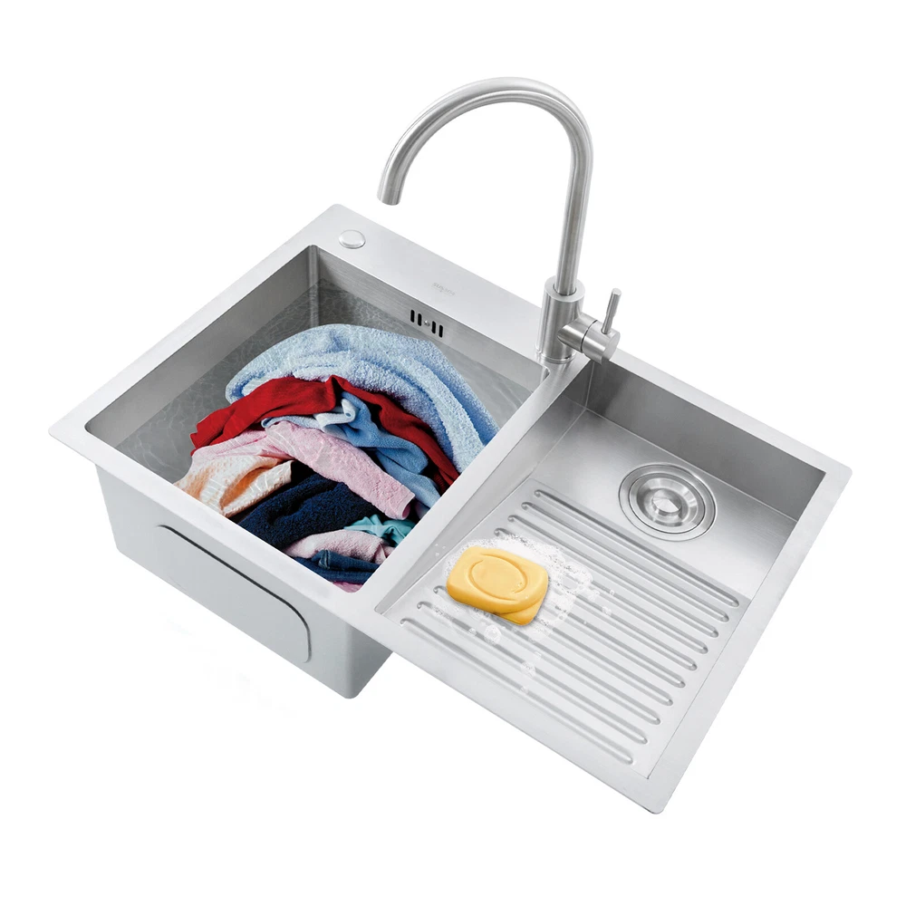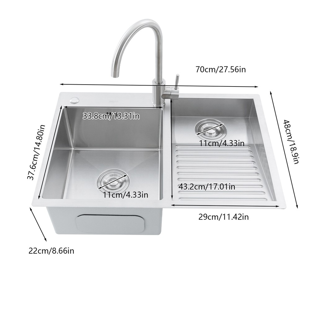 Drop-In Stainless Steel Double Bowl Kitchen, Bar and Laundry Utility Sink Description An Exceptional Laundry Sink Can Greatly Enhance the Washing Experience, Making It an Elegant Ritual in Life. It Is Not Only a Practical Assistant in Household Labor but Also an Indispensable Part of Home Aesthetics. with Its Durability and Functionality, the Well-selected and Cleverly Designed Laundry Sink Turns the Tedious Cleaning Work into a Leisurely Time. Package Included 1* Laundry Sink 1* Faucet 1* English and Chinese Manual All Accessories for Installation Key Features Build to Last: the Laundry Sink Is Mainly Made of 304 Stainless Steel with a Wire Drawing Process, with High Hardness, Wear Resistance, and Impact Resistance , so It Can Be Adopted in some Humid Environments Such As Laundry Rooms and Kitchens. 2-in-1 Design: the Product Adopts a Double Basin Design. on the Left Side, There Is a 13.31*14.8*8.66-Inch Laundry Basin That Allows You to Easily Soak, Rinse, and Scrub Large Clothes, While the Tilted Wave Washing Board on the Right Effectively Removes Stubborn Stains and Helps You Quickly Clean Clothes. Quick Drainage: the X-shaped Water Guiding Lines and Two 4.33-Inch Diameter Drains Allow You to Drain Water Quickly and Easily. in Addition, the Washboard with a Slope Design Is Easy to Use and Optimizes Drainage. Nice Partner: the 360° Rotatable Faucet with 2 Hoses Can Connect Cold and Hot Water, Allowing You to Use Water at a Suitable Temperature Throughout the Year While Ensuring Easy and Thorough Cleaning. Thoughtful Design: It Has an Additional Acoustic Pad on the Bottom to Eliminate Excess Noise and Vibration, Creating a Quiet Kitchen, Laundry, or Utility Room Environment for Your Family. Meanwhile, the Anti-condensation Layer Prevents Moisture Buildup from Damaging Kitchen Cabinets. Easy to Clean: the Smooth Stainless Steel Surface Can Be Kept Clean by Wiping It with a Soft Cloth and Neutral Soap. the Round Corner of the Basin Eliminates the Dead Corner of Dirt Accumulation for Easy Cleaning. the Drainage Strainer Intercepts Food and Debris for Easy Disposal and Prevents Clogging. Fashionable Appearance: the Smooth Silver Surface Makes It Look Modern and Fashionable, and Can Blend with Different Decorative Styles to Add a Touch of Decoration to Your Space. Simple Installation: Complete Installation Accessories, a Simple Structure, and a Detailed Chinese and English Manual Allow You to Complete the Assembly in a Short Time. Pre-drilled Holes: the Pre-drilled Holes on the Product Make It Easy for You to Install the Faucet. Overflow Holes: the Anti-spill Holes Can Reduce the Risk of Overflowing Water to Avoid Wasting Water and Soaking the Floor. Round Edges: Smooth, Burr-free Edges Are Not Only Comfortable to Touch but Also Prevent Scratching Your Skin and Clothes. Application It Applies to Laundry Rooms , Bathrooms, Garages, Basements, Balconies, Courtyards, Gardens, Etc. Specification Color: Silver Style: modern Shape: rectangular Assembly Required: Yes Material: 304 Stainless Steel Process: Wire Drawing Mounting Type: Drop-in, Top-mount, or Under-mount Left Basin Size: 33.8*37.6*22cm/13.31*14.8*8.66in Right Washboard Sink Size: 43.2*29cm/17.01*11.42in Each Drain Diameter: 11cm/4.33in Interface Size of Water Inlet Pipe: 1/2" Product Size: 70*48*22cm/ 27.56*18.9*8.66in Package Size: 76*53.5*27cm/ 29.92*21.06*10.63in Drop-in Installation Suggested Countertop Opening Size: 67*45cm/26.4*17.7in Undermount Installation Suggested Countertop Opening Size: 66*44cm/25.6*17.3in Gross Weight: 11kg/24.25lbs Net Weight: 10kg/22lbs Notes Please Measure the Opening Size of the Base Cabinet in Advance so That the Item Can Be Installed Smoothly. Please Read the English Installation Manual Carefully Before Use and Pay Particular Attention to the Safety Instructions Contained Therein. Please Allow the Slight Color Difference Caused by the Shooting Light and the 1-3 Cm Error Due to Manual Measurement, and Make Sure You Do Not Mind Before Ordering. Payment Delivery details Terms of sales About us Contact us Payment We accept ebay payment 。 Fees such as import duties, taxes are not included in the item price or shipping costs. These charges are the buyer's responsibility. Delivery details Shipping: 2-9 working days to: USA Terms of sales We maintain high standards of excellence and strive for hundred percent customer satisfaction. Feedback is very important to us. We hope that you contact us immediately before you give neutral or negative feedback, so that we can address your concerns. It is impossible to address issues if we do not know about them! About us Your satis faction is our ultimate goal. We work hard to earn your trust and future business. Our certified technicians have tested each item before shipping. The unit comes with 1 year limited warranty on all manufacturing defects. a) If you receive a defective item, you may return it or ask for a discount. Please contact us within 14 days after you receive the package. b) What you returned must be intact and in its original packaging as re? u. Customer is responsible for shipping costs of the returned item. c) We will cover the cost of shipping back t with the shipping rate indicated in the registration page. We will send you a new unit or refund the full payment you paid. Thank you. Contact us Business Hour Business Hour: Monday To Friday: 8:30 AM to 5:00 PM (Beijing China time) Due to time zones, our reply to your questions may not be immediately. But within above working time, we will reply your email within 24 hours. If it's non-workdays, please kindly be patient and wait till Monday. Please contact us with ebay message. Please feel free to contact us if you have any questions. Monday To Friday: 8:30 AM to 5:00 PM (Beijing China time) Due to time zones, our reply to your questions may not be immediately. But within above working time, we will reply your email within 24 hours. If it's non-workdays, please kindly be patient and wait till Monday. 
