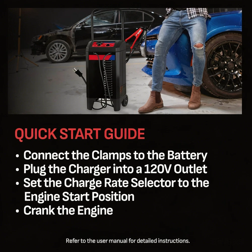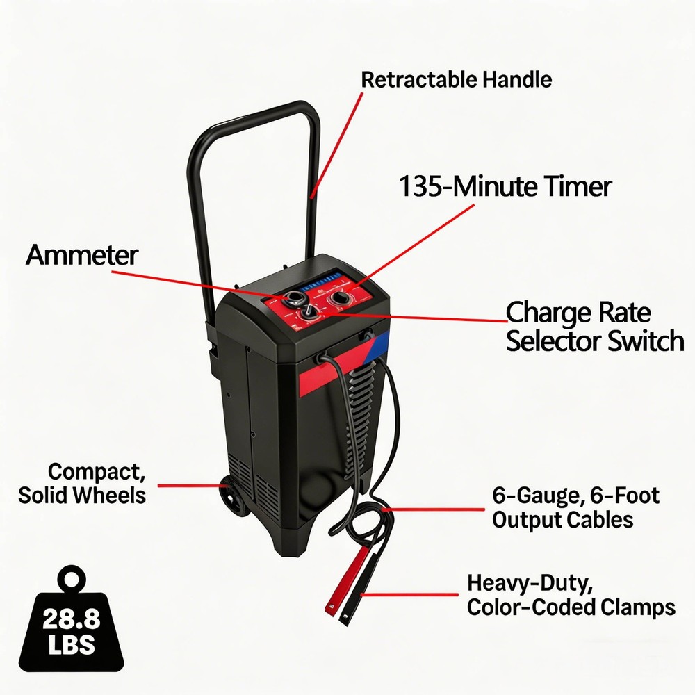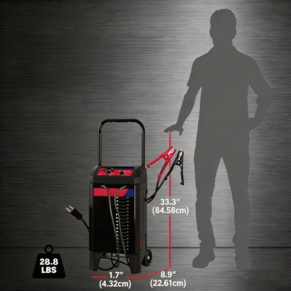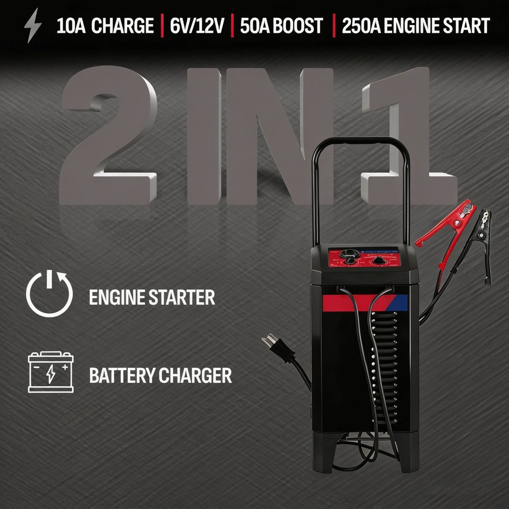 Wheeled Manual 10A Car Battery Charger and 250A Engine Starter, 2-in-1 Solution, 50A Boost, for 6V/12V Power Sport, Automotive, and Marine Batteries, NOTICE: Open box item. May have slight handling wear but remains in 99.9% new condition. Fully tested and operational. Purchase only if you accept this condition. Due to the large size and weight of the product, it may get bumped during transportation, but this will not affect its normal use. Is this a manual or automatic charger? The item is a completely manual battery charger and jump starter. You must manually set the charge rate and use the timer to set the length of charging. Charging can be monitored via the built-in ammeter. What kinds of batteries will the charge? You can use the item to charge 6-volt and 12-volt standard, AGM, gel, and deep-cycle batteries. The jump start feature can only be used on 12-volt batteries. Does the item have an internal fan? Yes, the item has an internal fan that prevents the unit from overheating. How do I use the engine start feature? With the timer in the Off position, connect the battery clamps. Then, plug the item into a wall outlet. Next, set the charge rate selector to the Engine Start position. Finally, crank the engine. Experience the power of serious garage equipment with the Manual 10A Car Battery Charger and 250A Engine Starter. Engineered for the garage that handles it all, the item offers a robust 2-in-1 solution for starting and charging. When raw power is required, the 250-amp engine start delivers the peak amps necessary to turn over large engines in cars, SUVs, trucks, and farm equipment instantly. For batteries that need a quick revival, the 50-amp 12V boost charge mode minimizes downtime, getting you back on the road or water faster. The unit also features a 25-amp boost for both 6V and 12V systems and a 10-amp charge mode for steady charging. Unlike automatic chargers that make decisions for you, the item puts the control completely in your hands. The precision manual timer allows for up to 135 minutes of controlled charging, ideal for mechanics who understand the specific needs of their battery type. Monitor your progress at a glance with the clear, easy-to-read analog ammeter, ensuring your maintenance routine is precise and effective. Durability is non-negotiable for discerning consumers. That's why this charger is housed in a heavy-duty steel case designed to withstand the rigors of a busy environment. Equipped with a retractable handle and compact, solid wheels, it offers easy mobility around the garage or driveway. The front-mounted heavy-duty clamps and 6-foot power cord provide the reach and connection quality needed for serious work. Compatible with standard, AGM, gel, and deep-cycle batteries, this charger is the versatile workhorse your collection demands.