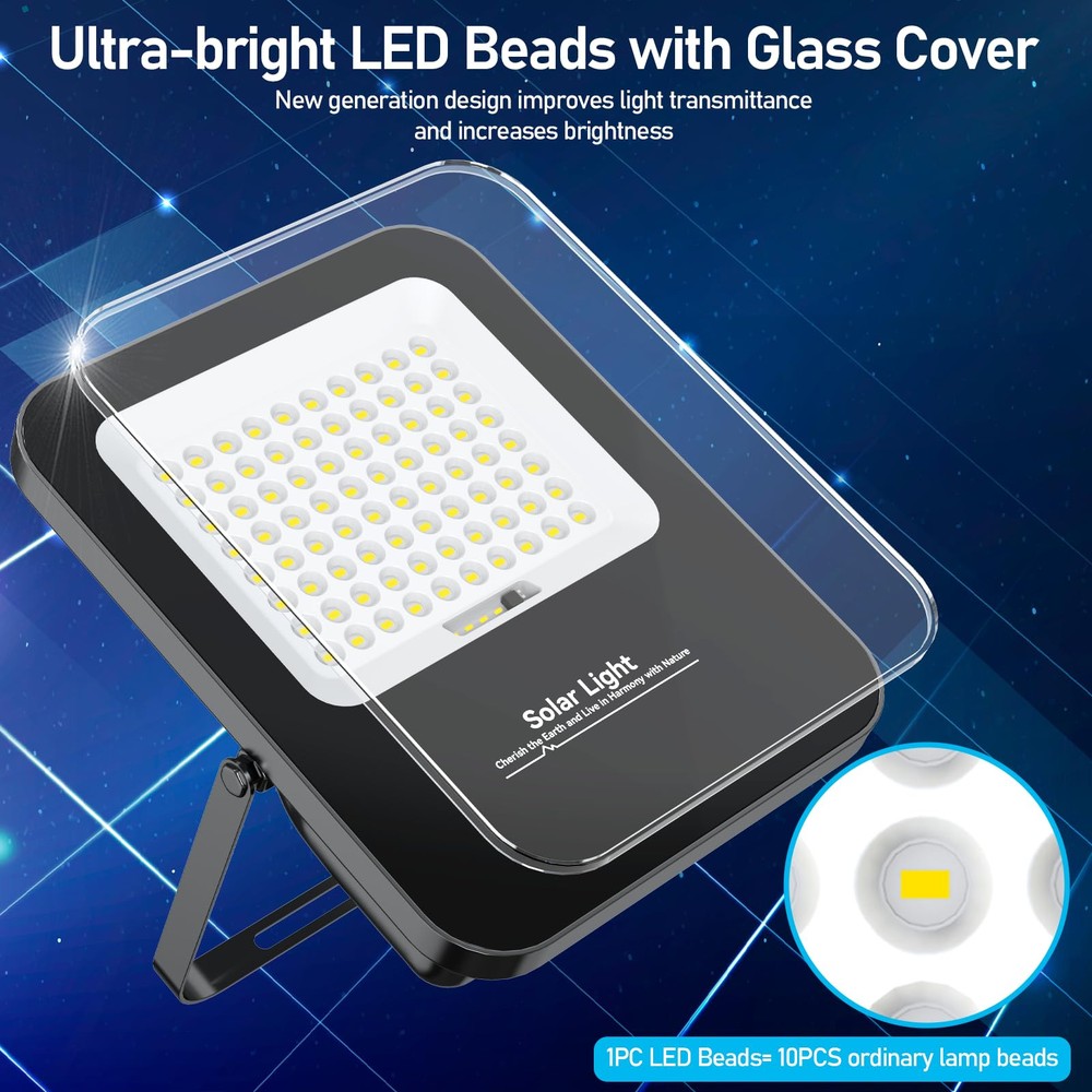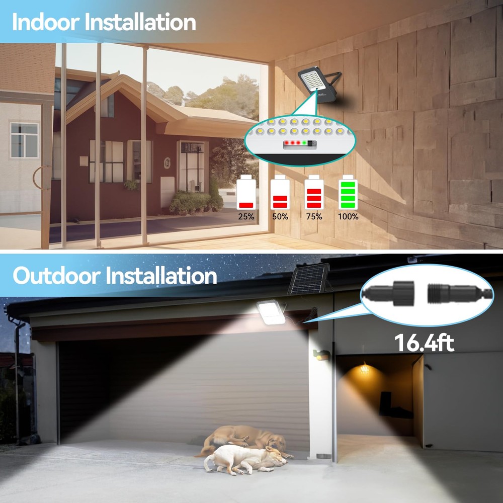 180° Adjustable Angle: The lighting angle of the hanging street light can be adjusted up and down 180°, you can easily adjust to different lighting angles according to your needs. Indoor lighting can be achieved through a 16.4 feet cable between the floodlight and the solar panel, and can be used for both indoor and outdoor lighting IP67 Waterproof Level: Our solar flood lights outdoor are designed to be waterproof and weatherproof to withstand rain, snow and other harsh weather. Ensure optimal performance and reliability of solar street lights in different weather conditions Motion Sensor: Solar-powered security lights equipped with motion sensors offer added safety and security by illuminating outdoor spaces when motion is detected. This deters intruders and improves visibility during nighttime.100% brightness when the object is in motion, 50% energy-saving brightness when the object is out of the way 0 Electricity Bill: Solar lights typically have fewer components compared to traditional lighting systems, resulting in lower maintenance requirements. With no wiring or cables to manage, maintenance costs and efforts are significantly reduced.Especially in remote or off-grid areas where access to electricity may be limited or costly. They offer a reliable lighting source without the need for grid connection Easy Installation: Solar lights are easy to install since they don't require complex wiring or trenching. This makes them suitable for various applications, including outdoor lighting for gardens, pathways, parks, fence,yard and streets