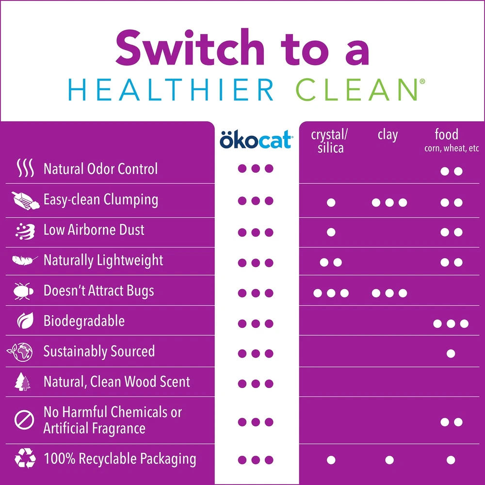 Spend less time sweeping with this premium natural litter that's cleaner and healthier for your cat, family and home. less mess clumping litter is made from dense, mini-pellets that are soft on paws, and less likely to scatter out of the litter box or track through the house like finer litters. It's also a great choice for long hair cats. is relentless at controlling odor, along with a fresh natural scent reminiscent of the great outdoors. Made entirely from sustainably sourced, responsibly rescued natural wood fiber, offers the brilliance of European engineering for a better performing litter without added fragrance, synthetic chemicals, toxic dyes or GMOs. öko is German for eco or ecological, meaning green or organic. all natural cat litter is made from 100% reclaimed wood that comes from the earth and can be returned to the earth since it's completely biodegradable, unlike clay litter. Keep the spaces you share with your cat healthy and clean, without dirty clay dust or additives. Next generation plant-based cat litter that's cleaner and healthier for your cat, family and home with mini-pellets that are less likely to scatter out of the litter box. LITTER THAT LASTS LONGER: Fast and furious absorption means no liquid ever gets to the bottom of the litter box. With regular scooping, litter can last up to 7 weeks. NATURALLY LIGHTWEIGHT: Easy lifting, pouring and disposal. NO artificial fragrance, NO synthetic chemicals, NO toxic dyes, NO GMOs BIODEGRADABLE & FLUSHABLE: Made from sustainably sourced, responsibly rescued natural wood fiber that can be safely returned to the earth. Just scoop & flush one clump at a time. CLUMPS SOLID FOR EASY SCOOPING: Precision-cut fiber absorbs liquid on contact to form solid clumps for easy scooping & cleaning. 99% DUST FREE FOR A HEALTHIER HOME: Clean wood fiber is screened & de-dusted for a cleaner pour. No dirty clay dust. STOPS ODOR BEFORE IT STARTS: Wood fiber naturally prevents enzymes from bonding with liquid & waste to stop the creation of ammonia & odor.