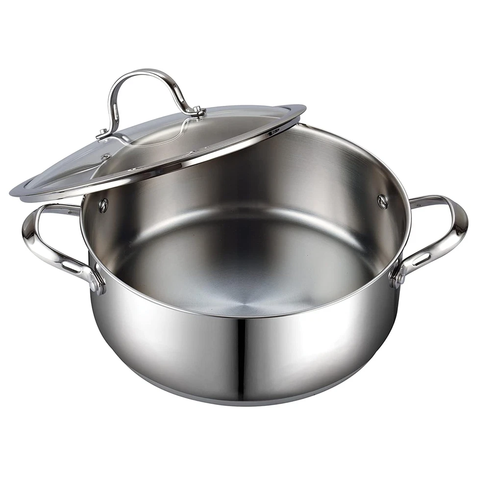 The 7-Quart Classic Stainless Steel Dutch Oven Casserole Stockpot with Lid is made with 18/10 stainless steel with an aluminum disc layered in the bottom. The aluminum disc bottom provides even heat distribution and prevents hot spots. Tempered glass lid with steam hole vent makes viewing food easy. Stainless steel riveted handles offer durability. Induction compatible. Works on gas, electric, glass, ceramic, etc. Oven safe to 500F, glass lid to 350F. Dishwasher safe. Well Made: 7 quart dutch oven is made of 18/10 stainless steel, which is resistant to corrosion, high temperatures, and deformation Even Heating: Dutch oven features an impact-bonded aluminum disc in the bottom; The aluminum core ensures quick, even heat distribution with no hot spots Multi Purpose: Dutch oven pot with lid 7 quart great for soups, making sauces, stews and noodles Ergonomic handle: Stainless steel pot equipped with tempered glass lids and steam vent that allow steam to escape for viewing food while cooking; Riveted stainless steel handle with air flow technology is durable, comfortable to hold and stays cool Compatible with All Stovetops: Dutch oven pot works on induction, gas, electric, glass, ceramic, and more; Dishwasher safe and oven safe up to 500℉