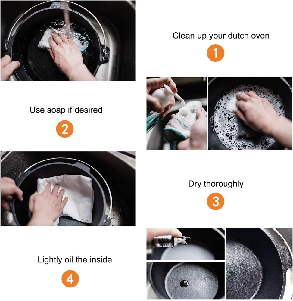 All-round Dutch Oven. The integral legs on both pot and lid allow the oven to sit perfectly over the campfire; the lid can also be used as a skillet for frying. Moreover, cast iron pots are not coated in toxic chemicals. It is a safe non-stick surface. Well known as a Lifetime Pot. Compared with pots of other materials, the Dutch Oven is made of high quality cast iron, and will last a lifetime if cared for properly. It can be used both on the stove and in the oven at home, providing value for money. Energy-saving and therefor good for the environment. Heat is evenly distributed and held, making it great for deep frying, searing and baking. It also has the advantages of great heat insulation and a good seal, so even a novice camper can do a delicious roasted chicken with this pot. Considering the considerable weight of cast iron, equips a lid lifter for the Dutch Oven. The durable handle also allows you to hang it over the open fire. Our Logo design of an eagle on the lid means, freedom, power, strength and desire for life. Once you are finished cooking, cleaning and after care are simple. Make sure to dry the pot completely after cleaning and whilst the pot is still warm, lightly oil the inside of the pan with your oil of choice, a thin coat is all you need. Use a cloth or paper towel to rub off any excess. are dedicated to providing the best sporting experience for the new generation of outdoor sports enthusiasts. Please feel free to get in touch if you have any issues with the equipment.
