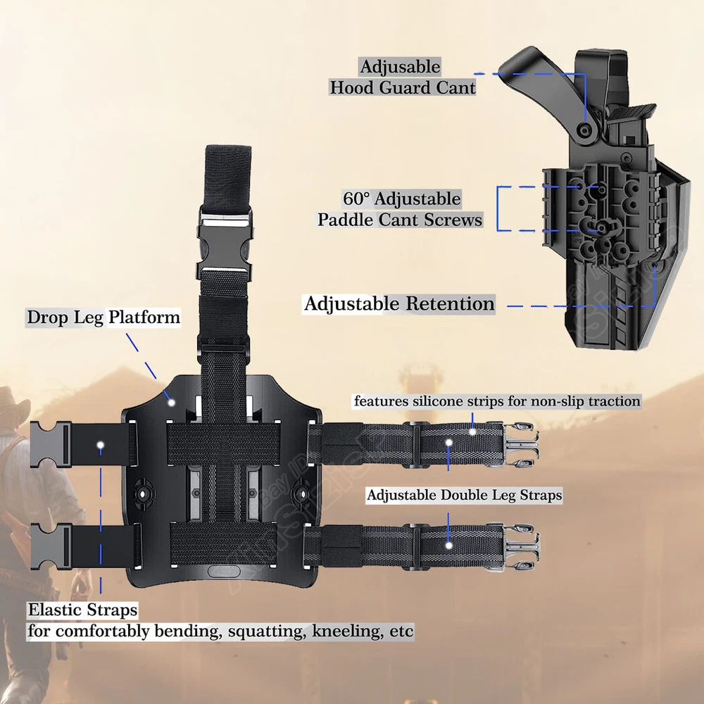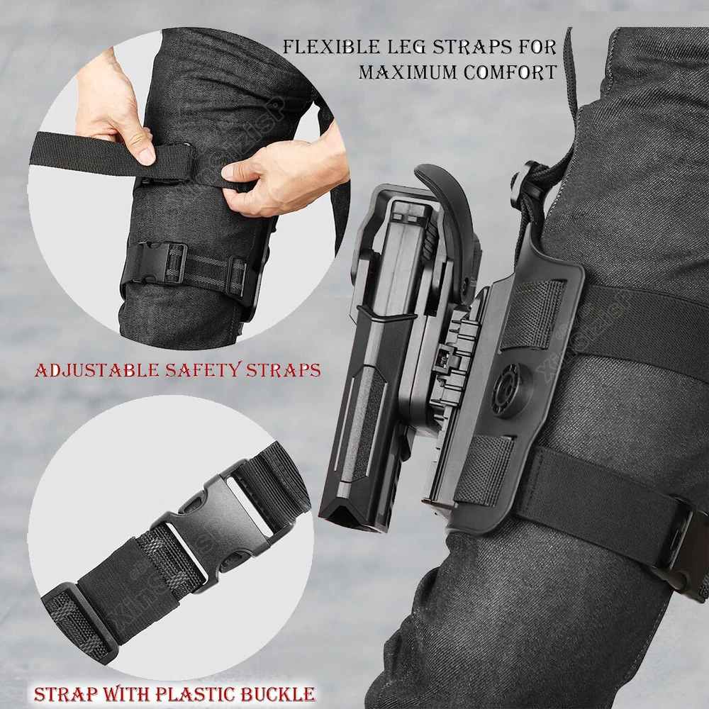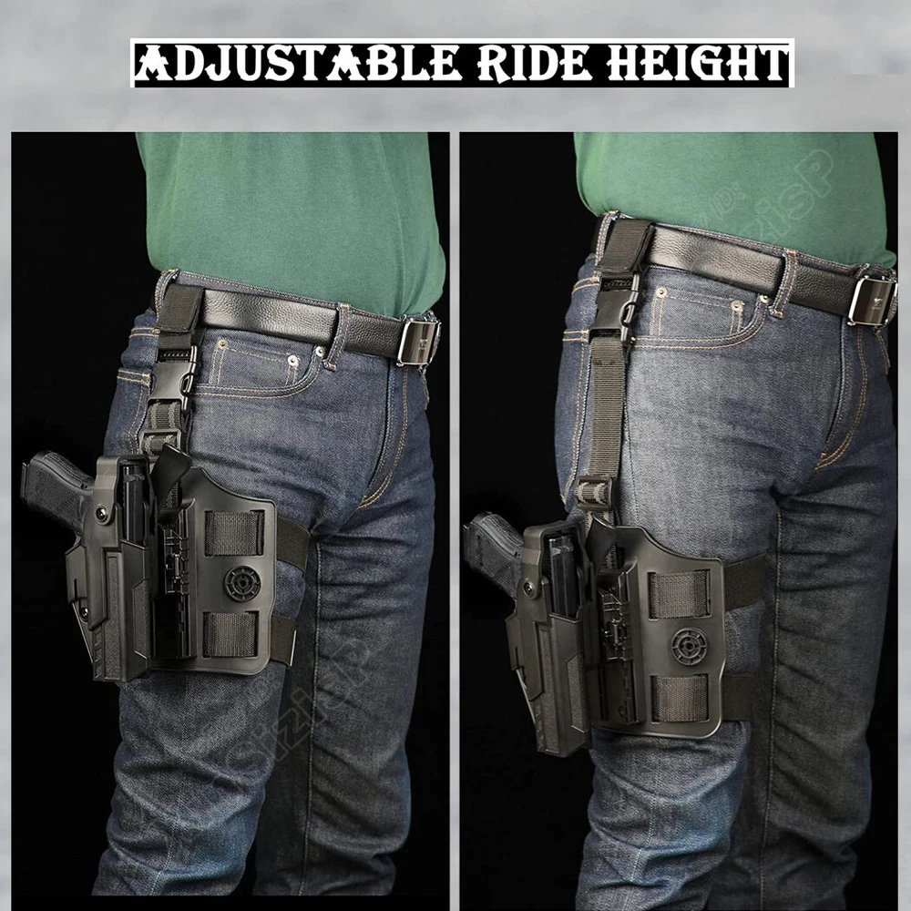 High Quality Military & Police Grade Polymer OWB Holster Specially Designed For Fast Draw During Duty Or Shooting Competition. Weapon Compatibility - Outside Waistband Tactical H olster with Drop Leg H olster Fit Glock 17 (Gen 1-5) 9mm Glock 17L (Gen 1-3) 9mm Glock 19 (Gen 1-5) 9mm Glock 19X 9mm Glock 22 (Gen 1-4) (.40 S&W) (Not fit Gen 5) Glock 23 (Gen 1-4) (.40 S & W) (Not fit Gen 5) Glock 31 (Gen 1-5) (.357 SIG) Glock 32 (Gen 1-5) (.357 SIG) Glock 44 (.22 LR) Glock 45 9mm ( Without laser, embedded chassis, or flashlight style. ) Level 3 retention duty gun holster features two locking systems: The thumb-activated retention hood and the Auto-locking system; - The Thumb-activated retention hood slides over the rear of the gun to lock it into place. - Auto-locking system will automatically lock and hold your firearm safely once holstered. Quick Holster Mounting: Quick mount the holster on the drop leg platform or detach it from the platform. This drop leg tactical holster comes with the quick-mounting system that allow the users to attach(detach) and lock the holster on the drop leg platform quickly while adjusting the ride hight. Make a natural Fast Draw & Retention Adjustment: The thumb-activated button of these two locking systems is right in the position where your thumb will naturally come to rest as you acquire your shooting grip to activate and make a natural quick draw. You can make your ideal retention by simply adjusting the retention screw. No rattles with this holster. Drop Leg Platform Features: 1. Perfect platform size with fully adjustable double leg straps conforms to any leg size; 2. The double leg straps feature silicone strips for non-slip traction and each leg strap has a little part of elastic for comfortably bending, squatting, kneeling, jogging, running, sitting, driving, etc; In the Package: · 1*Holster with Paddle Attachment and straps · 1*Allen Key Shipping: Ships same day or next except Sundays and Holidays ! Free shipping! Ship by USPS First Class Package. 100% MONEY BACK GUARANTEE. Any question please be free to contact with us .Thanks!