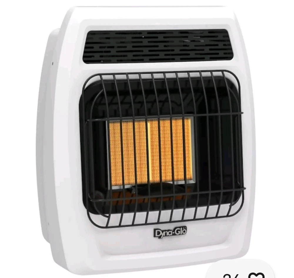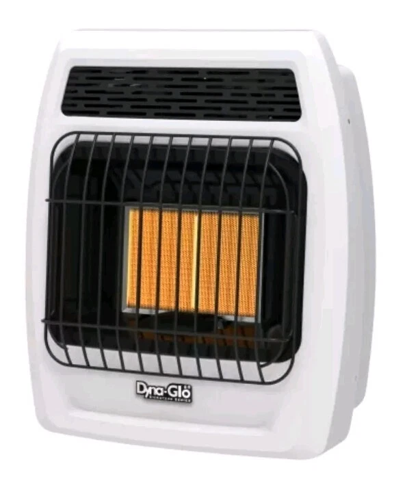 This Dyna-Glo infrared vent-free wall heater is a reliable and efficient way to provide warmth to your home. With a power source of gas and a heating element of brass, this portable heater has a heating system that uses coils and produces less than 2000 BTU. It has one heat setting and an auto shut-off feature, making it safe and easy to use. The white color and aluminum and brass materials add to the appearance of this heater, which can be mounted on a wall in any room. It has a voltage of 12 V and an annual fuel utilization efficiency of less than 80%. This heater ships fast!