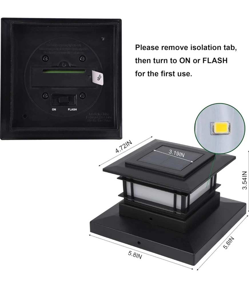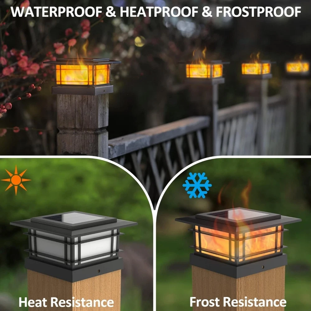 PLASTIC DANCING FLAME SOLAR POST LIGHTS: 8 pack modern post cap lights powered by solar, each with 72 pcs yellow SMD LED, they are the perfect decorative outdoor lighting and no electricity required. Solar LED flickering flameless candles lights, add a 360 degree viewing angle illuminate charming to your garden, decorate your fence, deck, porch or yard. Measurement: 5.8 x 5.8 x 3.54 inches DANCING FLAMES LIGHTS: A safe alternative to the real flame effect - 72 pcs high brightness SMD LEDs cast a safe, soft and gentle glow, produces a very calm and impressive atmosphere. When night comes, it lights up and the LED flame light leaping, which will bring you a beautiful scenery. There are 2 LIGHTING MODE - FLAME and ON, if you want flame effect, please turn to FLAME. Please note that they are designed for outdoor decoration, maybe not bright enough, but the light is soft and gentle SOLAR POWERED: This beautiful solar light is NOT electricity needed. Powered by solar, charged in full and direct sunlight for 6-8 hours. There is a tab at the back of the solar panel, please remove it before charging, so that this solar LED lights will automatically turn on at night and turn off at dawn. For your convenience, each include 1000MAH NI-MH AA rechargeable battery EASY TO ASSEMBLE: Complete with detailed instructions. Our fence post solar lights come with different sizes of bases, which are compatible with any standard true size 3.5"x3.5", 4"x4", 4.5"x4.5", 5"x5", 5.5"x5.5" wood / vinyl / plastic post cap. These solar garden lights can be done in a few minutes, comes with mounting kit, simply screw the solar cap lights into highest point on the railing OUTDOOR DECORATIVE LIGHTS: These 8 pack garden flickering flame post lights can work normally under kinds of weather with the waterproof rating of IP44, no worries about little rain, snow, frost, or sleet. They can be placed in the front, backyard, along driveway, walkway, sidewalk, around your patio or porch, adds a modern look for your outdoor lighting. In stormy weather, keep the solar lights indoors to avoid damaging the solar panels