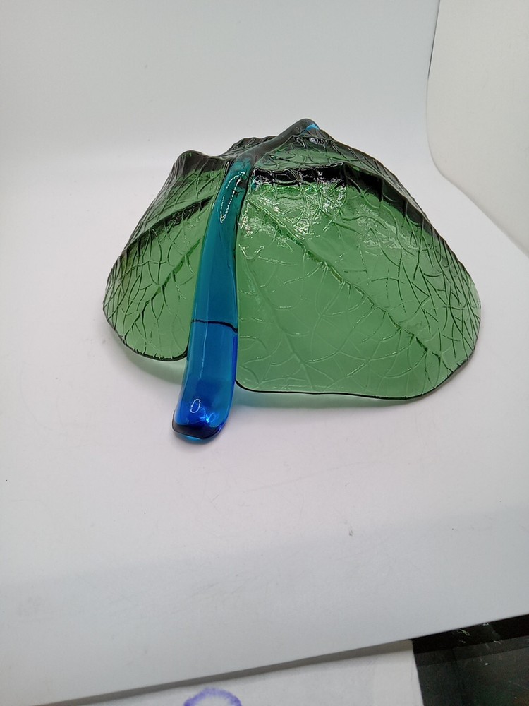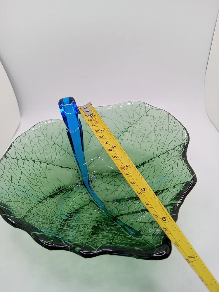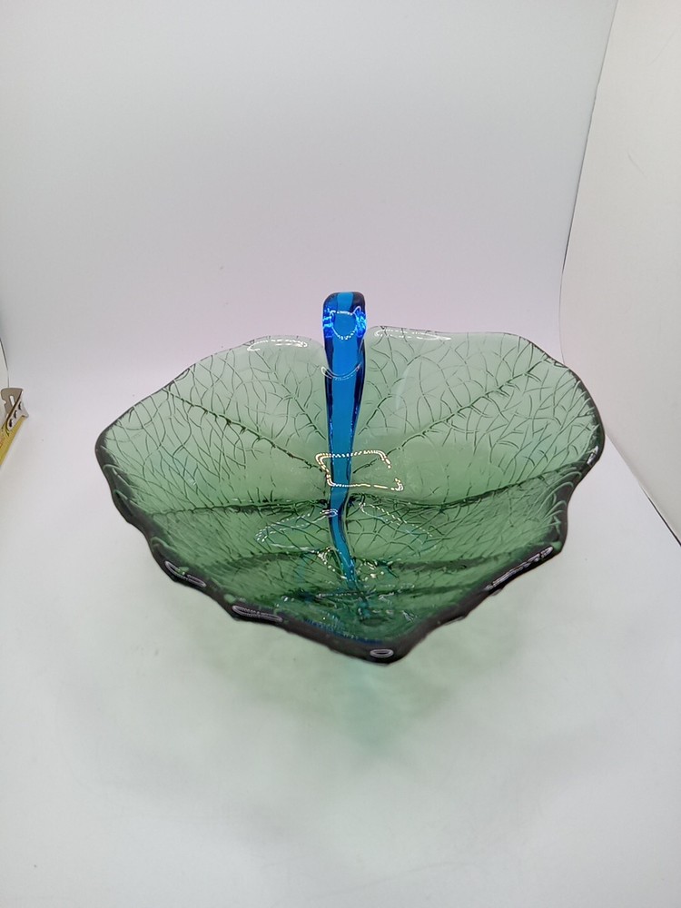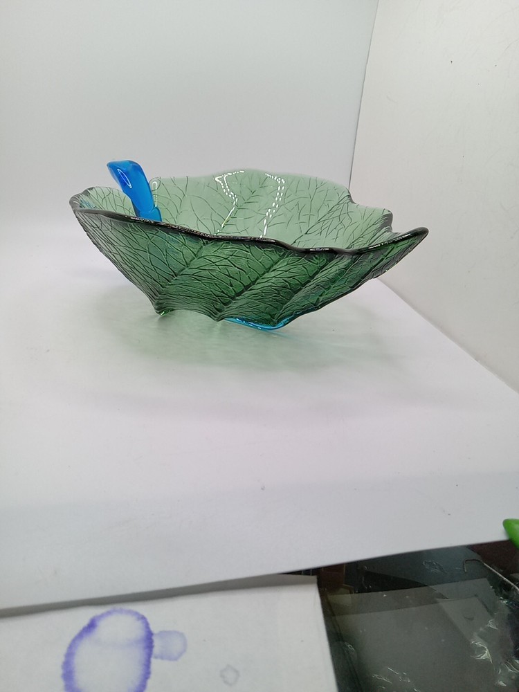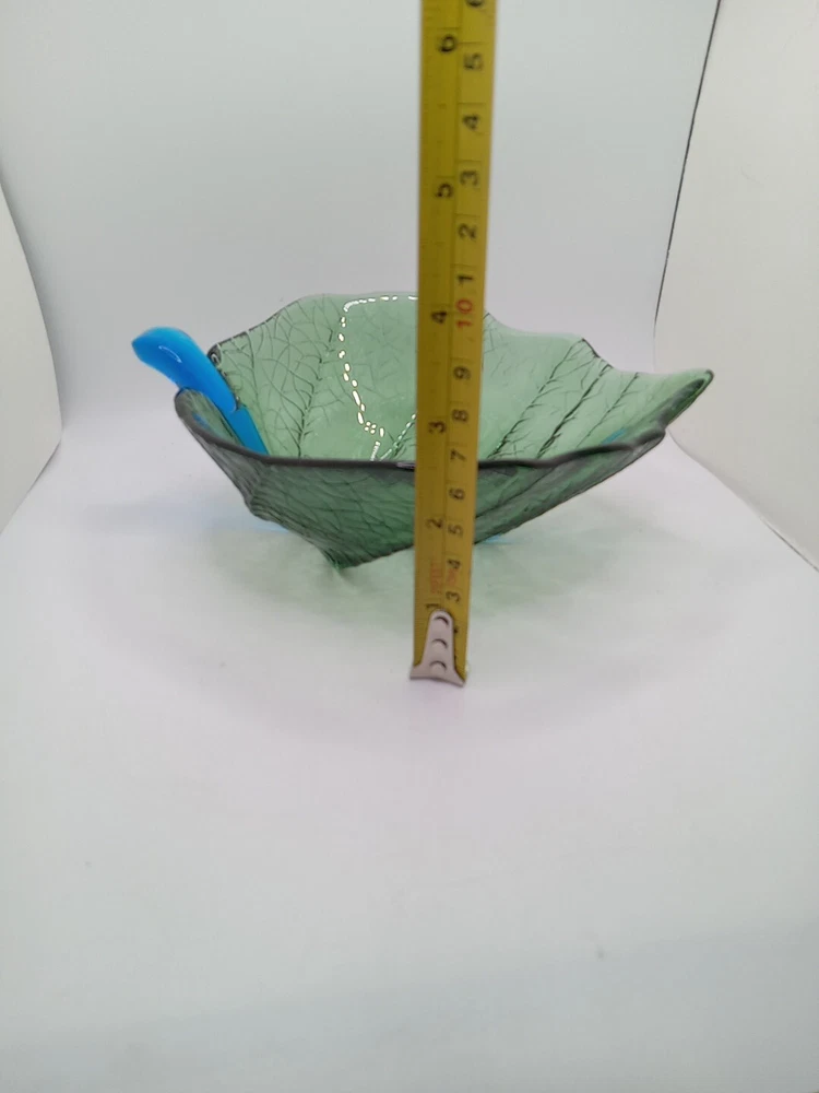This beautiful Dynasty Gallery Serving Bowl is perfect for any occasion. Its vintage/retro style and shiny finish make it a great addition to your dinnerware collection. The bowl features a lovely green color with a blue stem and a grapevine leaf pattern. Measuring 2.5 inches in depth and 6.5 inches in width, this small leaf bowl is perfect for serving snacks or small dishes. The bowl is made of high-quality glass and is suitable for all occasions. Add this unique piece to your collection today! No chips or cracks, please see my other auctions for my other thrift store finds.