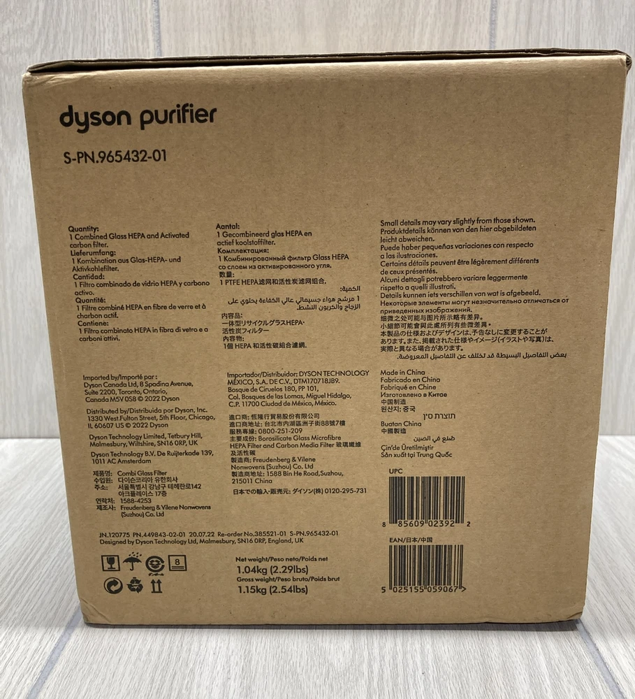 Keep your home environment clean and healthy with this Dyson Purifier Replacement Filter 965432-01. This top-quality replacement filter is designed to capture all allergens and contaminants in the air, making it ideal for use in any room. With a combination of activated carbon and HEPA technology, this filter ensures clean and fresh air circulation in your home. This Dyson replacement filter is easy to install and has a lifespan of up to 12 months. It is compatible with Dyson Purifiers and has a weight of 1.0 kg. Its features include quiet operation, 360° glass design, and three cleaning stages. This unit comes with one filter and is perfect for whole-room use.