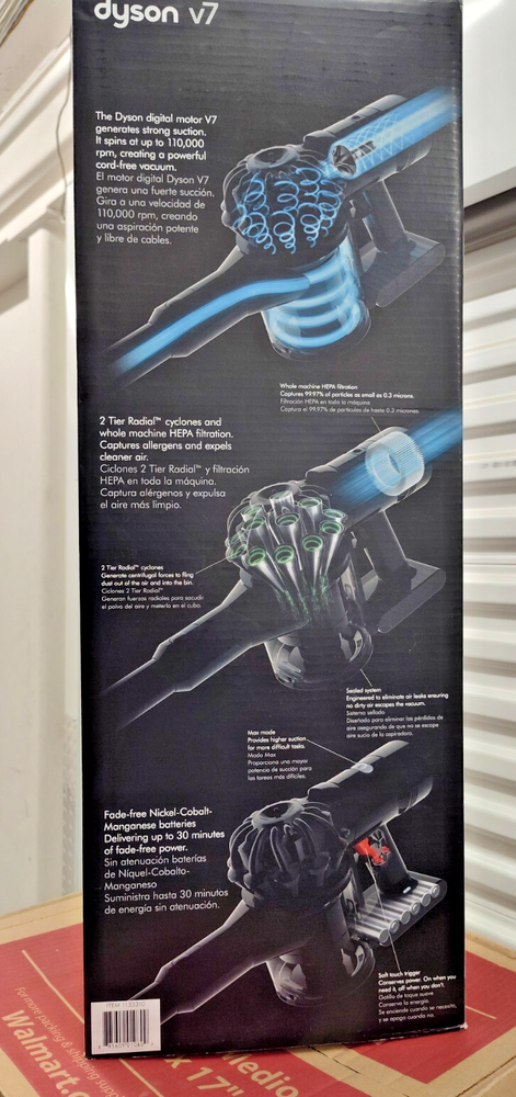 Easily reaches up high, Hygienic bin emptying, Powered by the Dyson digital motor V7, Quickly transforms to a handheld, Soft dusting brush, 2 Tier Radial™ cyclones, Up to 30 minutes of fade-free power in Powerful mode and up to 20 minutes with motorized cleaner-head., Combination tool, Docking station, Whole machine filtration, Crevice tool, Mini motorized tool, Two power modes