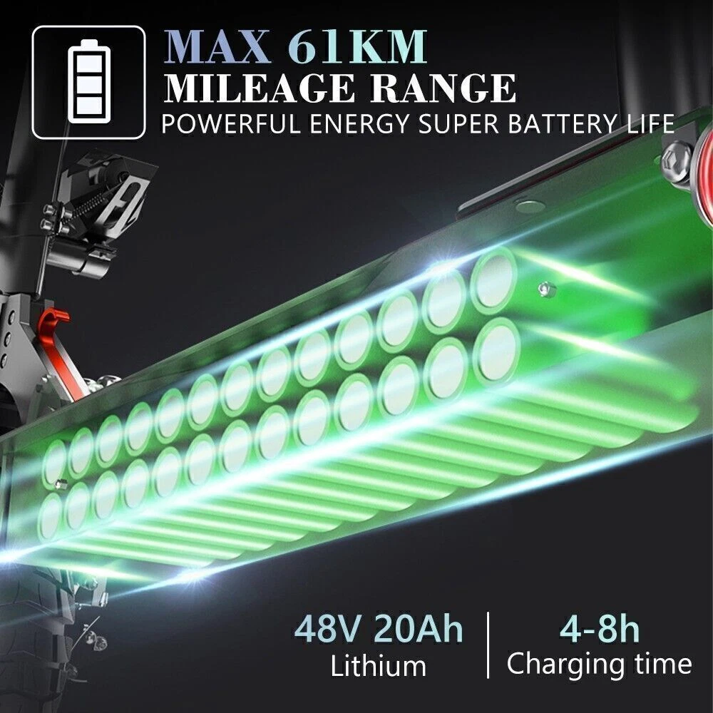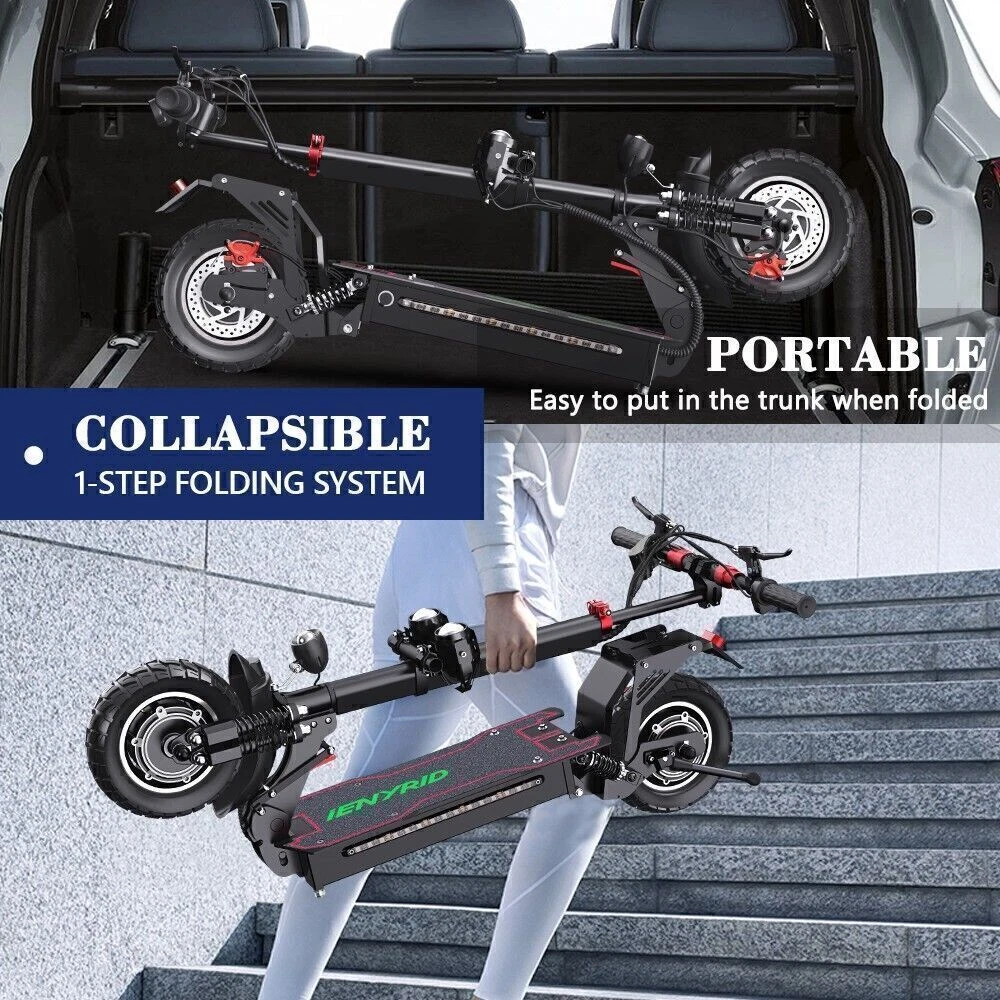2000W Adults Electric Scooters Dual Motors Drive 48V Commute Off Road E-Scooter 2023 Upgraded iENYRID Electric Scooter ES10 Foldable Electric Scooter comes with a 960Wh (48V 20Ah) battery assisting 25-38 miles cruising range. ES10 becomes an excellent choice for high-quality and comfortable riding. It is suitable for commuting to work, shopping in supermarkets, mountain cross-country and traveling. Powerful Motor & Long Lasting Battery ES10 electric scooters f With powerful Dual 1000W Motors, detailed parts, detachable seat and foldable design,, brings faster acceleration and climbing ability to this electric scooter, which can reach 35 mph max and max 30°climbing angle. Comfortable Commuting IENYRID ES10 adult off road electric scooter comes with upgraded 10-inch off-road tires and front and rear dual suspension to ensure max comfort even on bumpy roads. Also, the aviation-grade aluminum frame is stronger and lighter, which makes the scooter much more elegant to look at and handle as well. And it has a max load of 280 lbs. Foldable Electric Scooter Easy to fold and carry, carry it on public transportation or store it in your car to get to wherever you want. Dynamic, Easy storage in car trunks and other compact spaces, occupying little space and suitable for travel and transportation commute. IPX5 Super Waterproof & LED Intelligent Lighting System The waterproof frame and deck are tightly sealed against water, accredited with an IPX5 ingress protection rating painting. The head of the e scooter is equipped with three LED lights with different functions to ensure safe and worry-free riding at night. Specification: Type: Electric Scooter for Adults Model: IE - ES10 Motor: 2000W Battery specification: 48V 20AH Charger specification: Input AC100-240V, output 54.6V 2A Max aviation plug Controller specification: DC48V/36A Charging time: 4-8 hours Drive mode: front and rear wheel dual drive Max Speed: 31MPH Max Range: 38 Miles Max Load: 280 lbs Maximum climbing ability: ≤ 30 ° Tires: 10 in off-road pneumatic tires Frame Material: aluminum alloy Braking method (front/rear): mechanical braking Front shock absorber: Yes Rear shock absorber: Yes Front headlights: integrated with horn Tail lights: Yes Edge light: Yes Brake lights: Yes Net Weight: 66 lb Front and rear tire pressure: 50 ± 10psi Product Size (L x H x W): 47.24 x 49.6 x 23.62 in (unfolded), 45.67 x 20 x 23.62 inch (folded) Package Contents: 1 x Charger 1 x User Manual 1 x Electric scooter Warning: It is illegal to ride electric scooters on public roads (except under very specific circumstances), pavements or cycle paths. They are intended only for use on private land with the owner’s permission