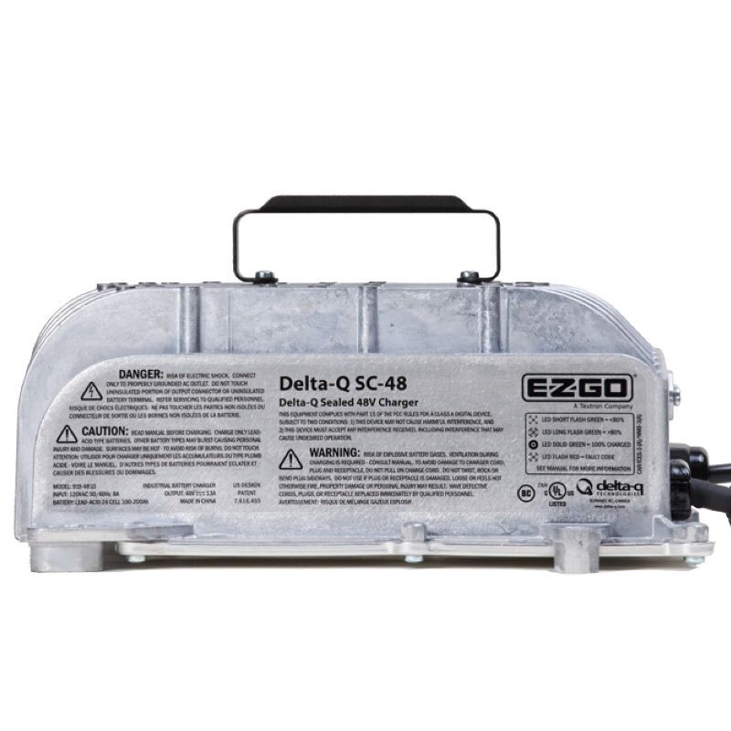 The SC-48 Charger was designed to provide a high level of product reliability, using a sealed die cast enclosure that protects against contaminants entering the charger. Unique in the golf industry, the SC-48 is a high frequency charger that is fully field serviceable, with the DC and AC cords, and internal electronics all serviceable by an approved E-Z-GO technician. Temperature-compensated charging for flooded lead acid batteries helps keep the pack healthy, and the car going for two rounds per day. DC Output - 48V DC Maximum DC output power - 650 W DC output current - 13 A AC input voltage range -110 VAC Efficiency - >90% CEC energy efficiency compliance - Yes Field serviceable internal boards and DC cable by an authorized E-Z-GO service technician Dimensions - 10.4" x 8.8" x 4.2" - 26.4 x x 22.4 x 10.7cm Weight - 7.3 lbs. (3.3 kg) AC input connector - North American plug DC output connector - Custom-designed 3-pin DC paddle, including third pin for temperature-compensated charging Ingress protection rating - IP66 Battery Type - Single temperature-compensated charge profile appropriate for the flooded lead acid batteries used in E-Z-GO fleet golf cars. 3-meter cord Includes charger with 3-Pin 48V connector and instructions Replaces Part # 622416, 622417, 622418, 635669, 635670, 635672, PF11595, PF12672, 632874 Fits E-Z-GO 48V electric models with 3-Pin connector: 2012-2021 Express S4, L4 2008-2024 RXV 2012-2021 Shuttle 4X 2011-2012 ST Sport II 2012-2016 Terrain 250 2010-2022 TXT (Excludes Lithium ELiTE models) Fits Cushman 48V electric models with 3-Pin connector: 2012-2022 Hauler 800, 800X 2011-2012 MPT 800 2015-2022 Shuttle 2+2 (Excludes Lithium ELiTE models)